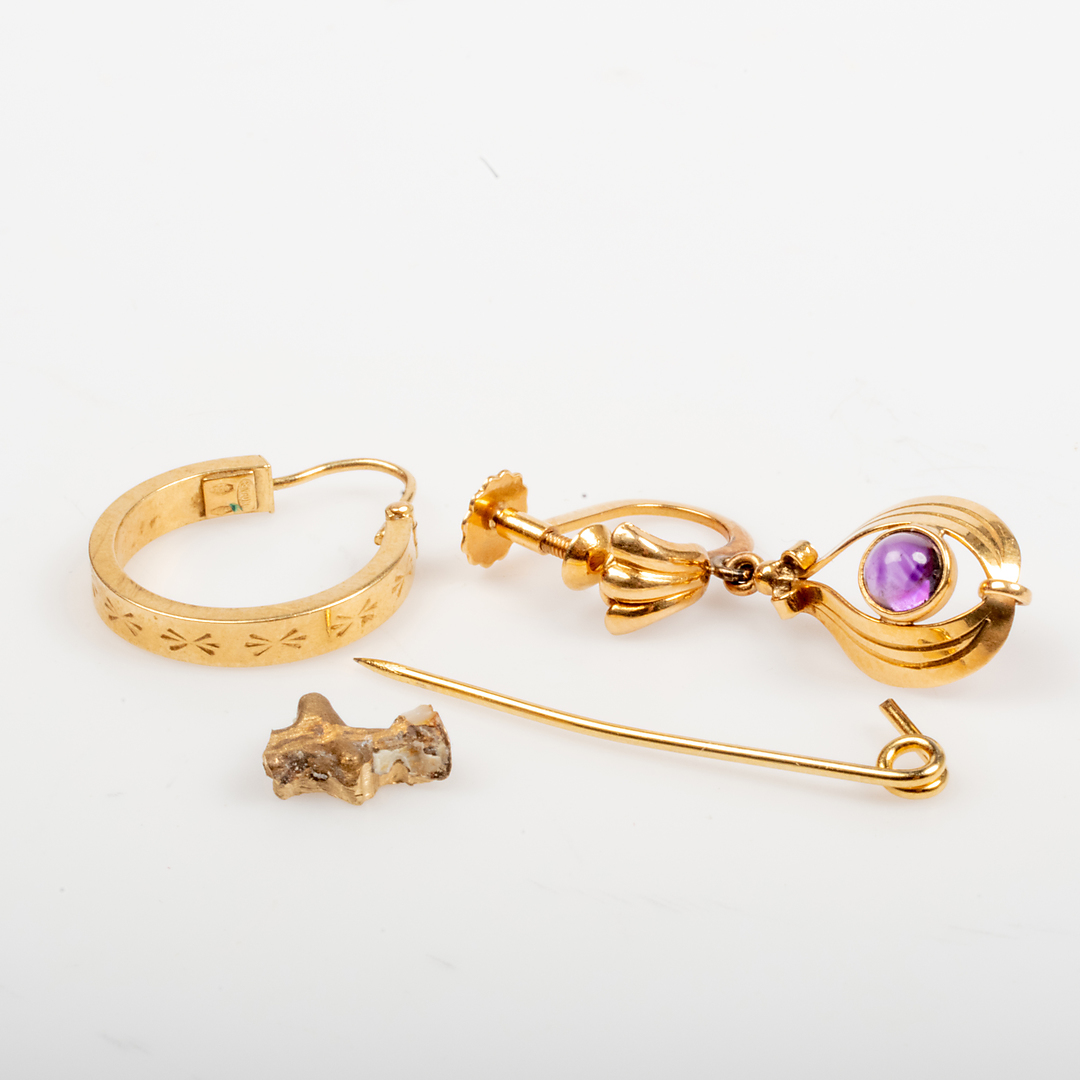 1010306. GULD TAND, ULIGE ØRERINGE MM., guld.