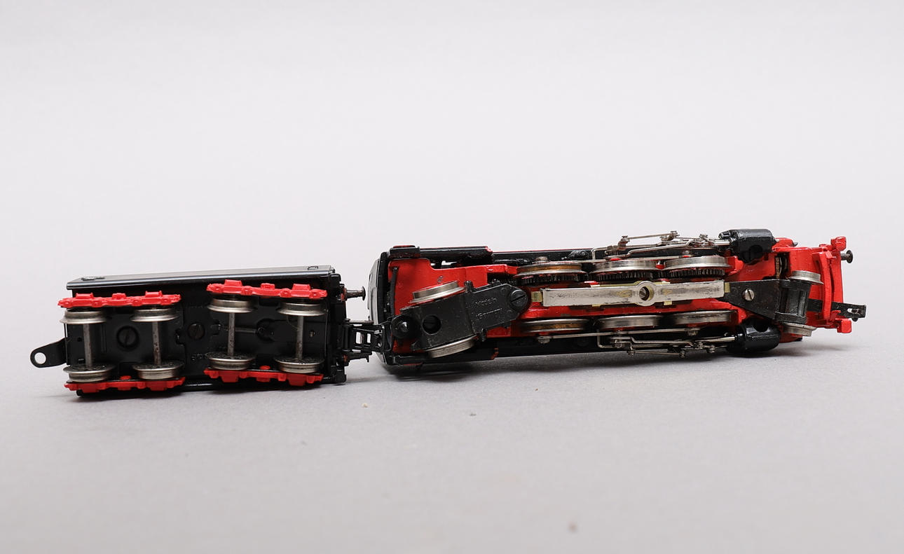 Lokomotivets længde ca 15,5 cm, stempelvognens længde ca 11 cm.