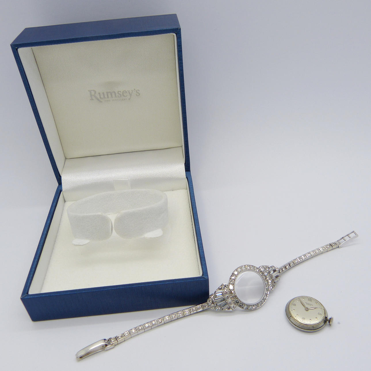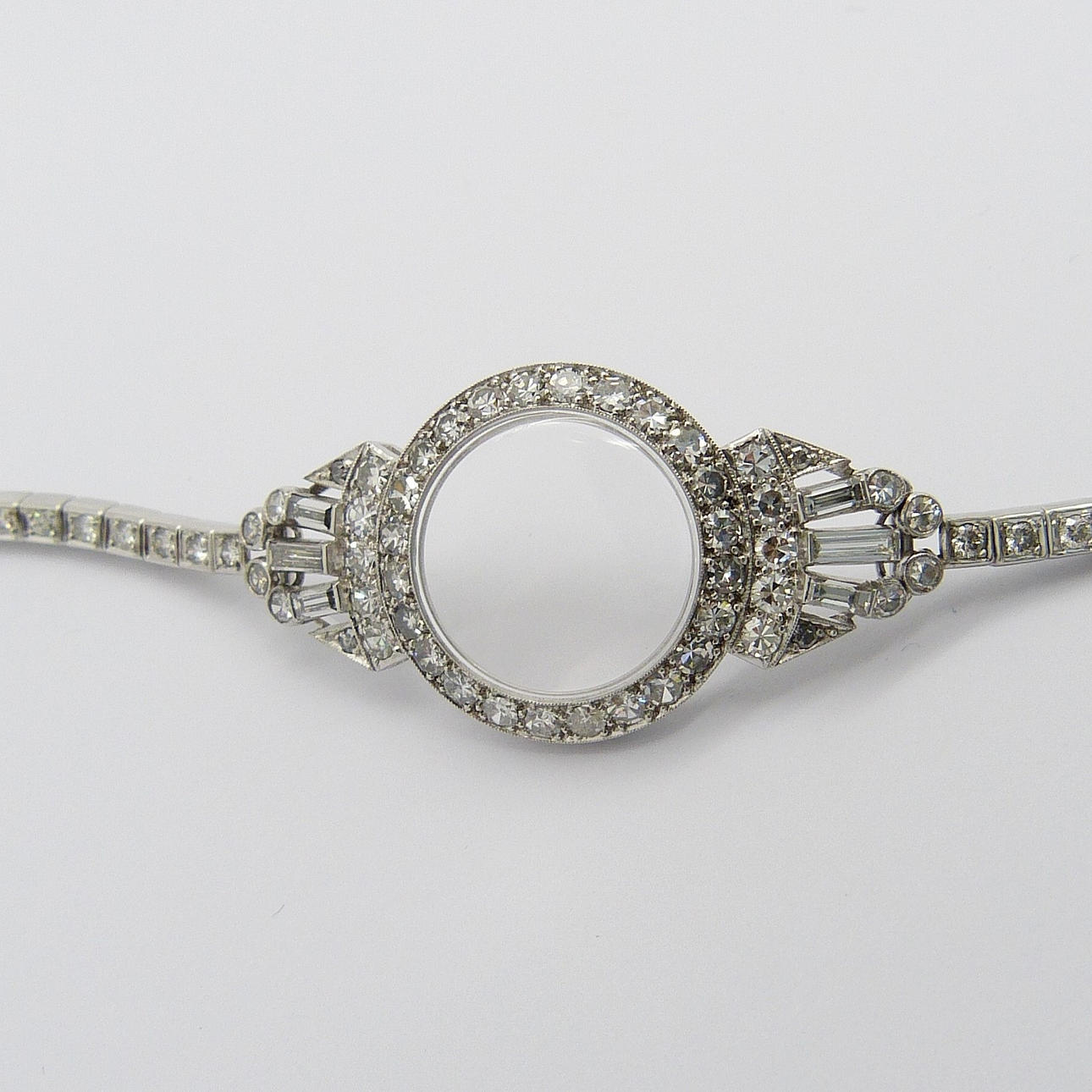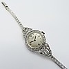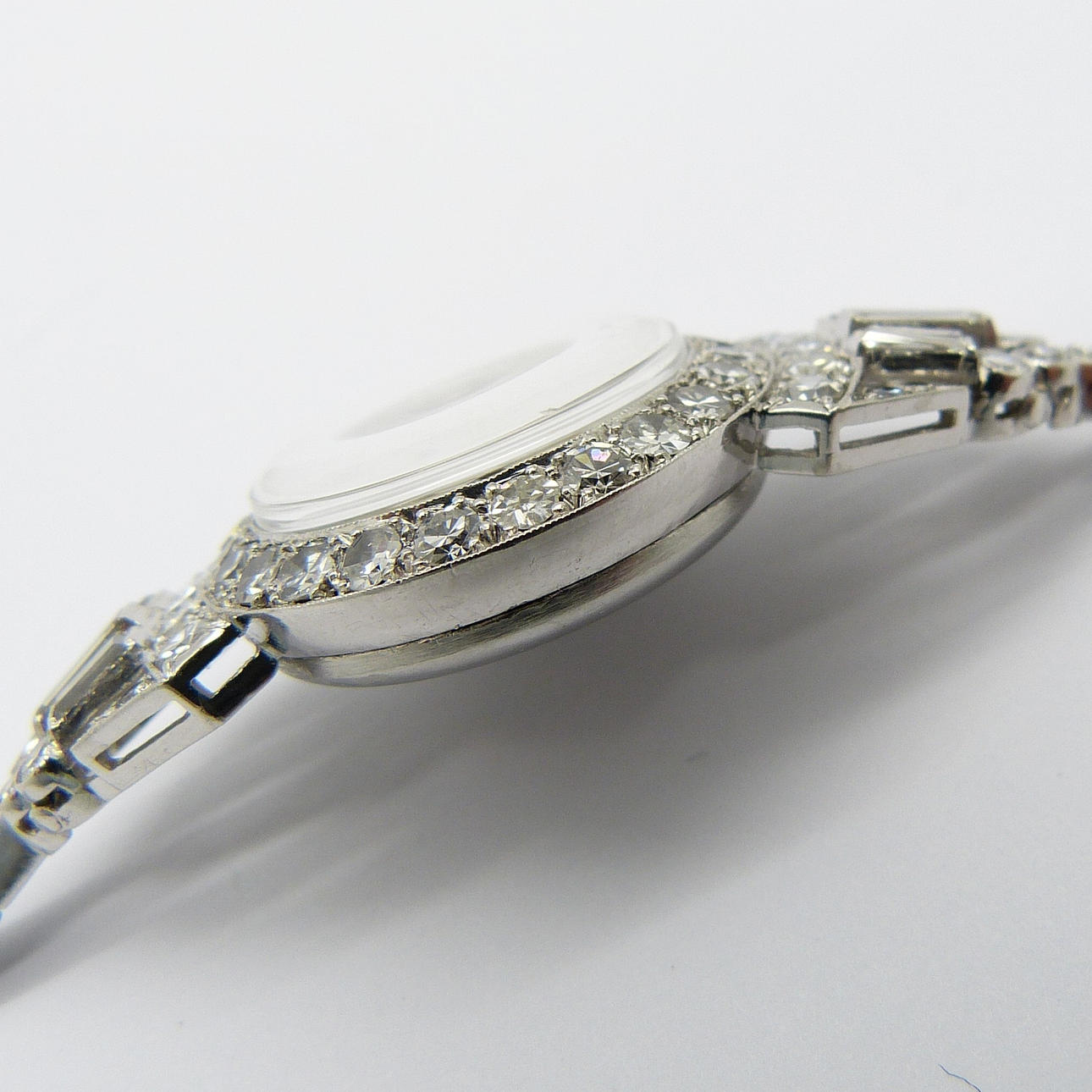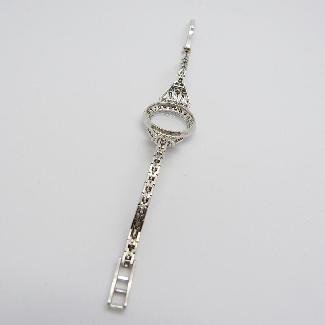 Dette ur er prydet med ca. 4,30 ct diamanter i alt, inklusive: • 24 x runde, otte-slebne diamanter sat omkring en sølvfarvet flade • 22 x otte-slebne diamanter og 6 x graduerede baguette-slebne diamanter sat i skuldrene • 28 x brillantslebne diamanter sat i armbåndet Armbåndet på dette ur er hvidguld (testet som 18k).