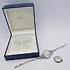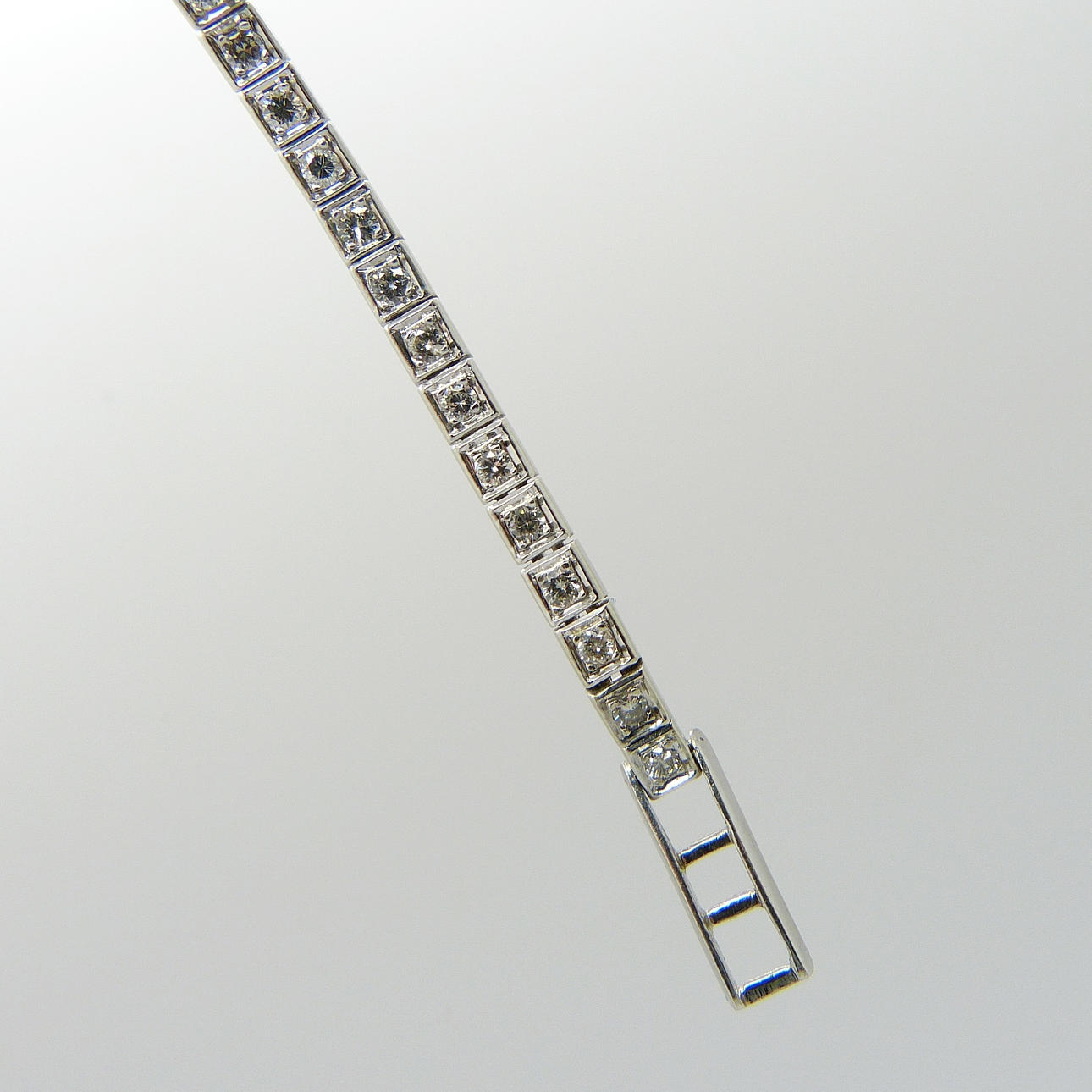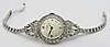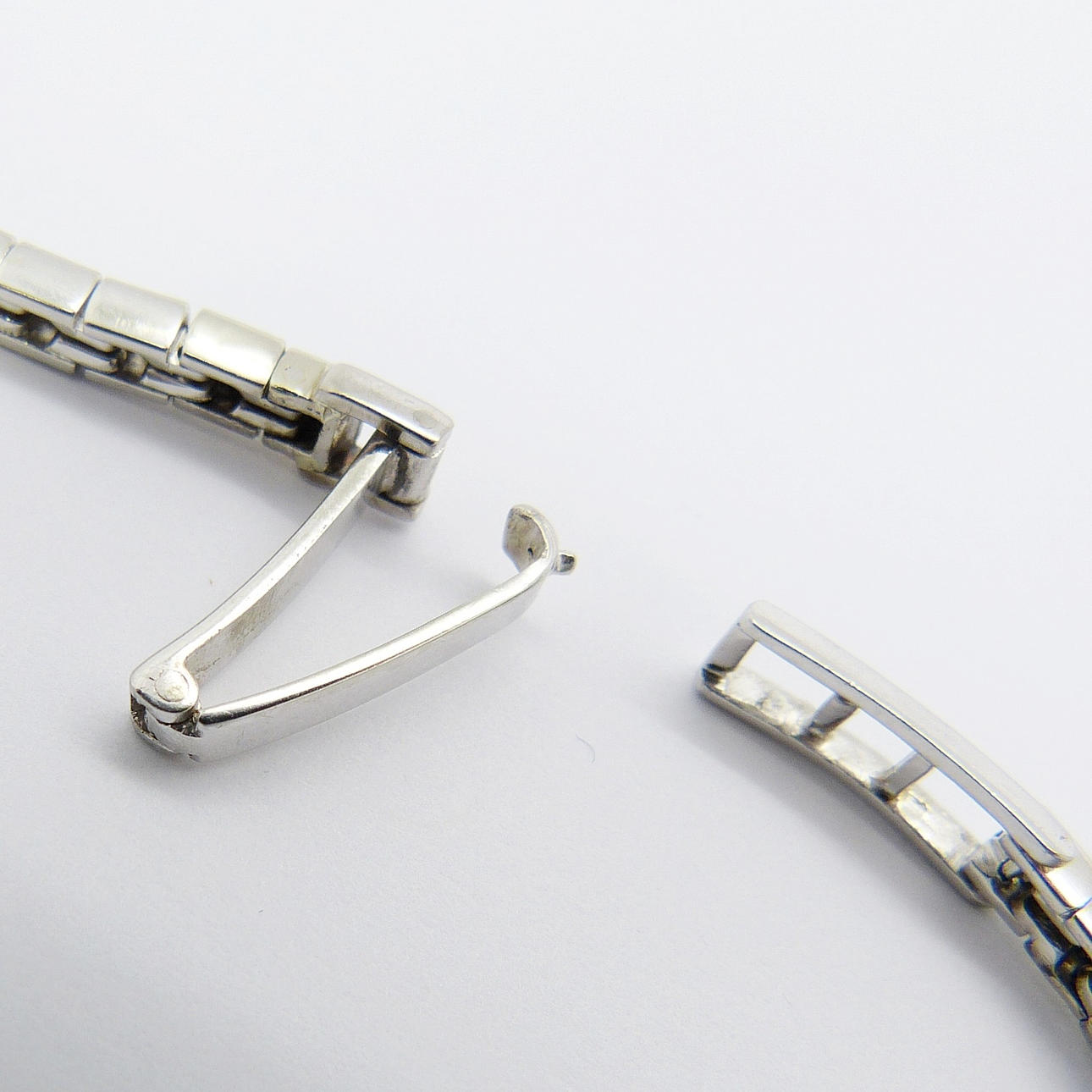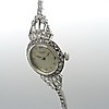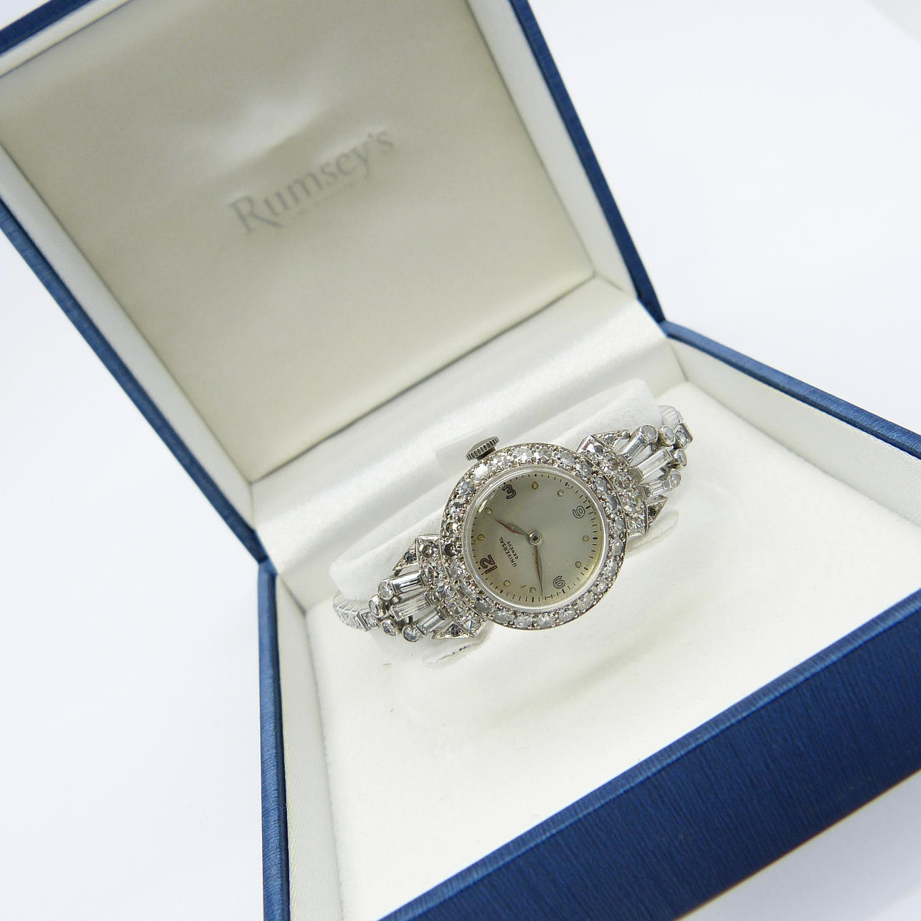 Dette ur er prydet med ca. 4,30 ct diamanter i alt, inklusive: • 24 x runde, otte-slebne diamanter sat omkring en sølvfarvet flade • 22 x otte-slebne diamanter og 6 x graduerede baguette-slebne diamanter sat i skuldrene • 28 x brillantslebne diamanter sat i armbåndet Armbåndet på dette ur er hvidguld (testet som 18k).