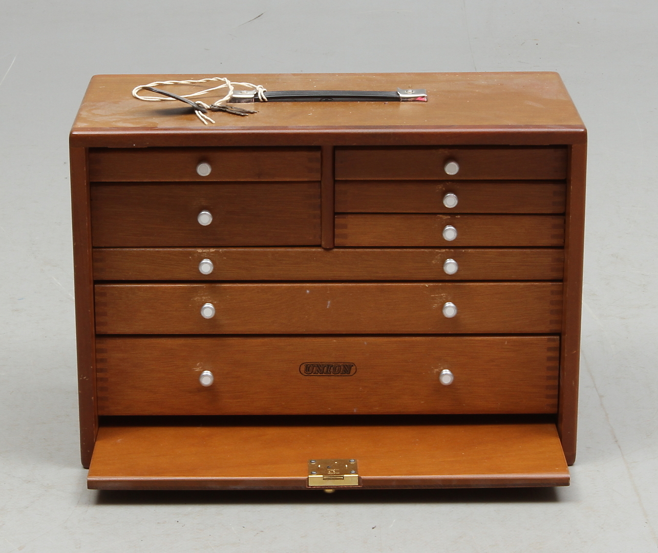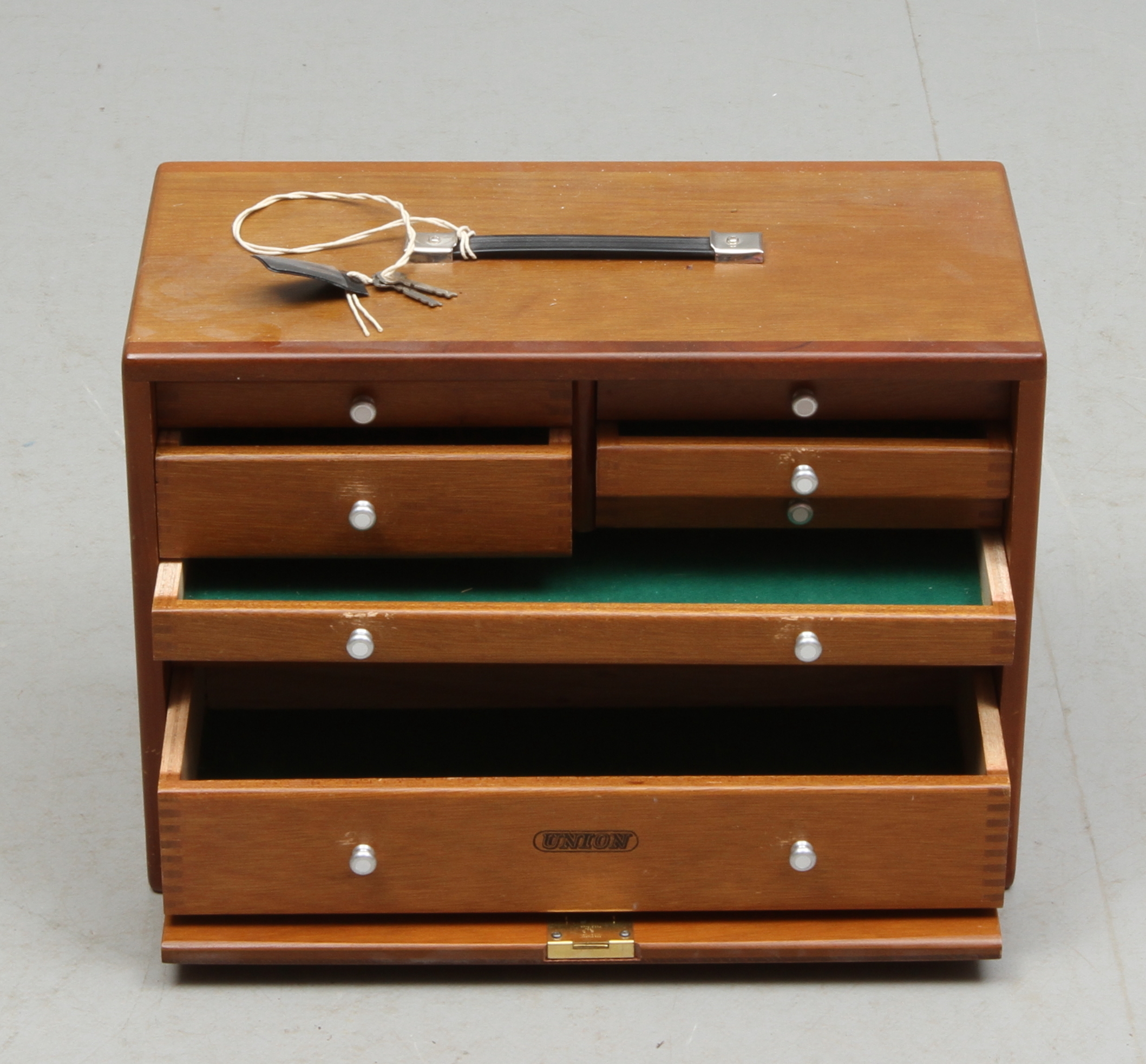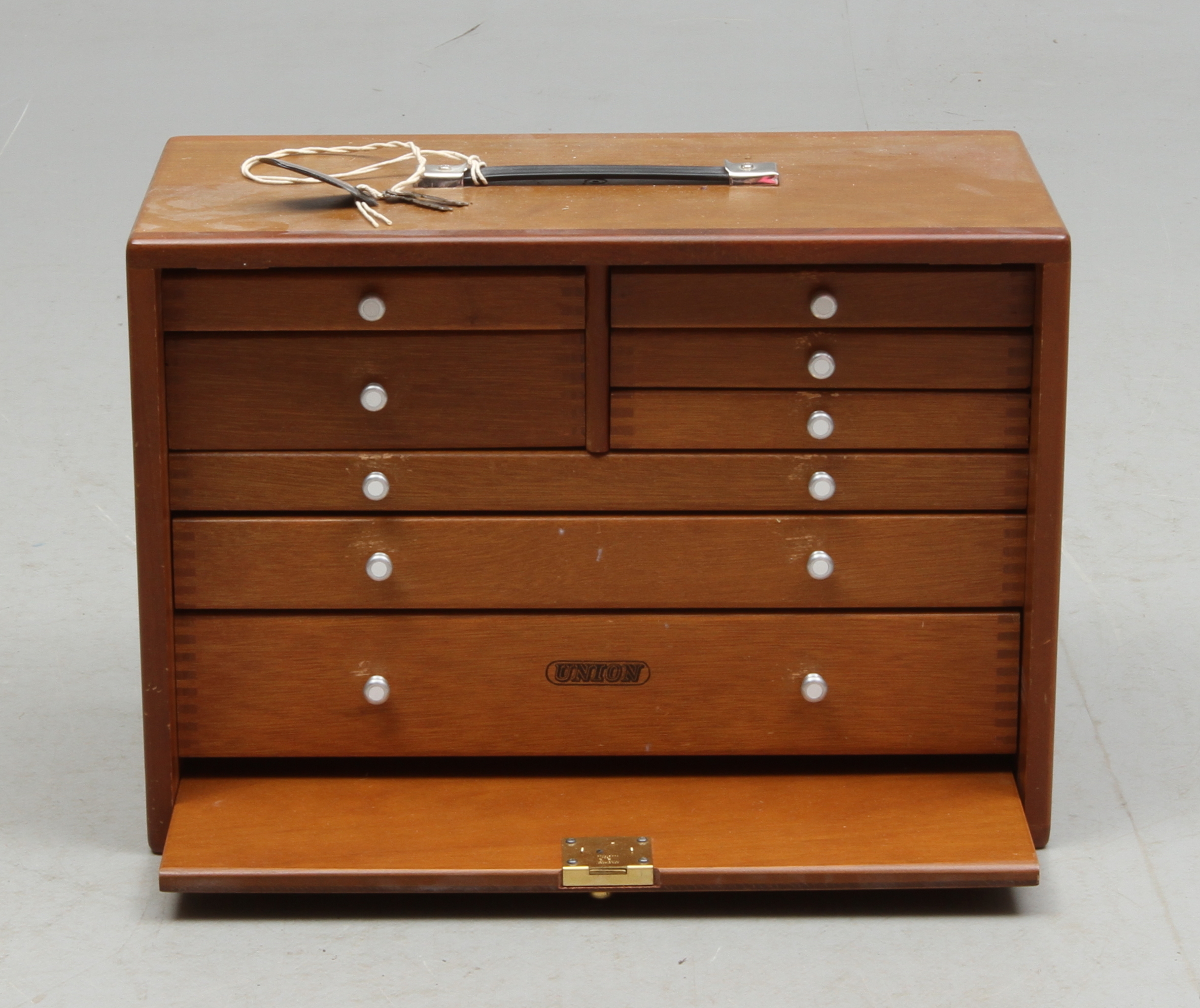 102823. SCHATULL, med skuffeinteriør, 20. århundrede.