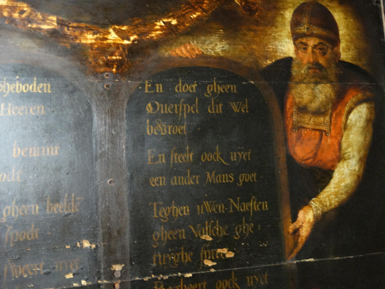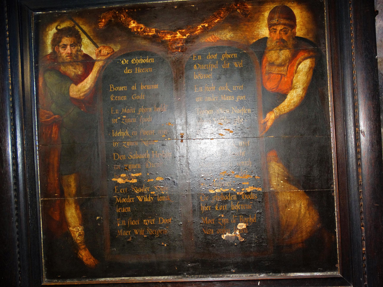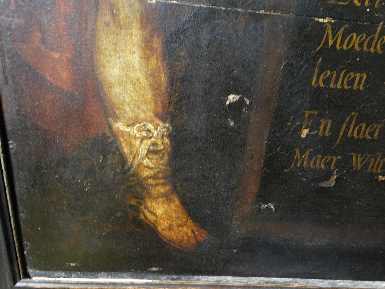 Fremstilling af en plakette med inskription på flamsk/hollandsk båret af to mænd i middelalderdragt, olie på panel, indrammet, ca. 98 x 91 / 127 x 119, omkring 1650.