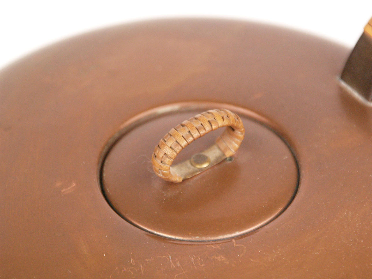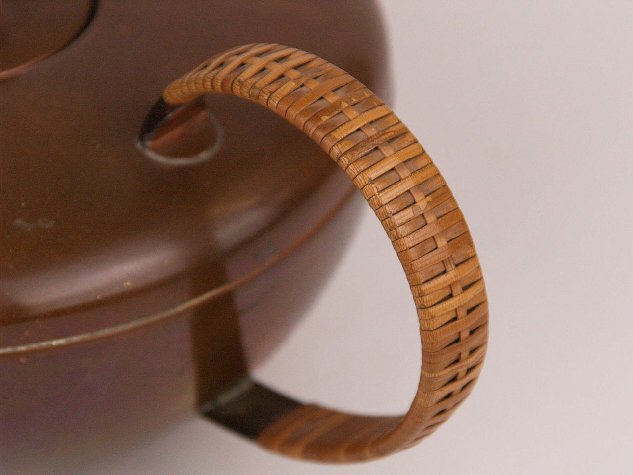 Tekande - lavet i Art Déco/Bauhaus stil, kobber, fortinnet indvendig, halvkugleformet med lang tud og indstøbt fladt låg med flettet ringknop, remhåndtag også med raffia-indpakning, H ca. 11 cm.