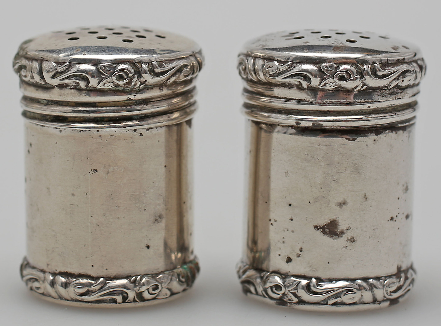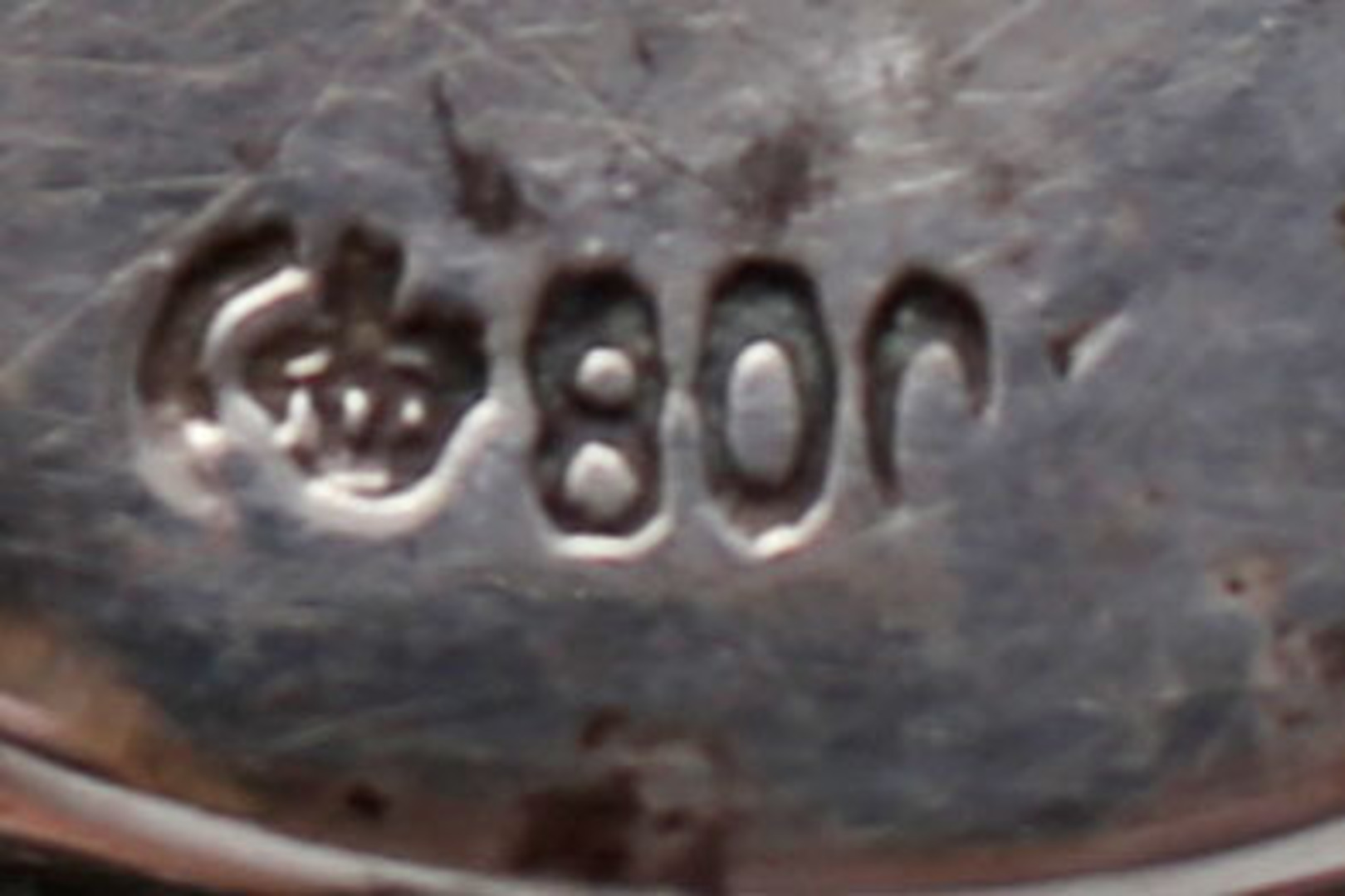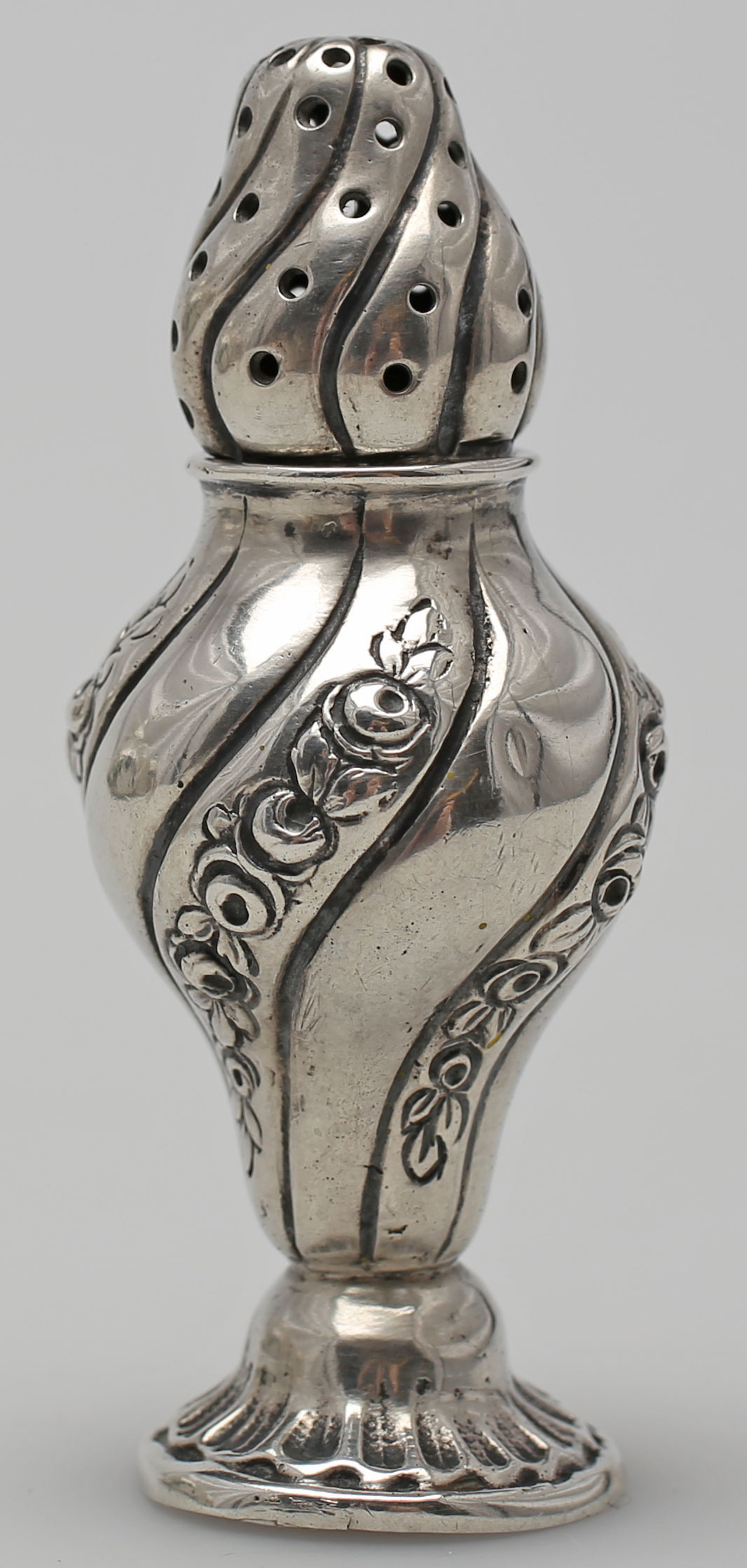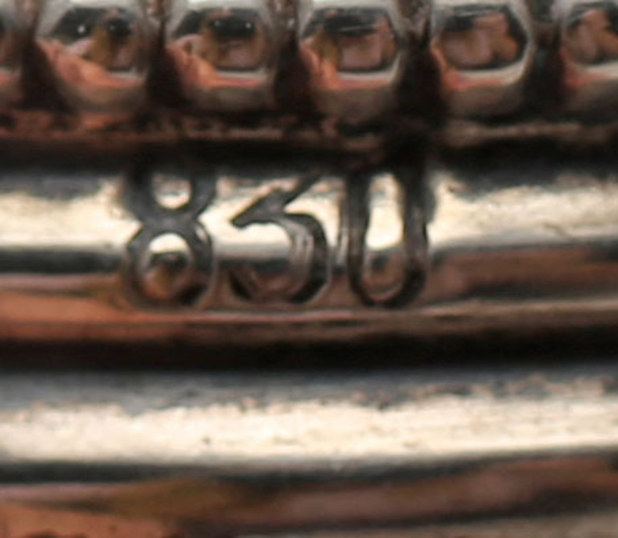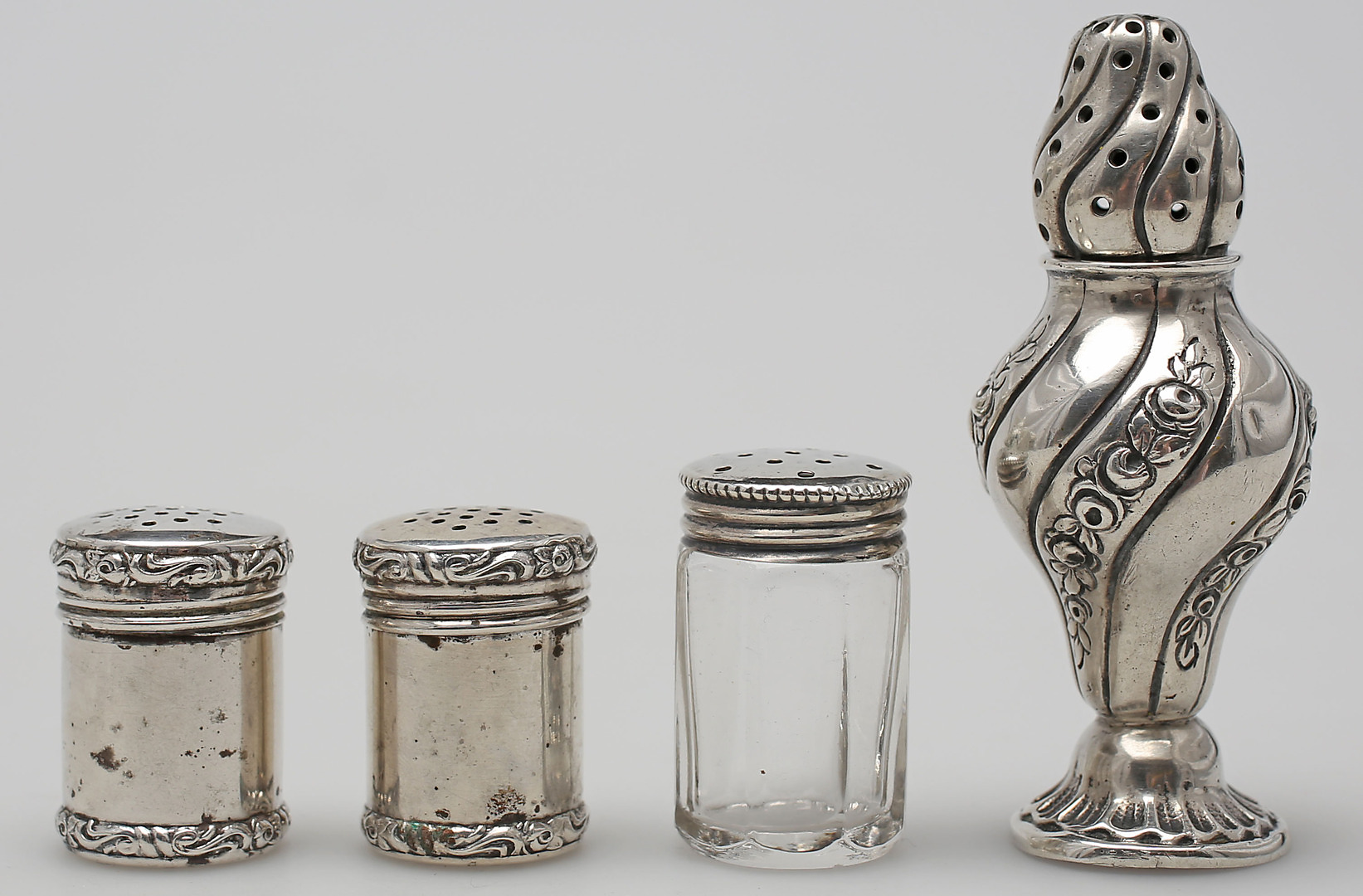 103862. DISTRIBUTØR OG STØD, 3 + 1, sølv, 20. århundrede.