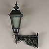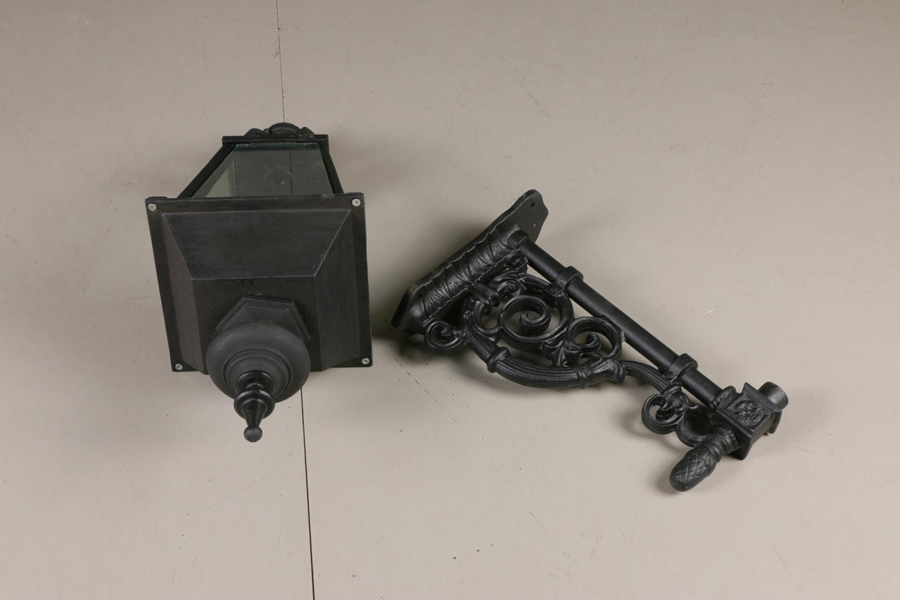 Lanterne på vægbeslag, i støbejern, mat sort Beslag med længde 50, højde 33 cm Lanterne med højde 75 cm.