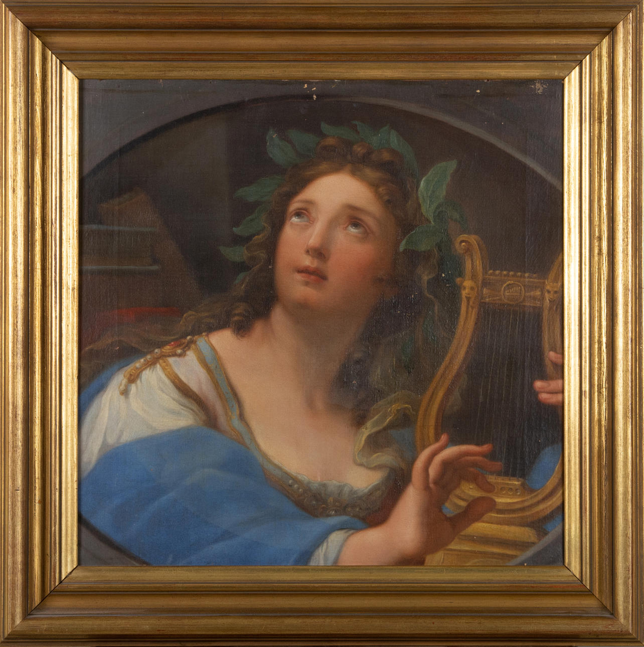 1051069. OIDENTIFIERAD KONSTNÄR. Kvinde med lyre, olietryk.