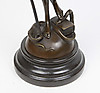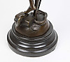 Støbt bronze, afbildning af Retfærdigheden med hendes attributter stående på en halvkugleformet sokkel, med støbeplade, nummer og signatur Mayer, på rund sort marmorbund, total højde ca. 41 cm.