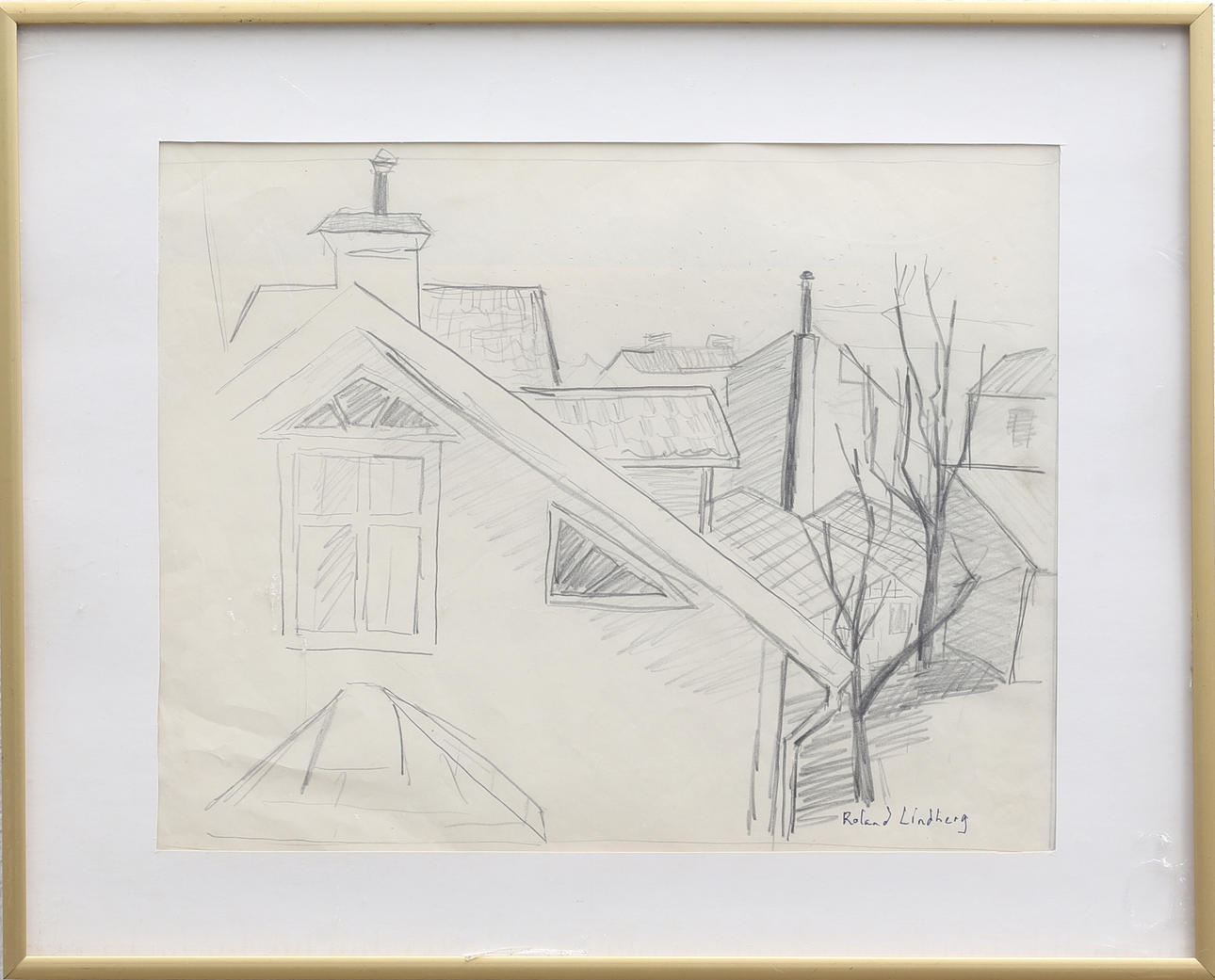Hustag, blyant, billedmål, 30 x 38 cm.
