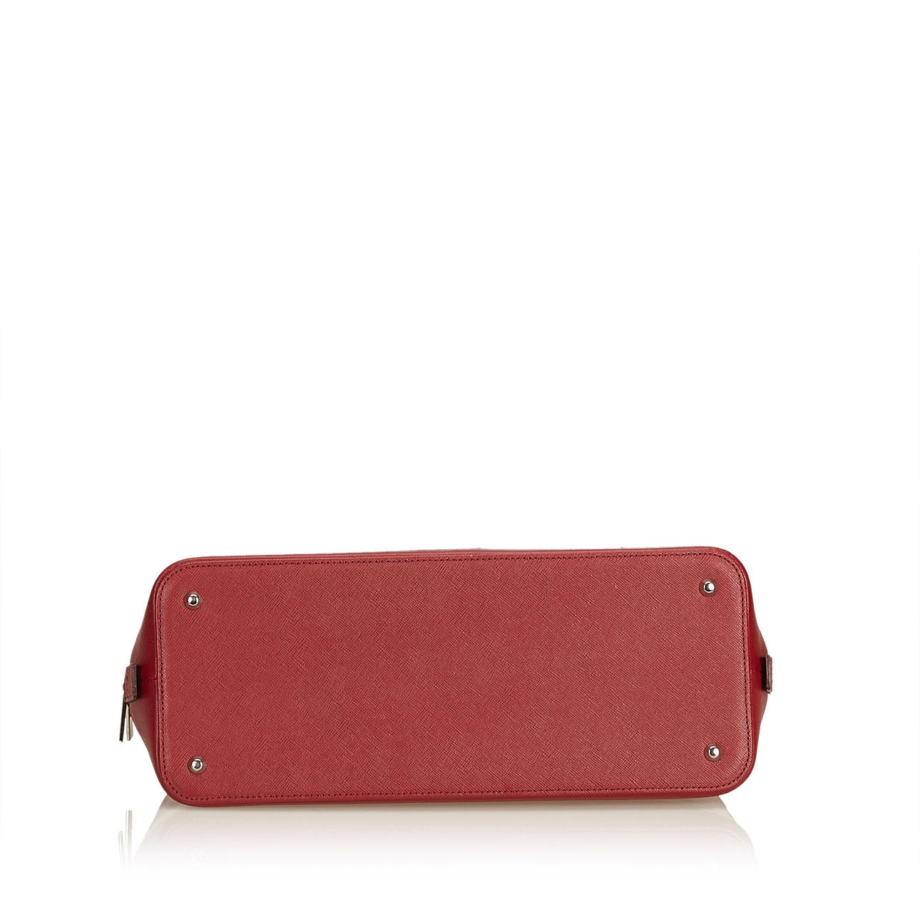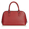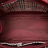 Læder. Lukkes med lynlås. Indvendigt rum hvoraf det ene har lynlås. Taskens højde eksklusiv hank ca 21 cm. Bredde ca 32 cm. Dybde ca 13 cm.