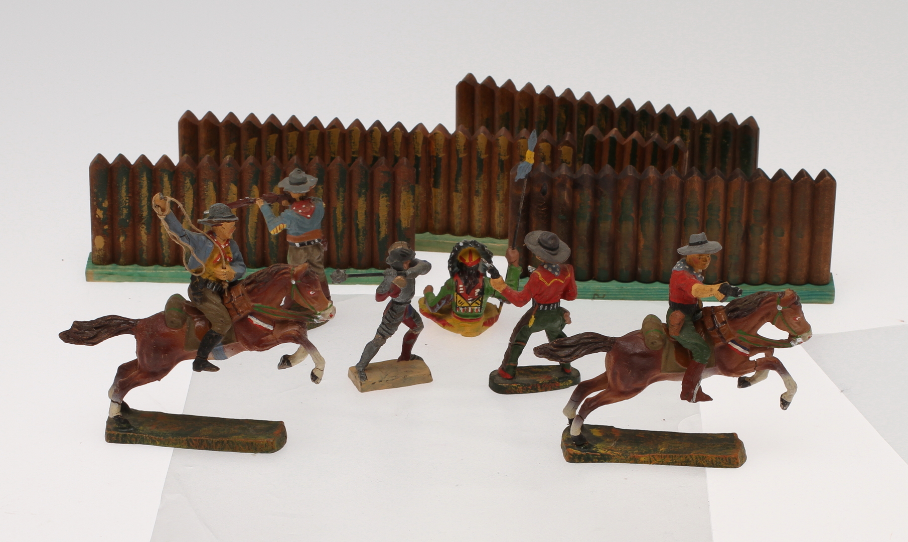 10676. ELASTOLIN 5 vestlige figurer og LINEOL en ridder.