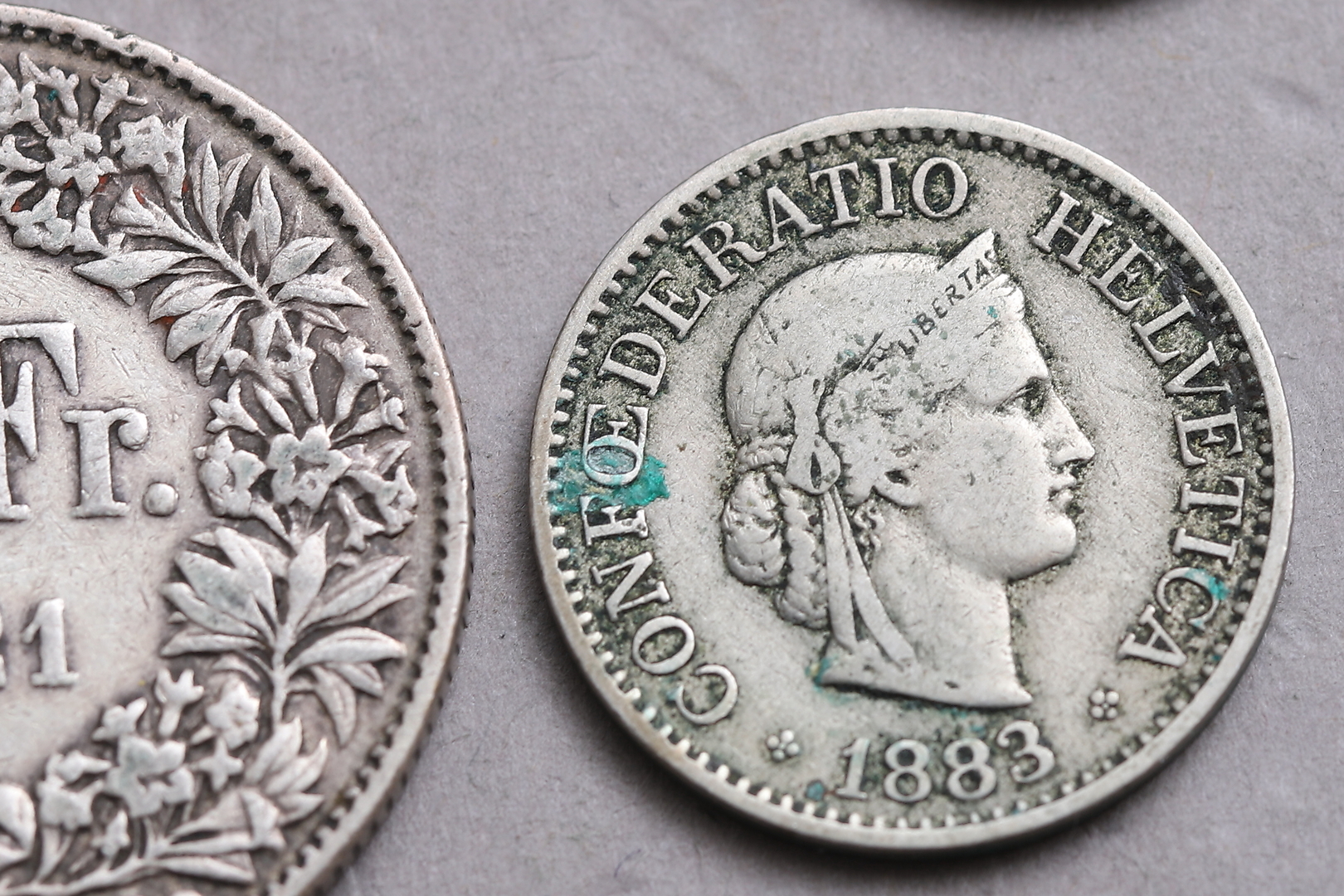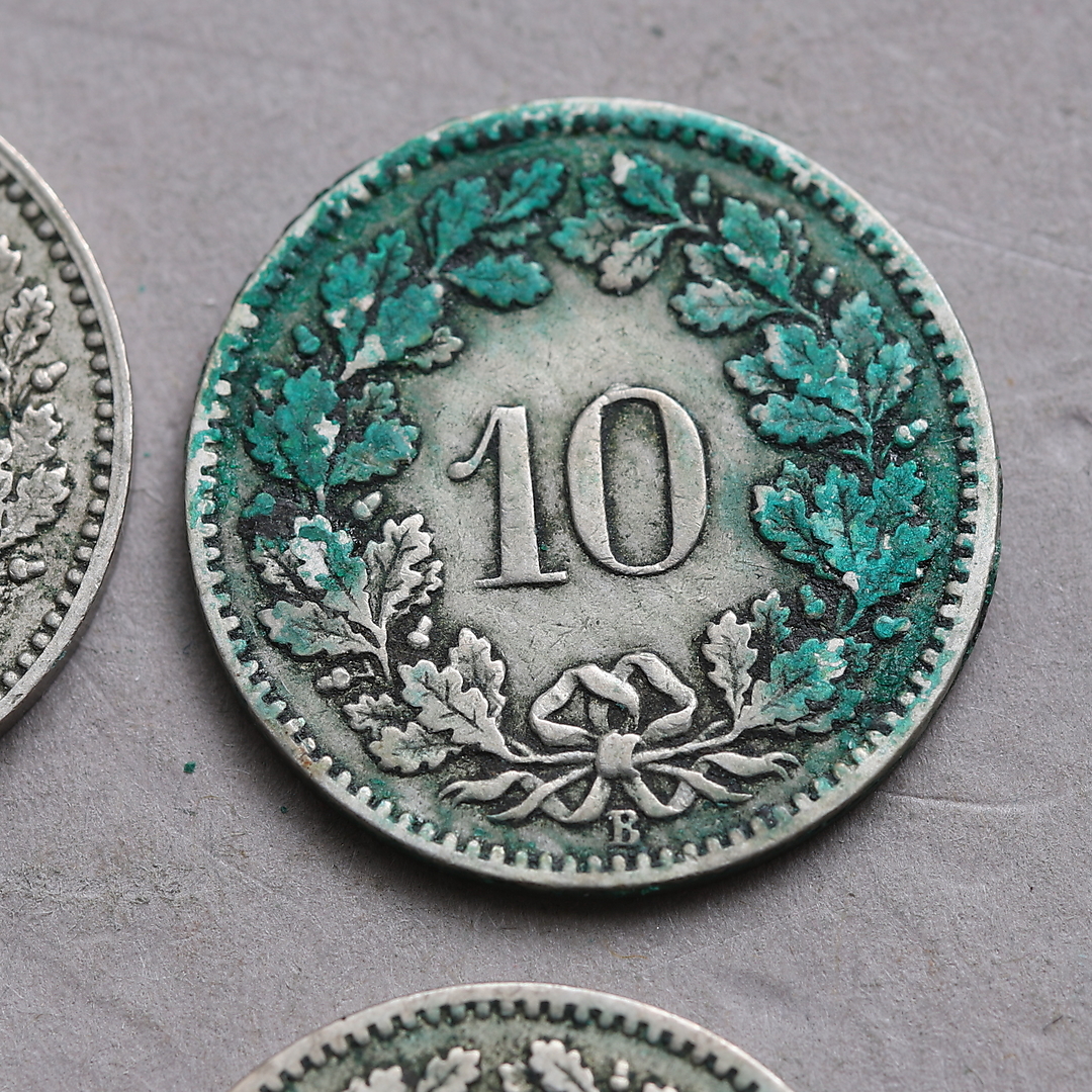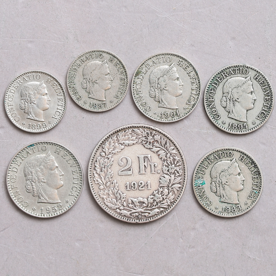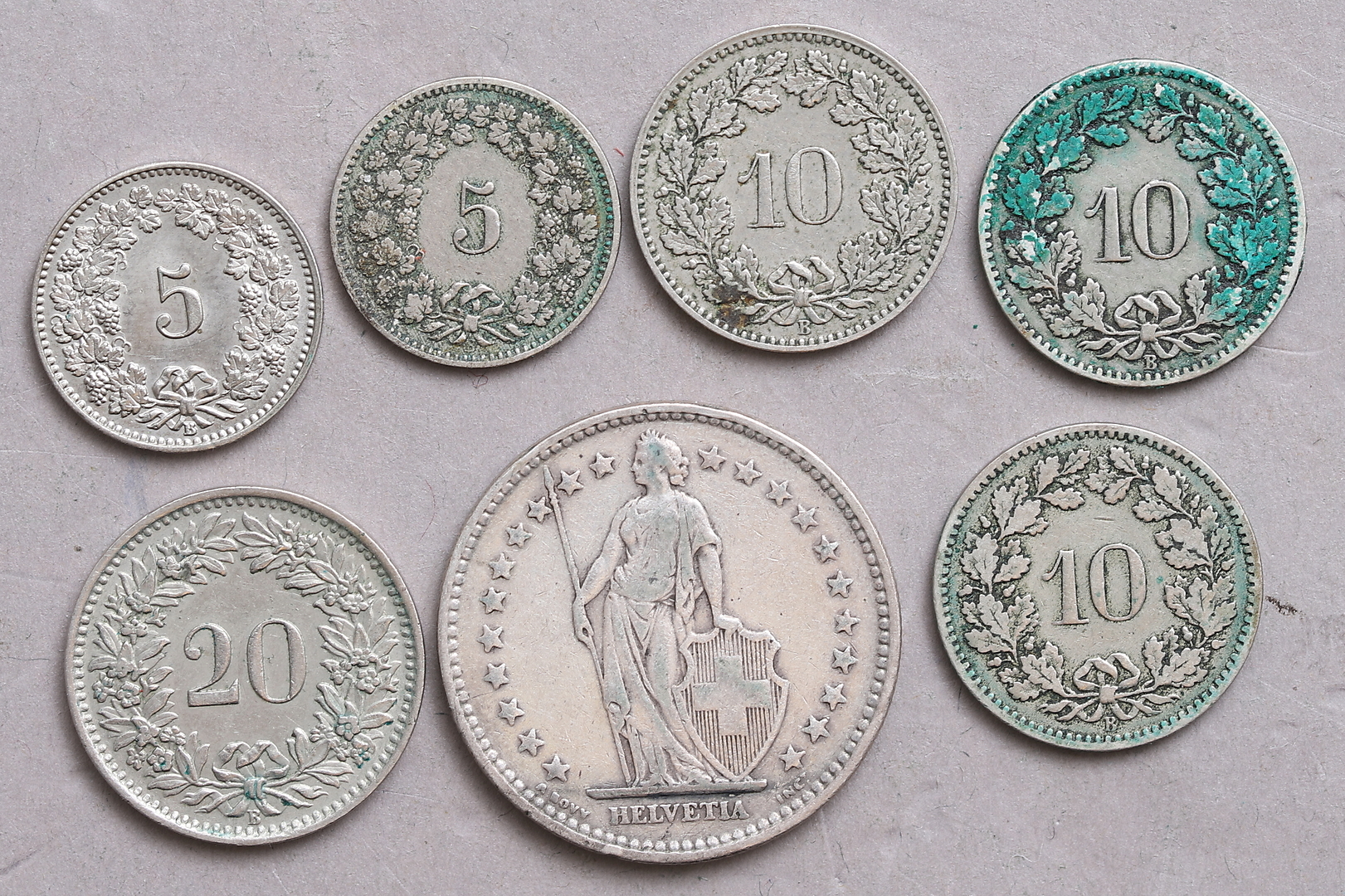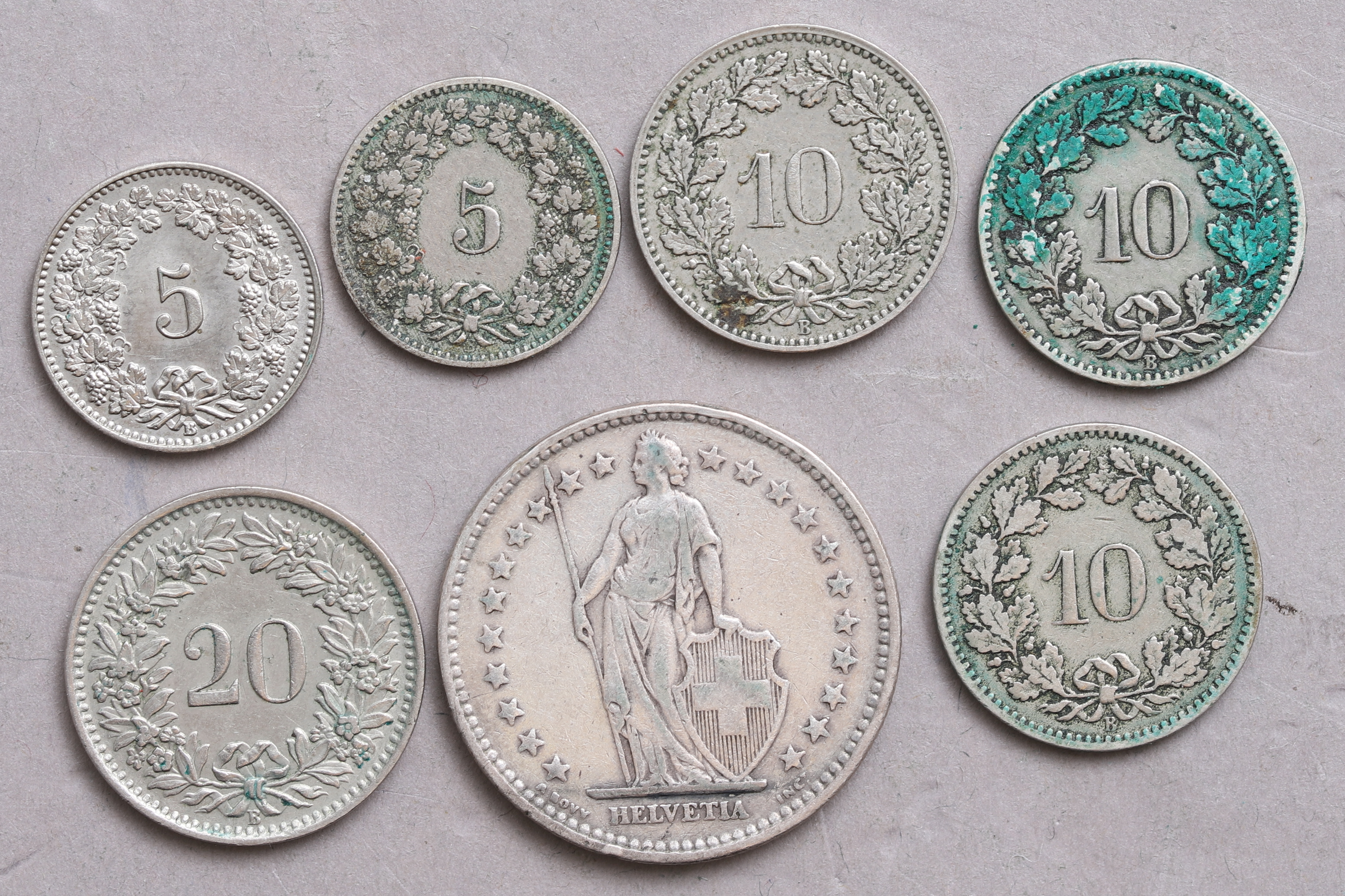 1070964. MØNTER, 7 stk., Schweiz, 18/1900-tallet.