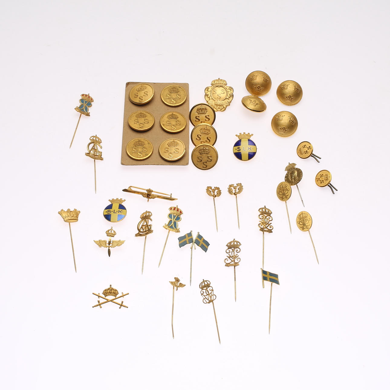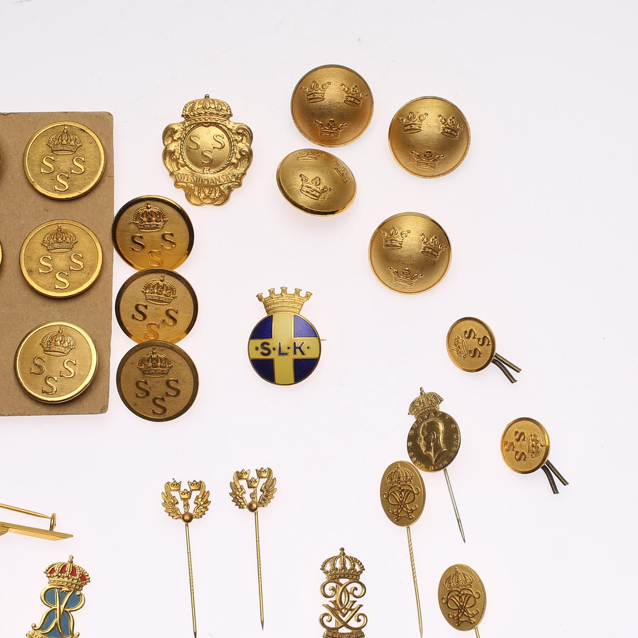 1090002. KNAPPER OG NÅL, messing, Sverige.