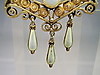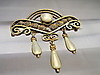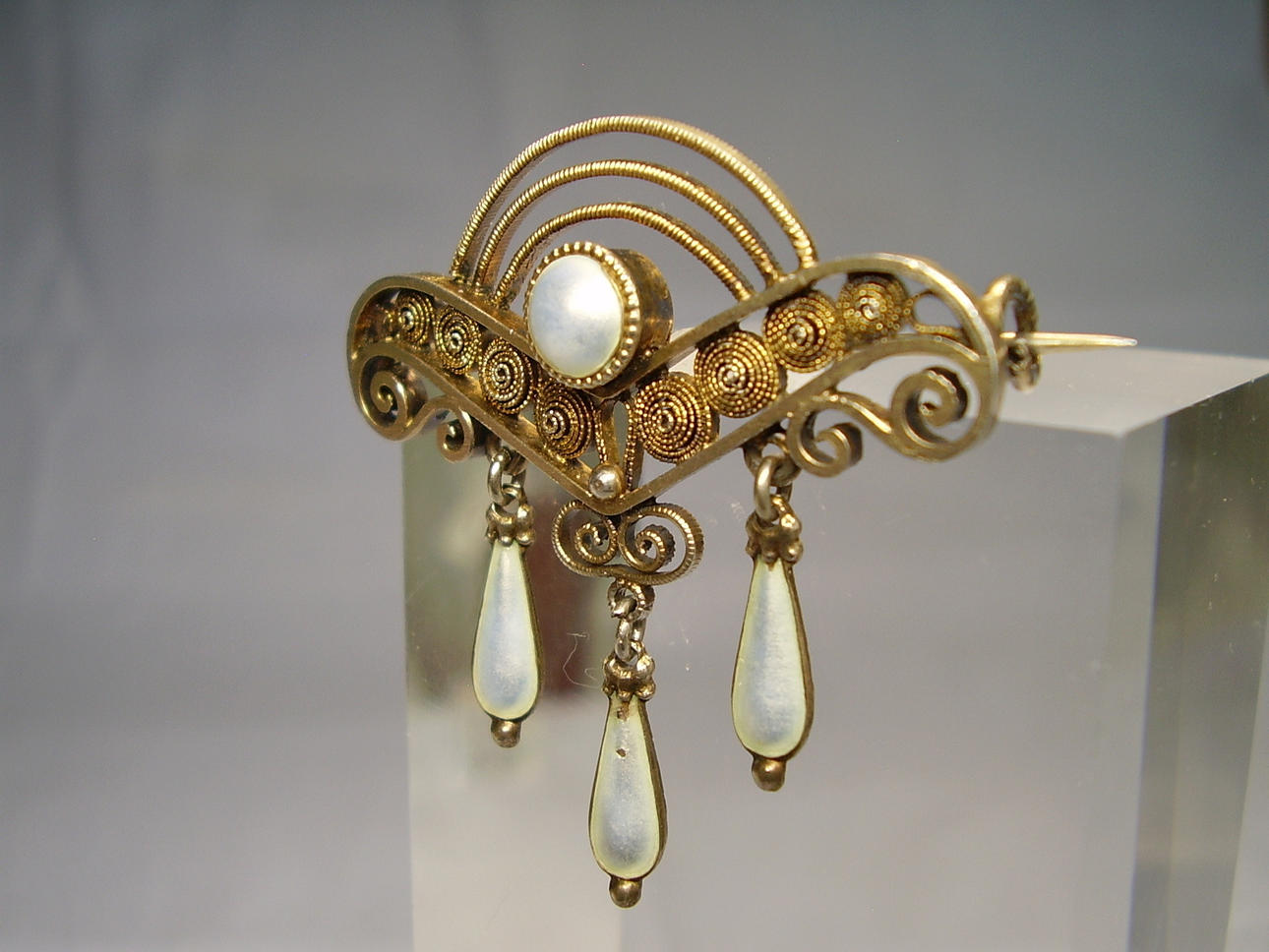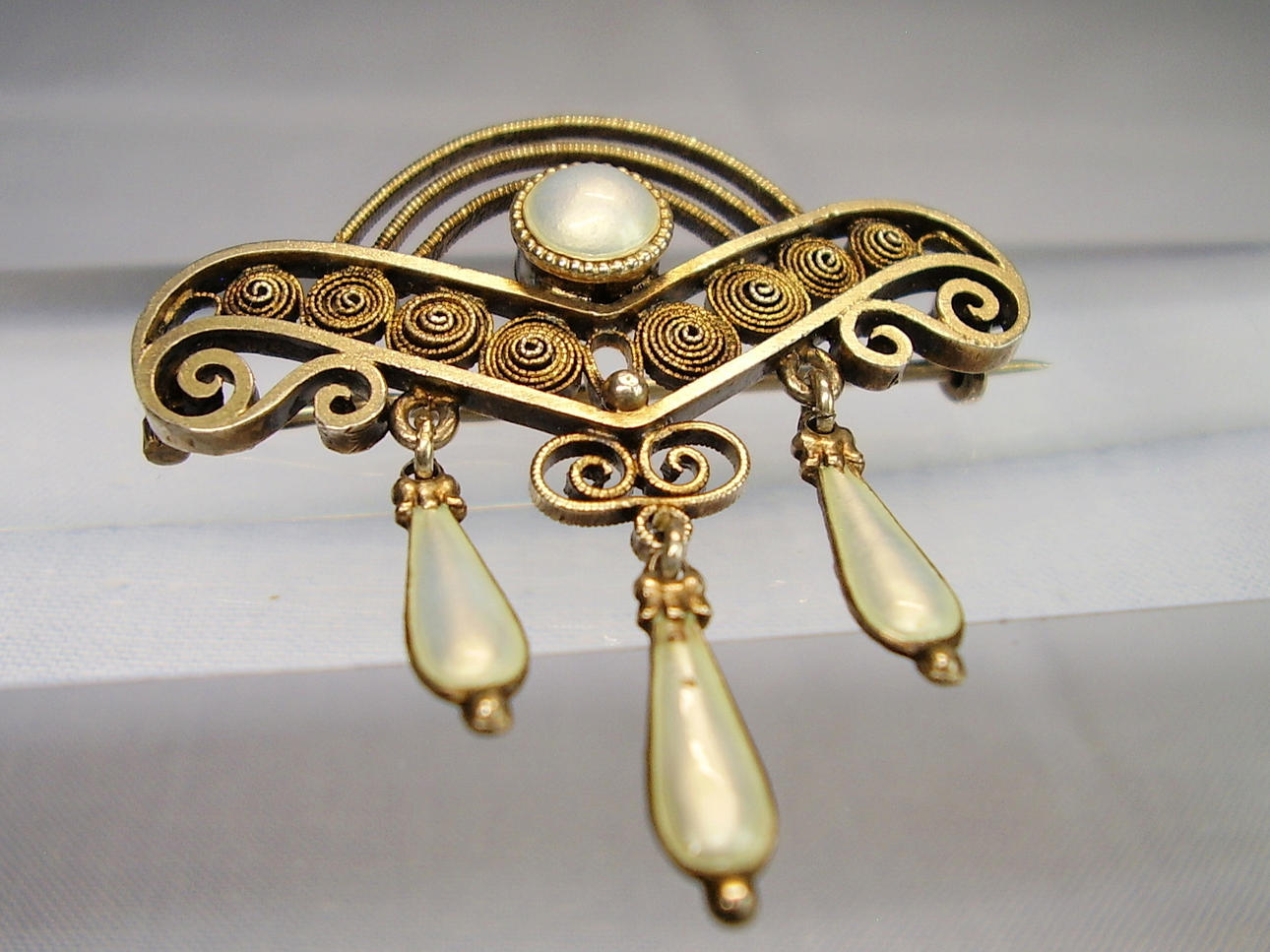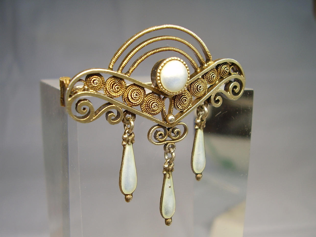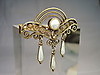 Den håndlavede broche er designet i den klassiske jugendstil med de fineste filigranmønstre. Derudover er dråbeformede ophæng lavet af perlemor emalje og en halvperle sat i en Mille håndtagsramme.