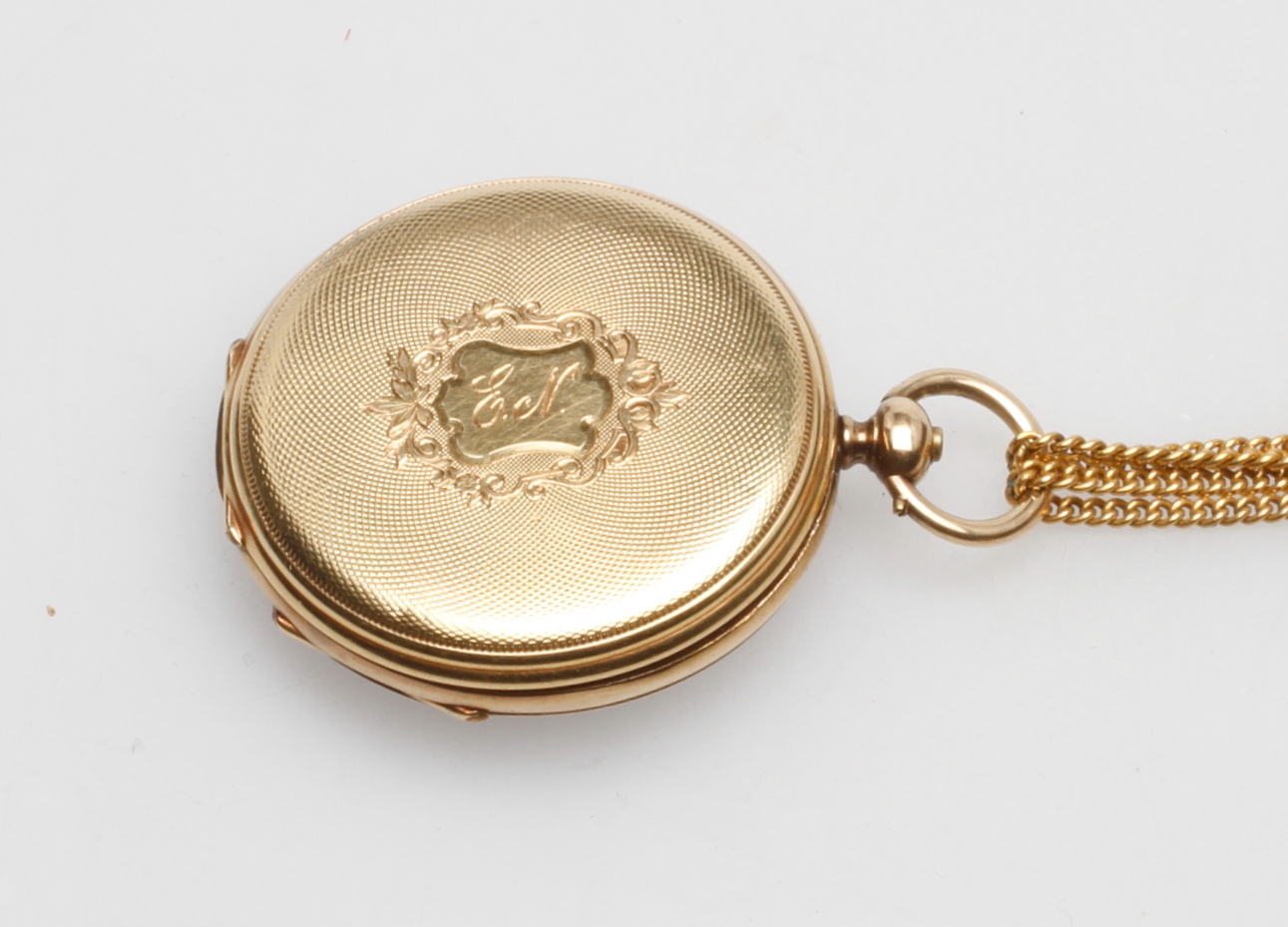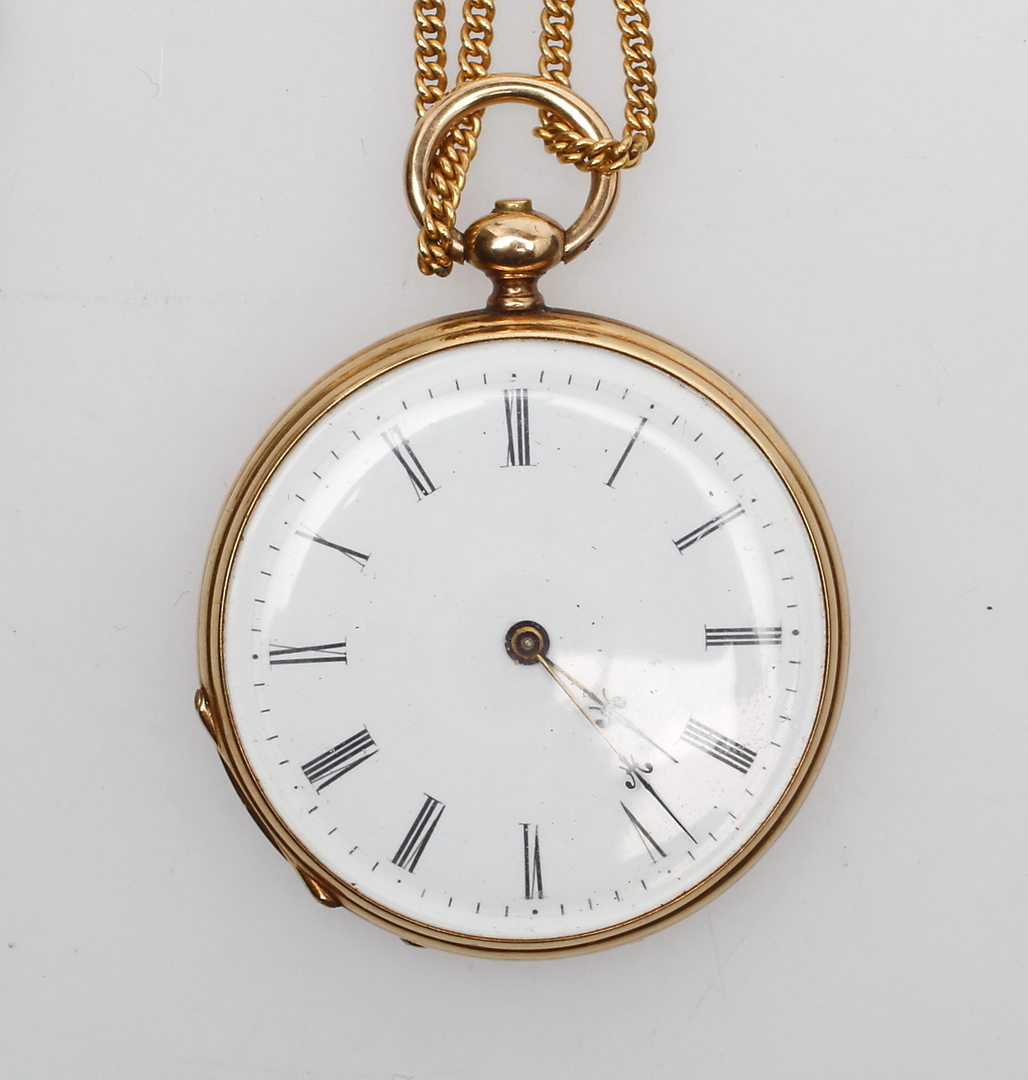 110229. LOMMEUR med KÆDE, 18k guld.
