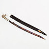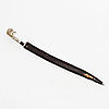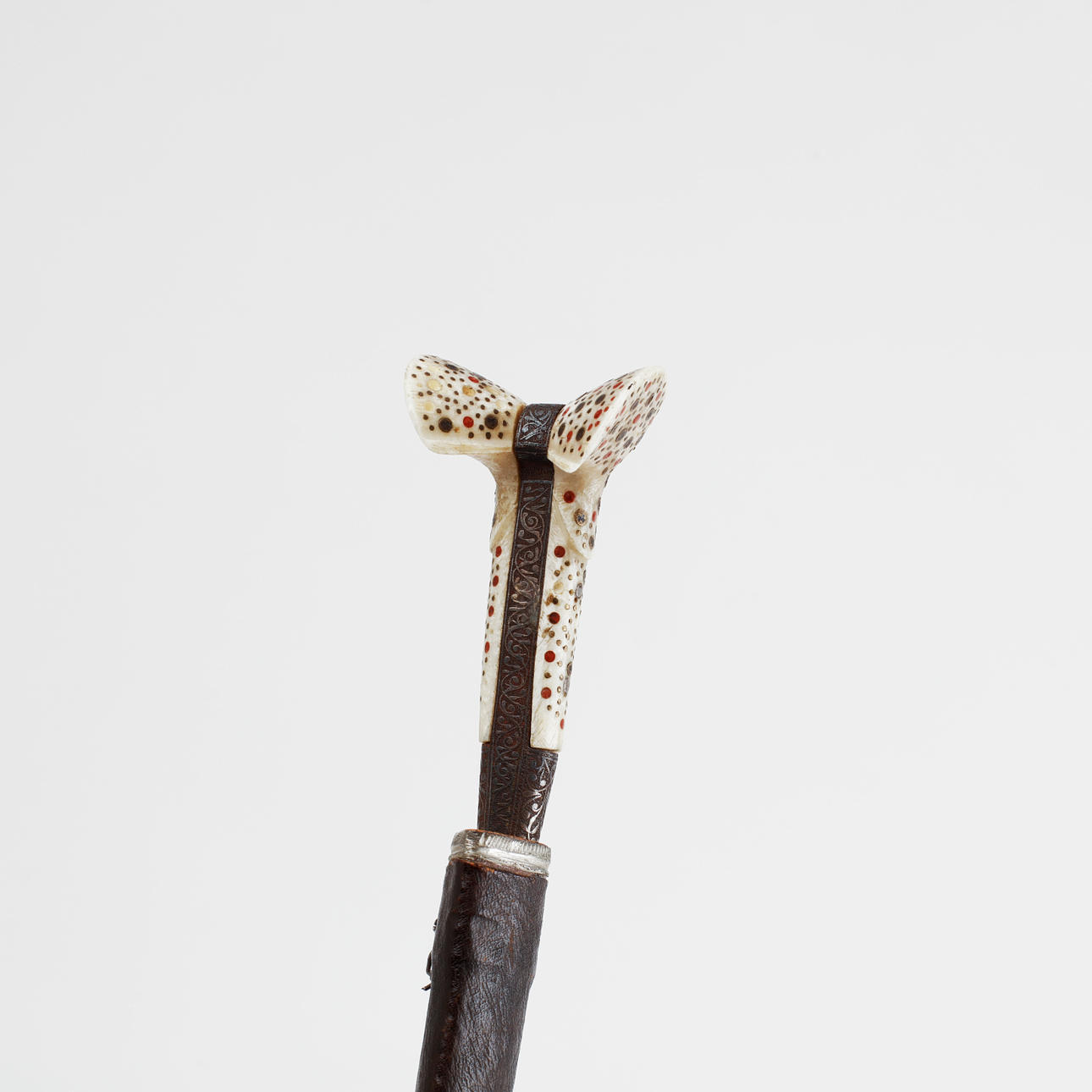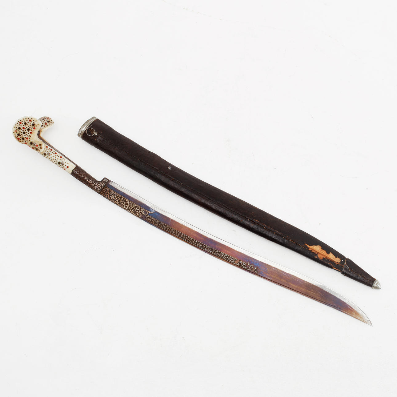Samlet længde ca 47 cm, klinge med indlagt dekoration, ca 34 cm. Fastgjort knogle eller horn med nittet dekoration og rødt glas eller koral. badekar.