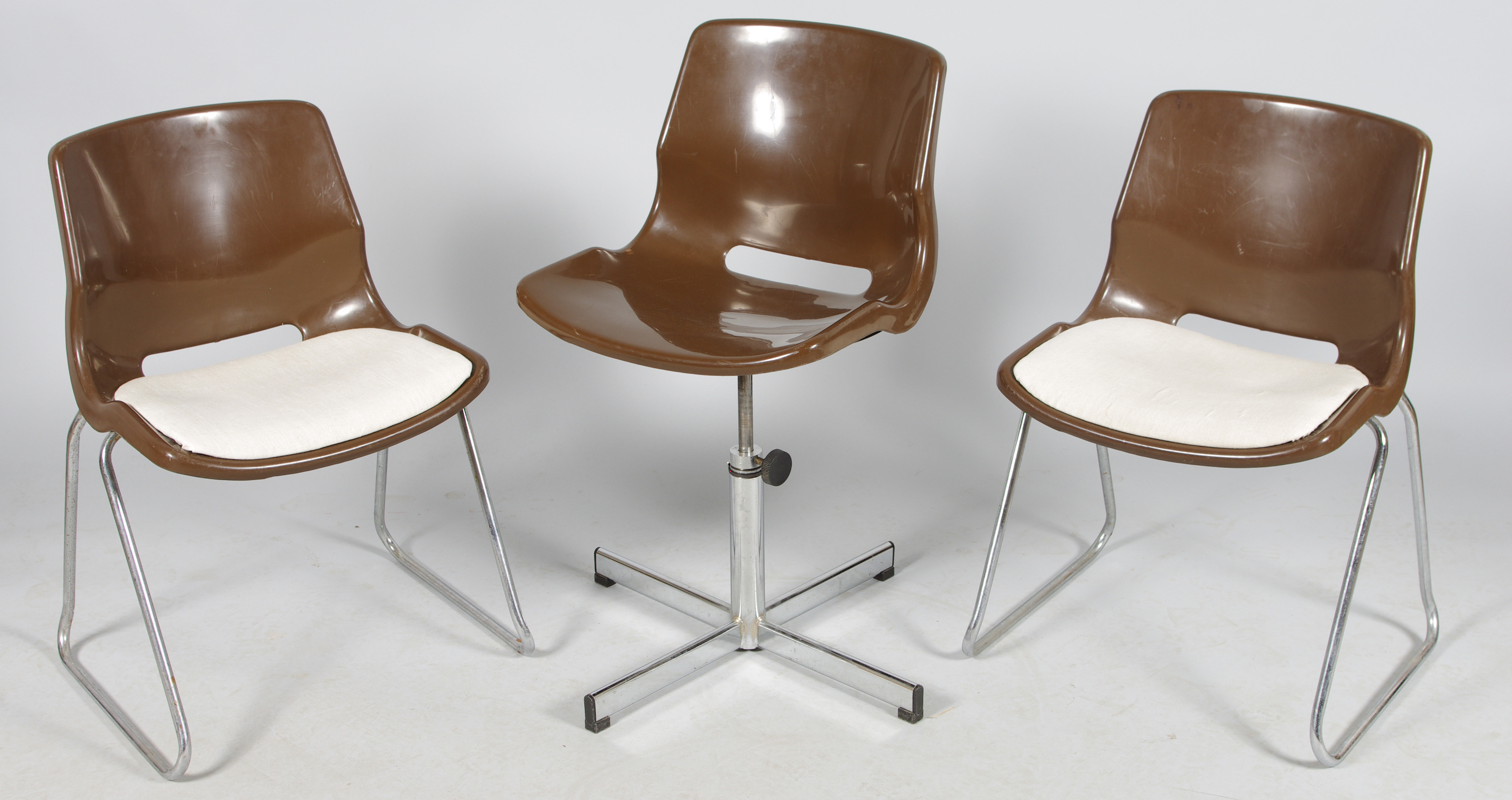 111590. 2 STOLE OG KONTORSTOLE, brun plast med understel i krom.