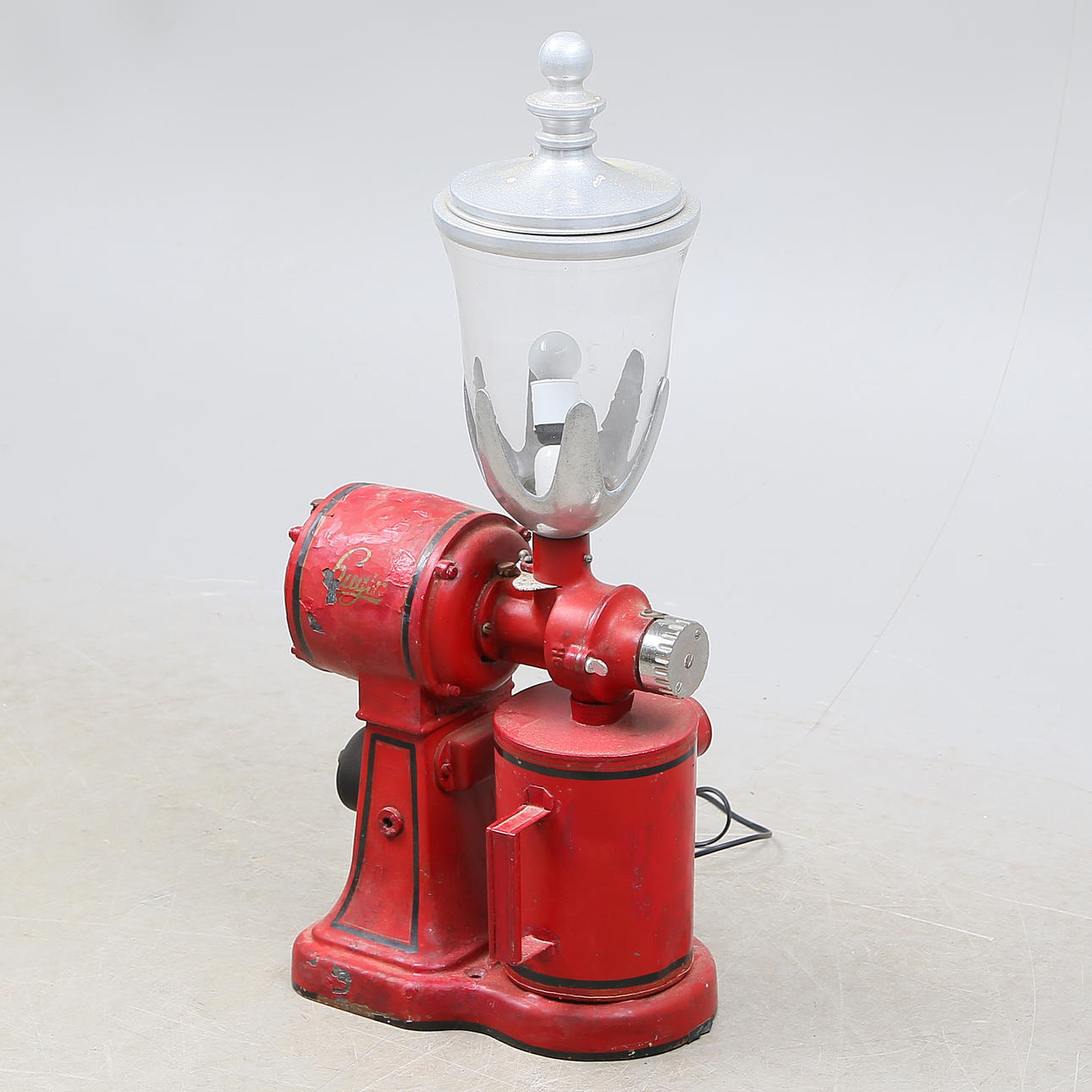 Alder og Brugsslitage. Senere maleri. Rustpletter. Tab af maling, pletter. Senere el, omdannet til bordlampe. Lys/el ikke funktionstestet eller gennemgået. Der ydes ingen funktionsgaranti.