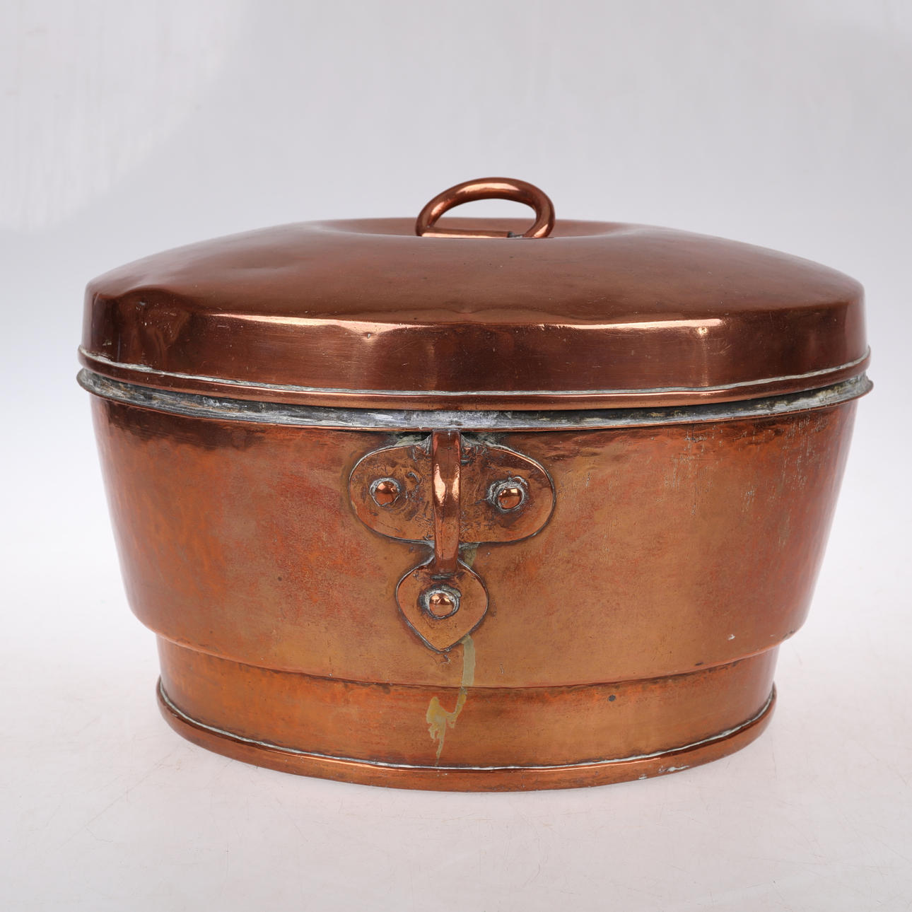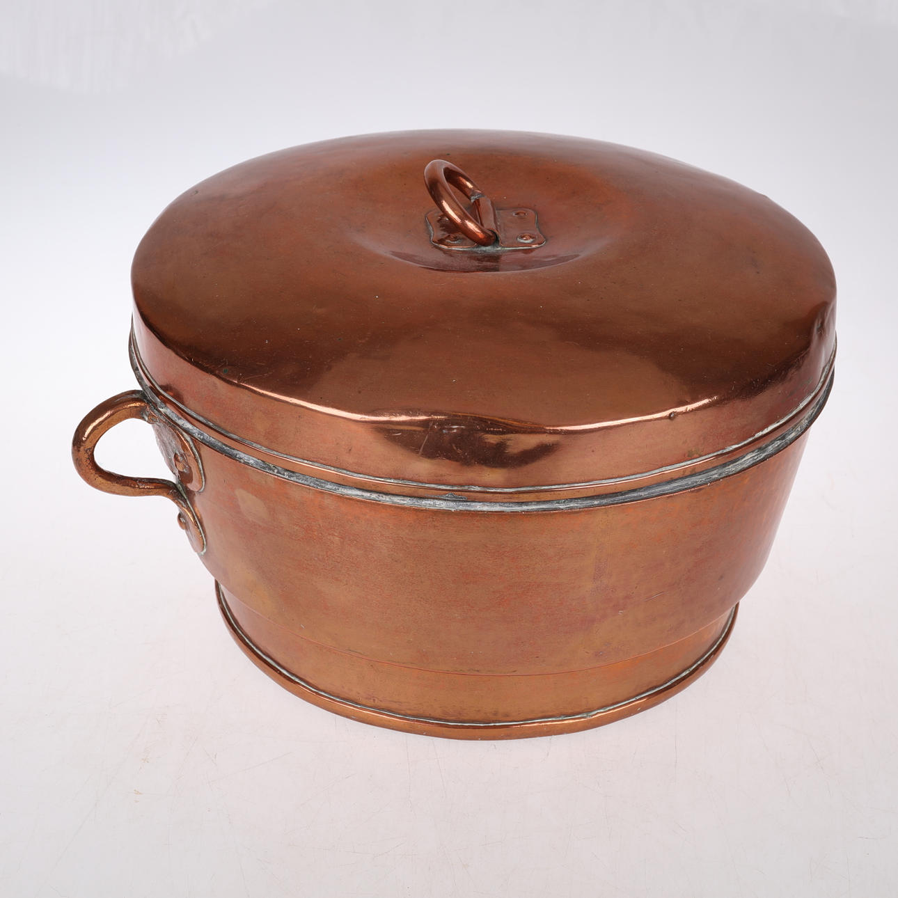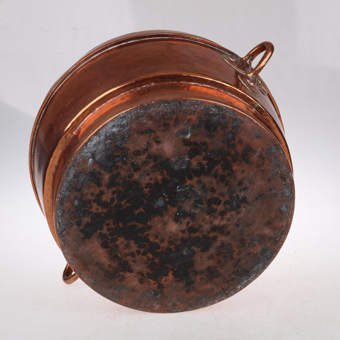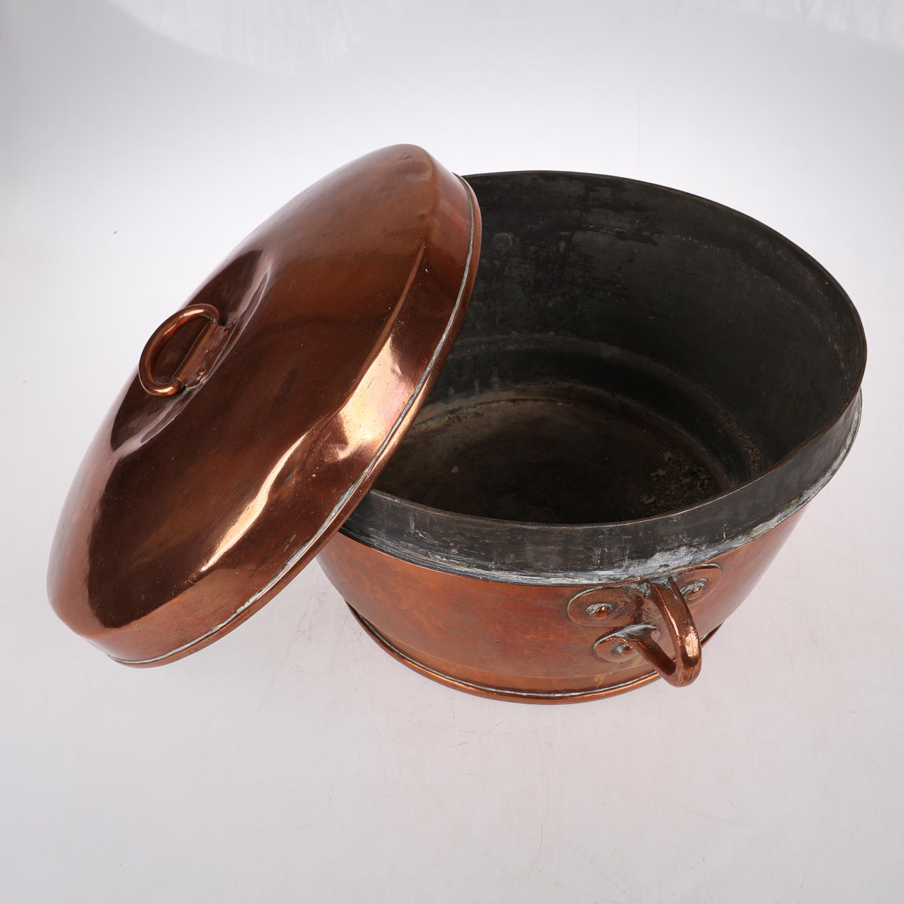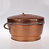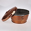 Fin kobbergryde med låg, anslået vægt ca. 5 kg ca ø 37 cm, 23 cm høj.