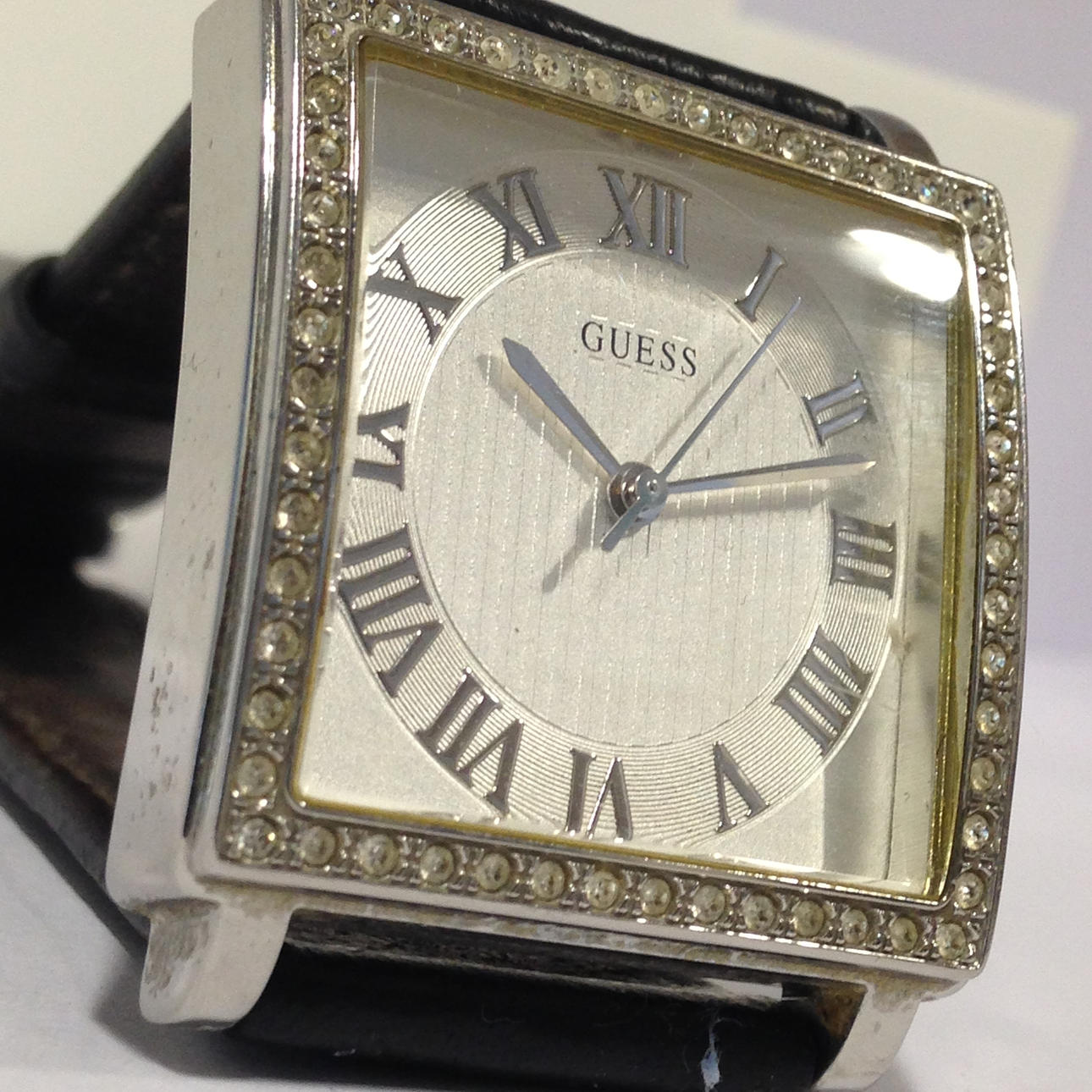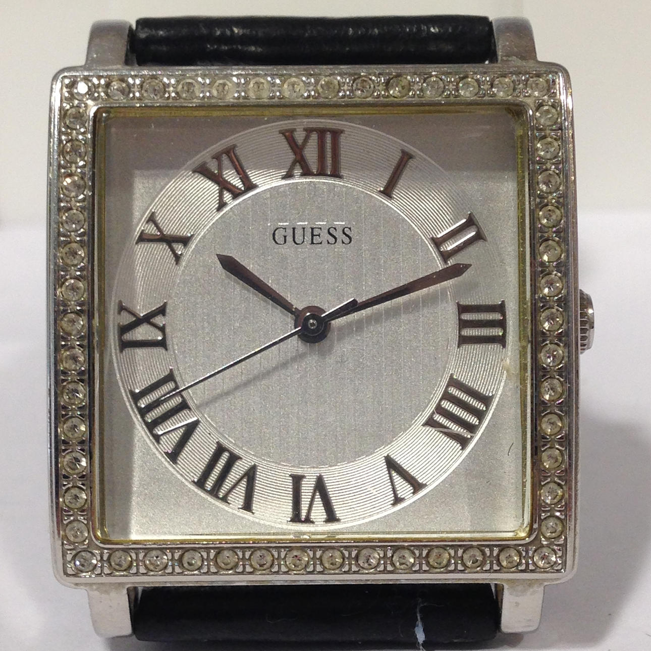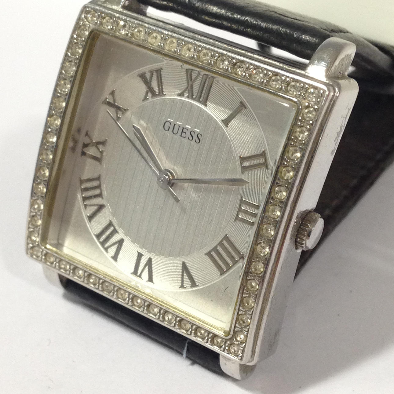 Guess-ur med krystalkant • Mærke - Guess • Modelnr. - 170602L2 • Modelår - 2017 • GlasType - mineralsk • Display - analoge / romertal • Spænde - spænde • Urkasse - firkantet • Urkassediameter -32mm • Urkassetykkelse - 20mm • Båndmateriale - læder • Båndbredde - 22mm • Skivefarve - børstet sølv • Urvægt - 39,1 g • Urværk - quartz Totalvægt - 39,1 g.