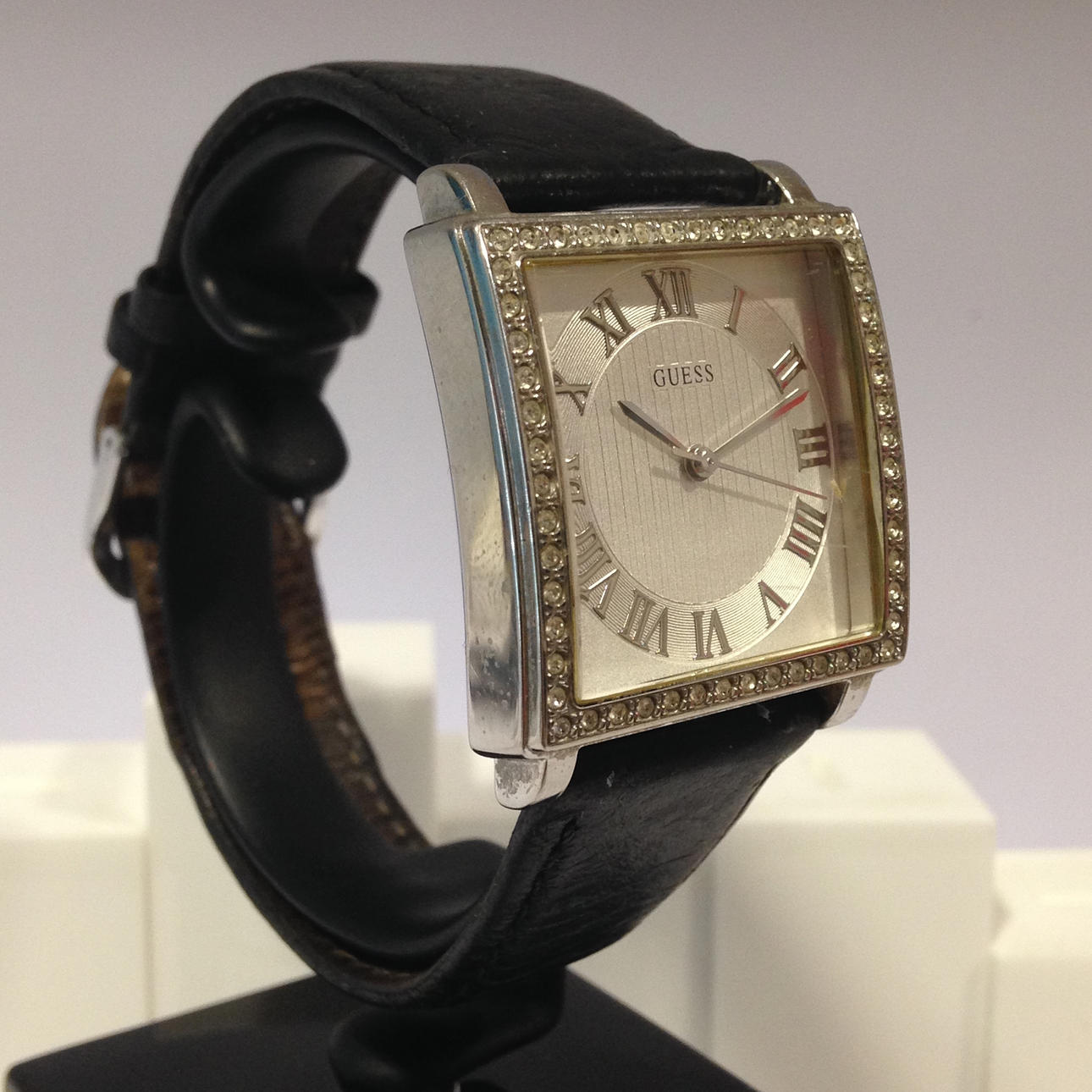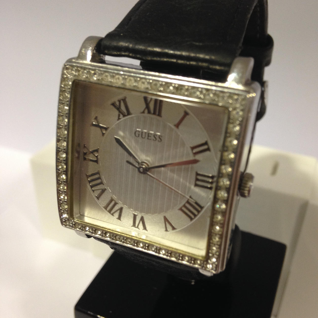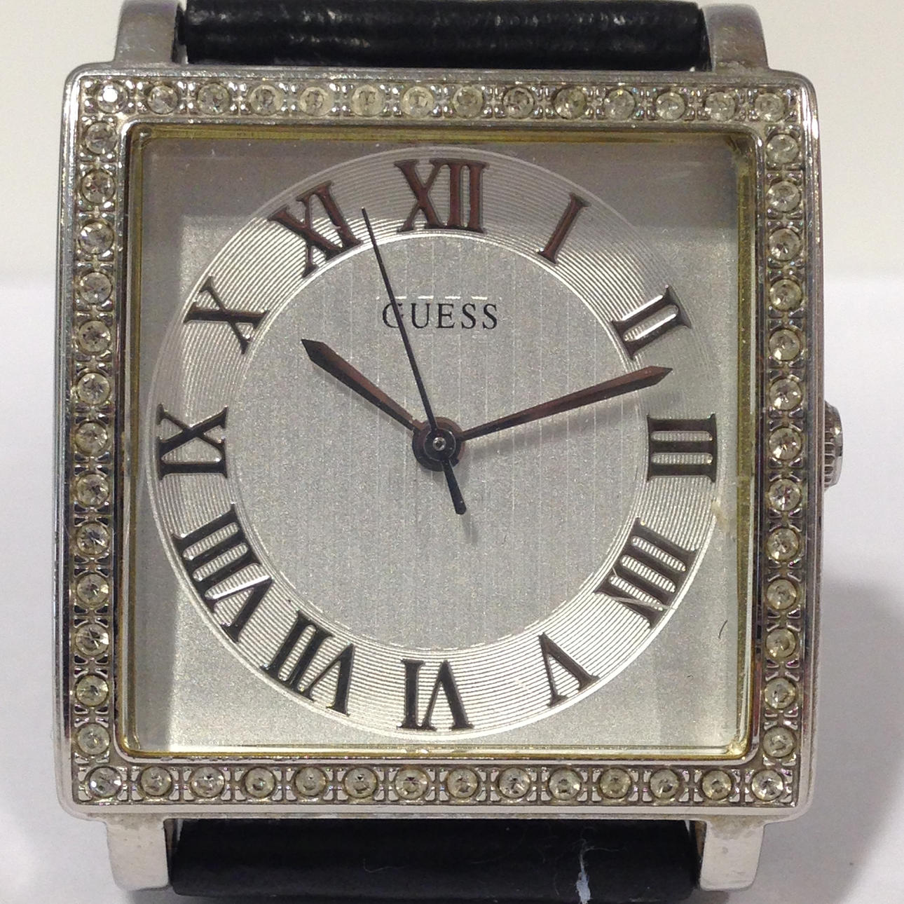 Guess-ur med krystalkant • Mærke - Guess • Modelnr. - 170602L2 • Modelår - 2017 • GlasType - mineralsk • Display - analoge / romertal • Spænde - spænde • Urkasse - firkantet • Urkassediameter -32mm • Urkassetykkelse - 20mm • Båndmateriale - læder • Båndbredde - 22mm • Skivefarve - børstet sølv • Urvægt - 39,1 g • Urværk - quartz Totalvægt - 39,1 g.