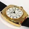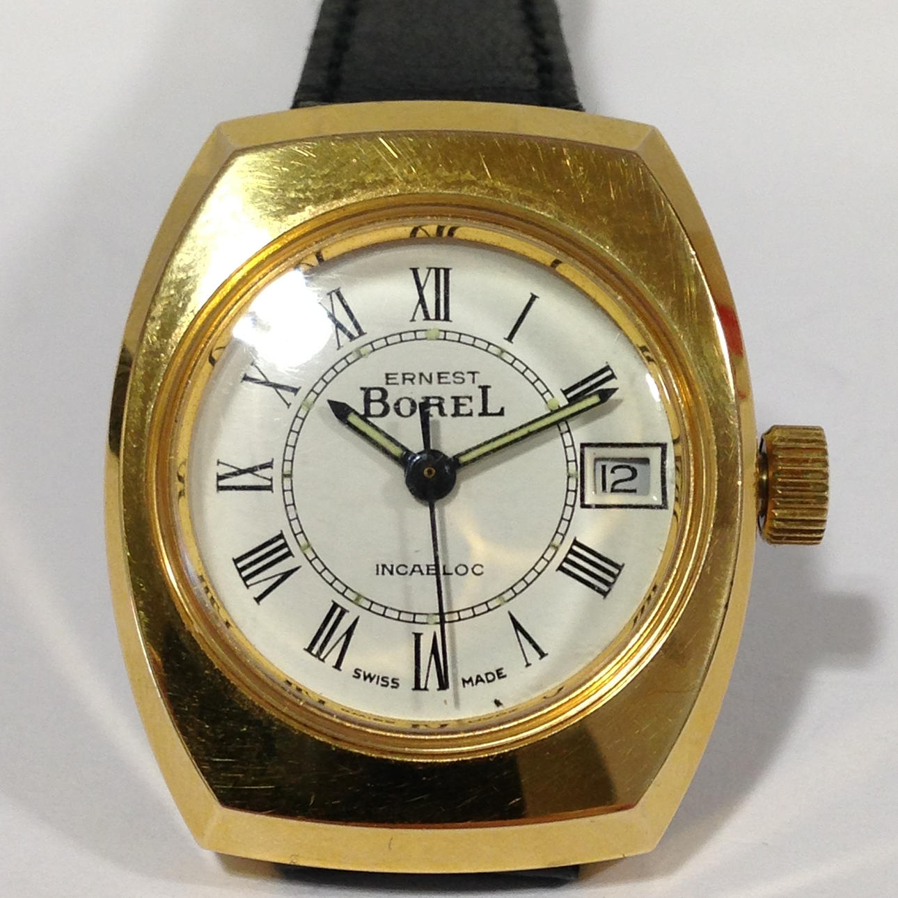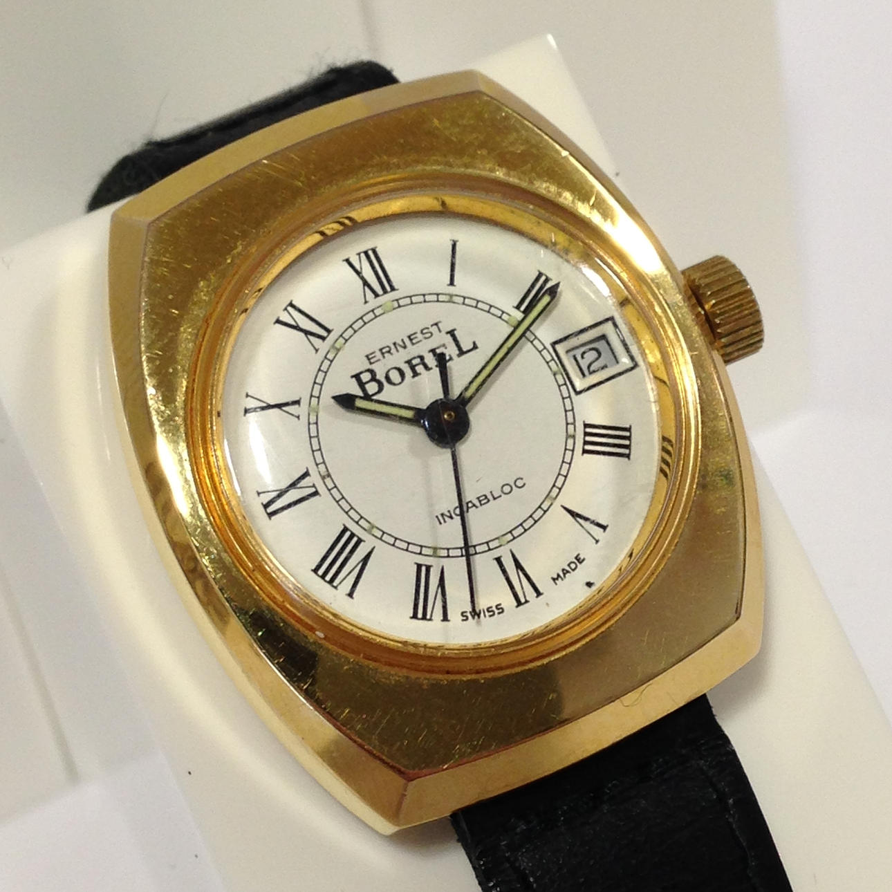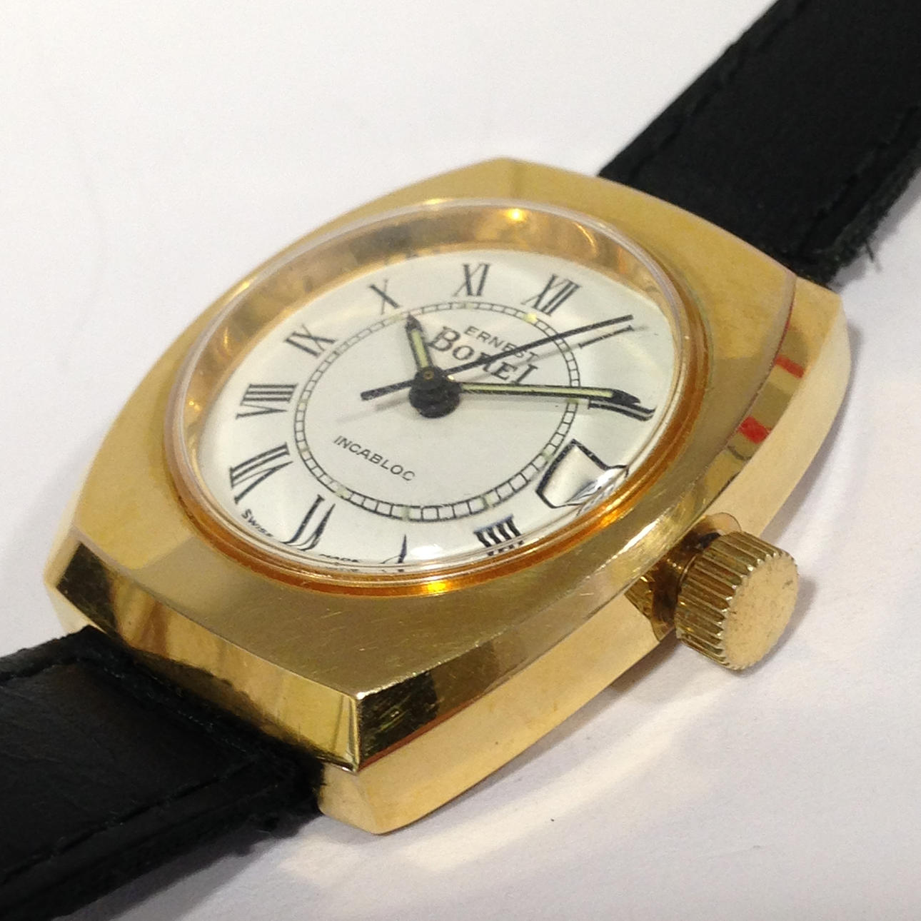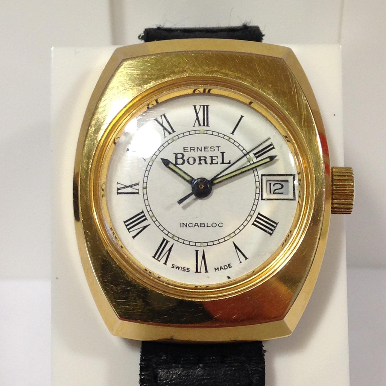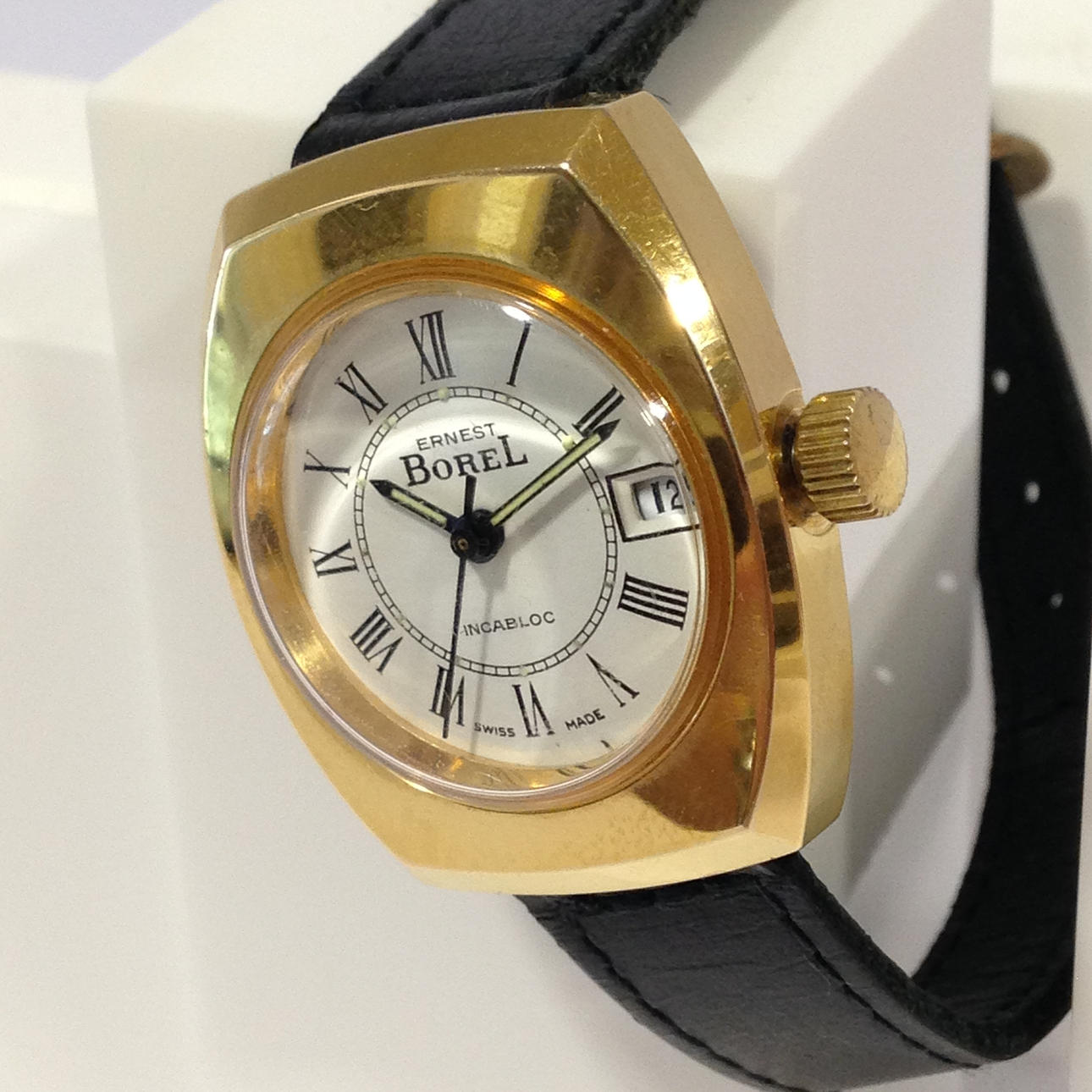 Fremstillingsår: 1920-1970 Knækbredde: 12 mm Mærker: romertal Skivefarve: blå Stil: business Urkasse Finish: glans Urkasse Farve: guld Ur Form: afrundet rektangulær Display: analog Fremstillingsland/-region: schweiz Urkassemateriale: rustfrit stål Bevægelse: mekanisk Egenskaber: Datovindue Køn: dame Remfarve: sort Urkassestørrelse: 25mm x 30mm Remtype: læder Ansigtsfarve: hvid Remmateriale: læder Æske og papirer: nej Urvægt: 27,2 gram.
