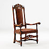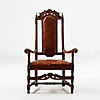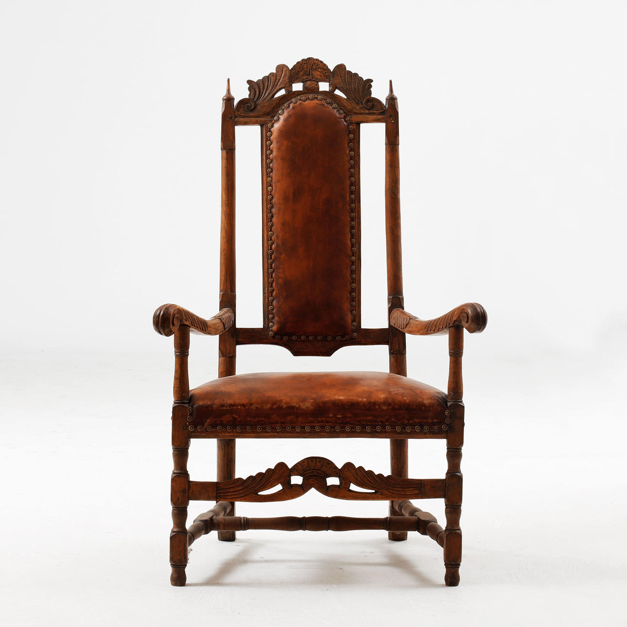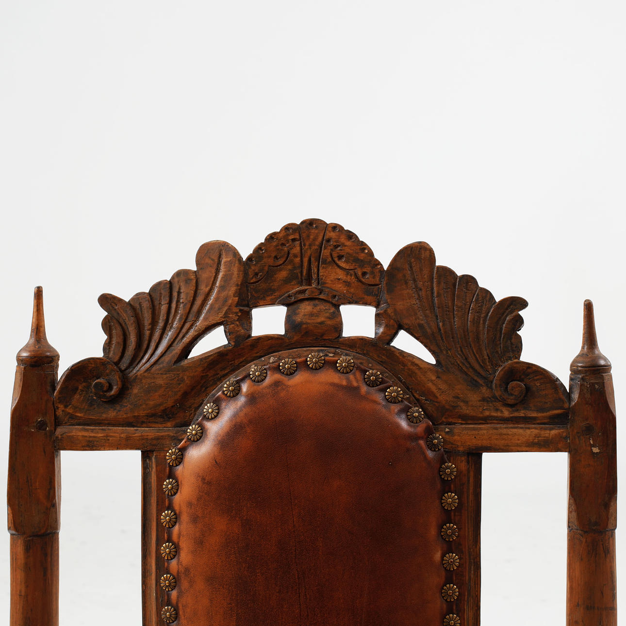Træskåret dekoration, betræk i brunt læder, sædehøjde 49 cm.