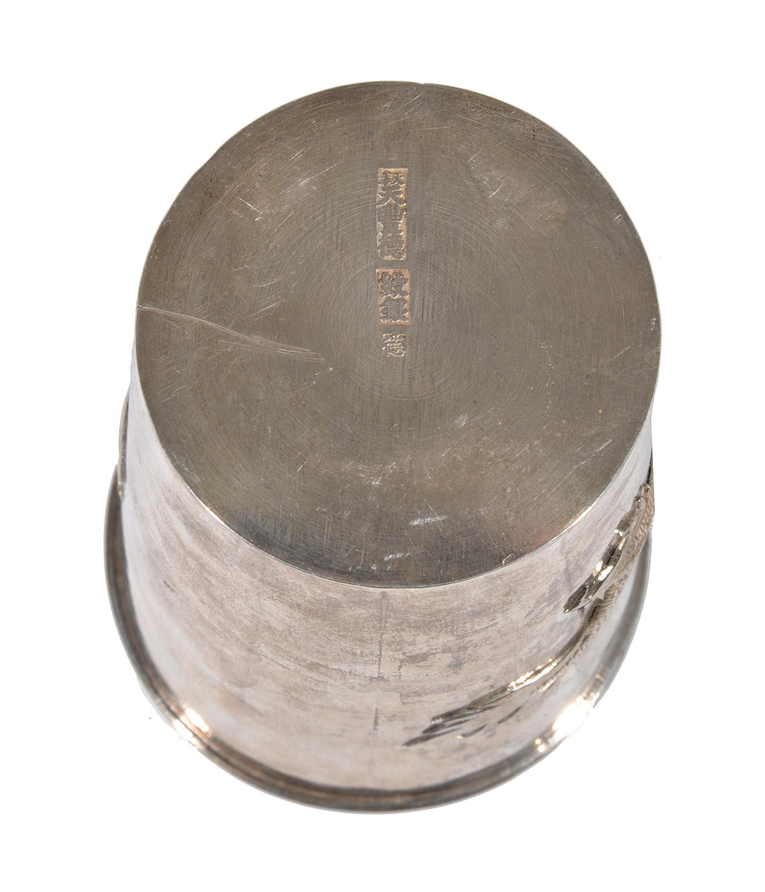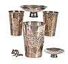 Et japansk sølvbæger af tilspidset cylindrisk form dekoreret i repouse med en drage, der forfølger en flammende tama under en rullet læbe, base præget med Jungin-mærke og producentmærke, højde 10 cm, Meiji-periode; To lignende bægere, hver jaget med et lignende emne, højde 7,5 cm; To japanske Silver Sakezuki, 9 cm og 6 cm; og en lille hvid metalmodel af en rotte (6).