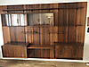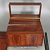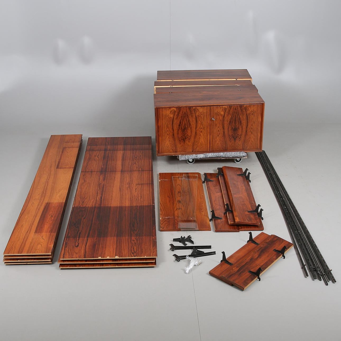 Jacaranda finer reolsystem. To skabe med lågepar og hylder bagved, længde 90, bredde 35, højde 44 cm. To vitrineskabe med glaslåger og hylde, længde 90, bredde 17, højde 44 cm. 4 hylder, længde 90, bredde 17, 2 hylder længde 60, bredde 17 cm, 1 hylde længde 88, bredde 35 cm. Bagsiden i 7 sektioner. Totallængde 300, højde 210 cm