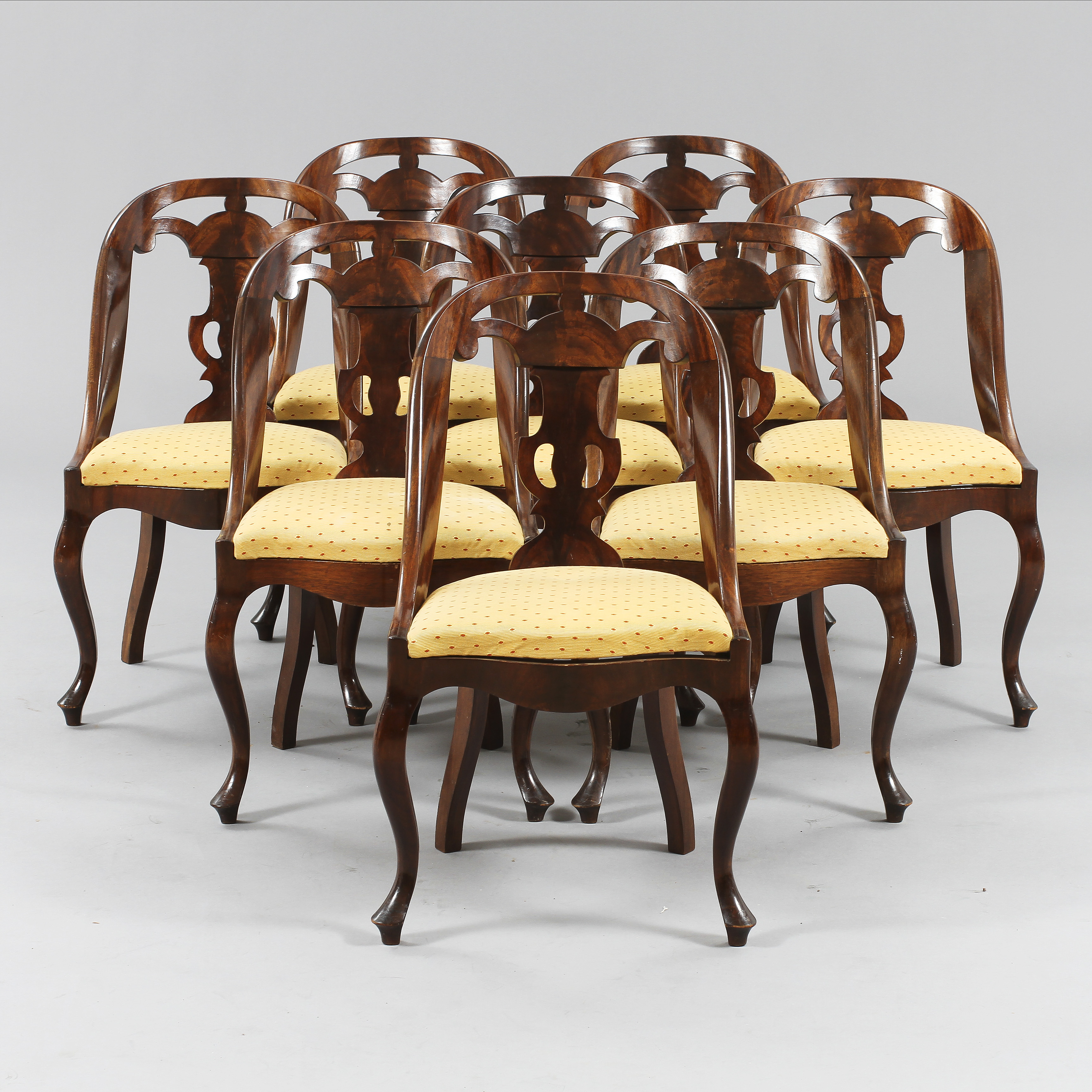 118075. MADGRUPPE, 9 dele, bord og 8 stole.