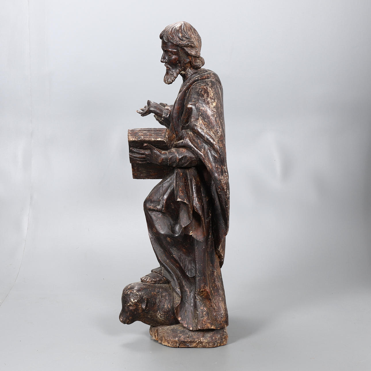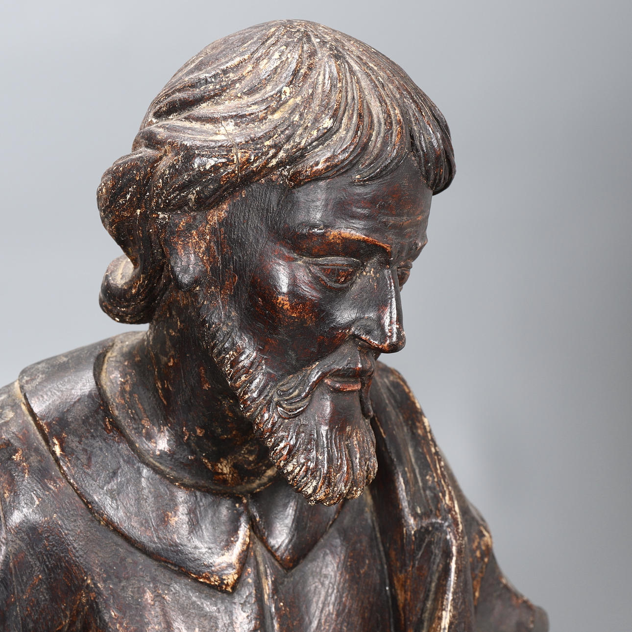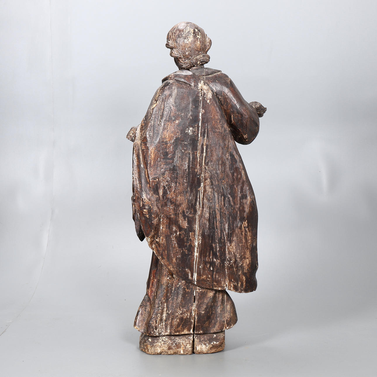 Totalt tab af polykromi. Rester af forberedelseslag. revner i træet.