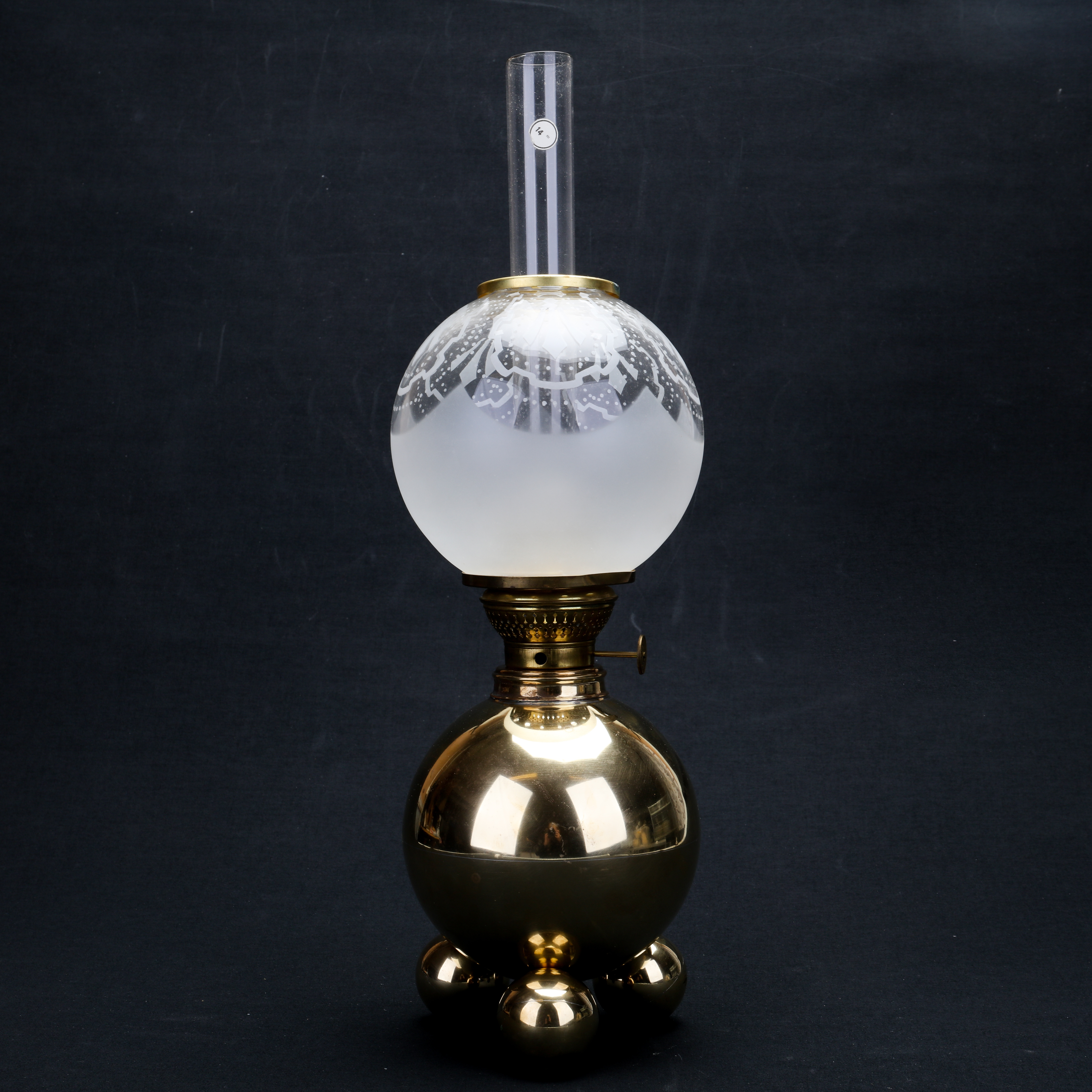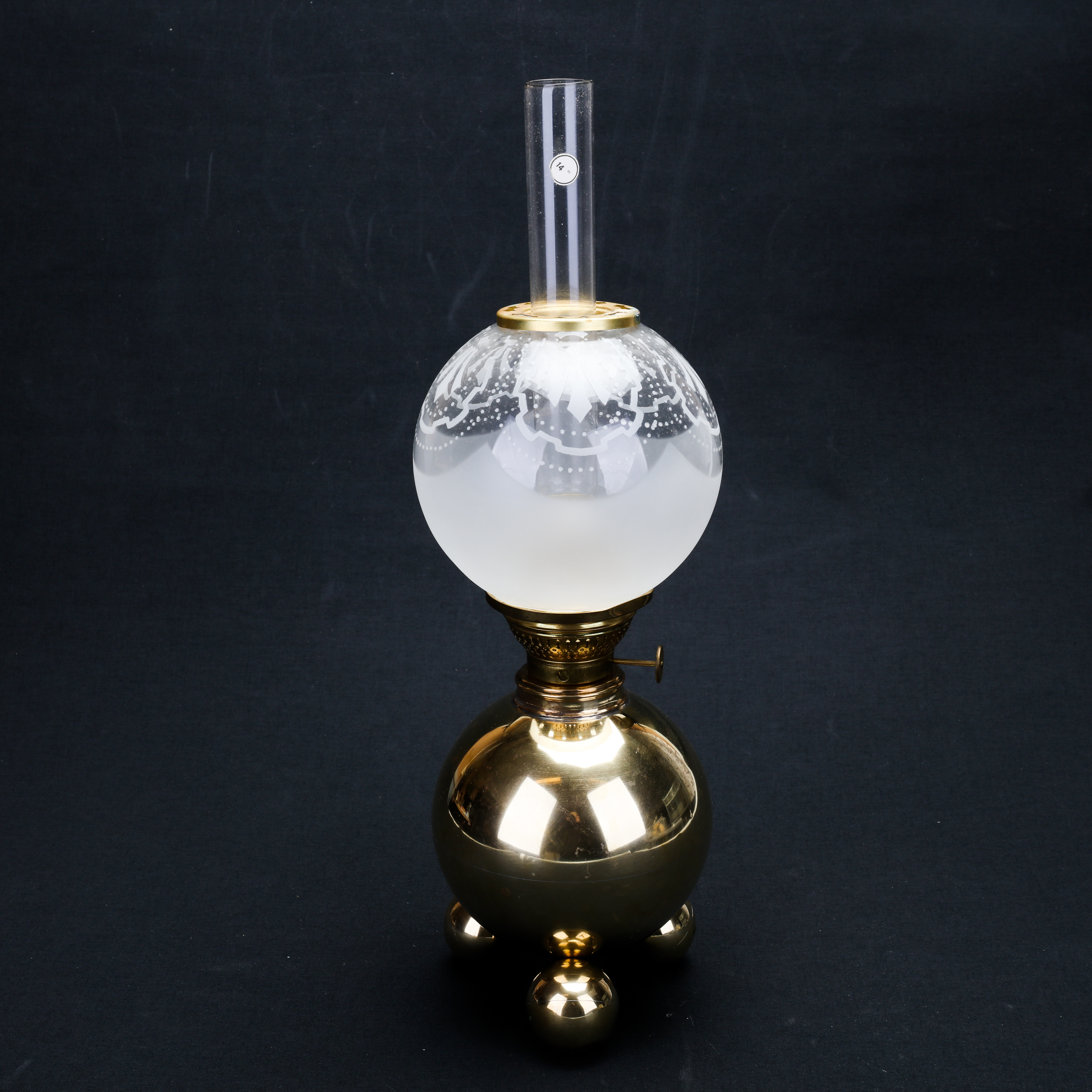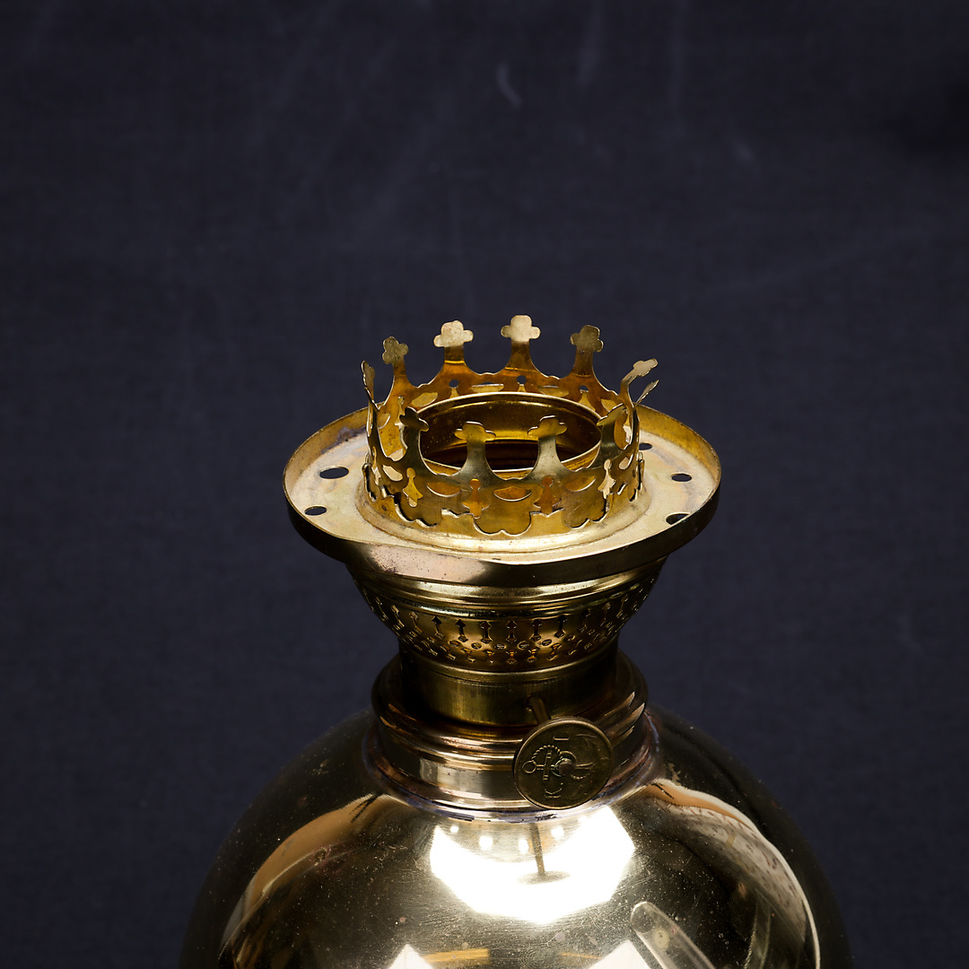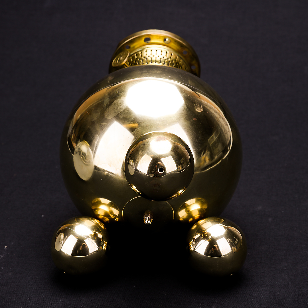 1192712. TORSTEN TRYCKARE. bordpetroleumslampe, messing, kuglemodel, 1986.