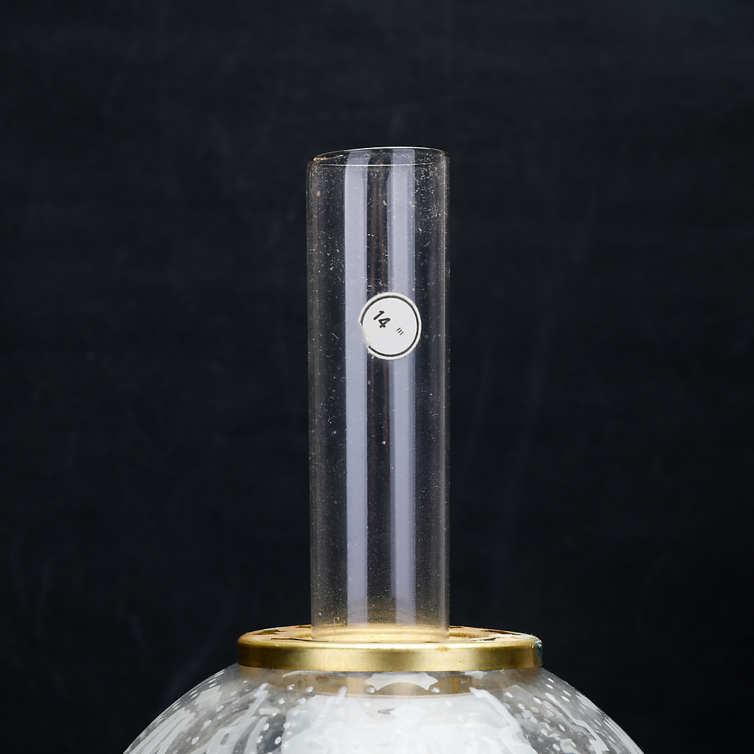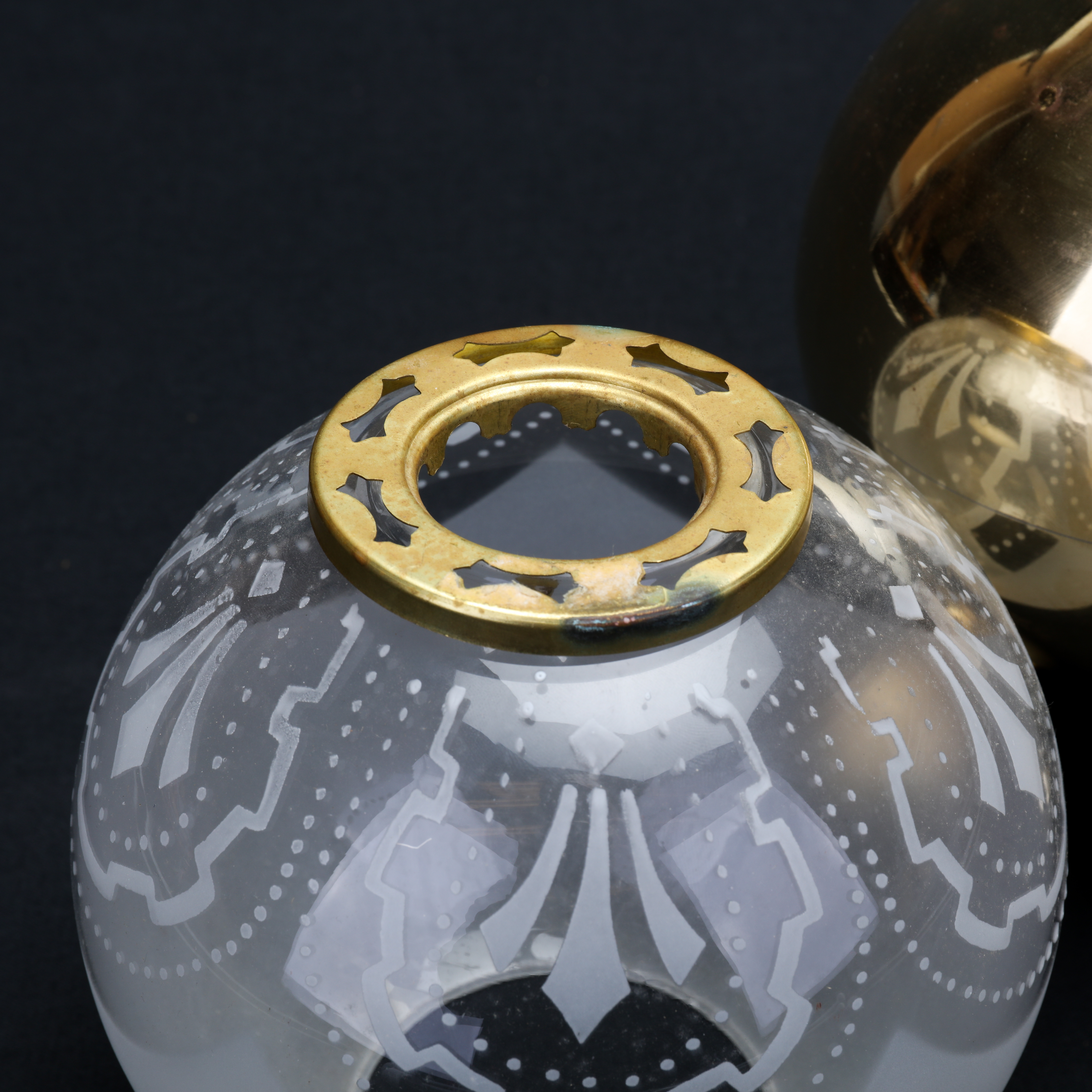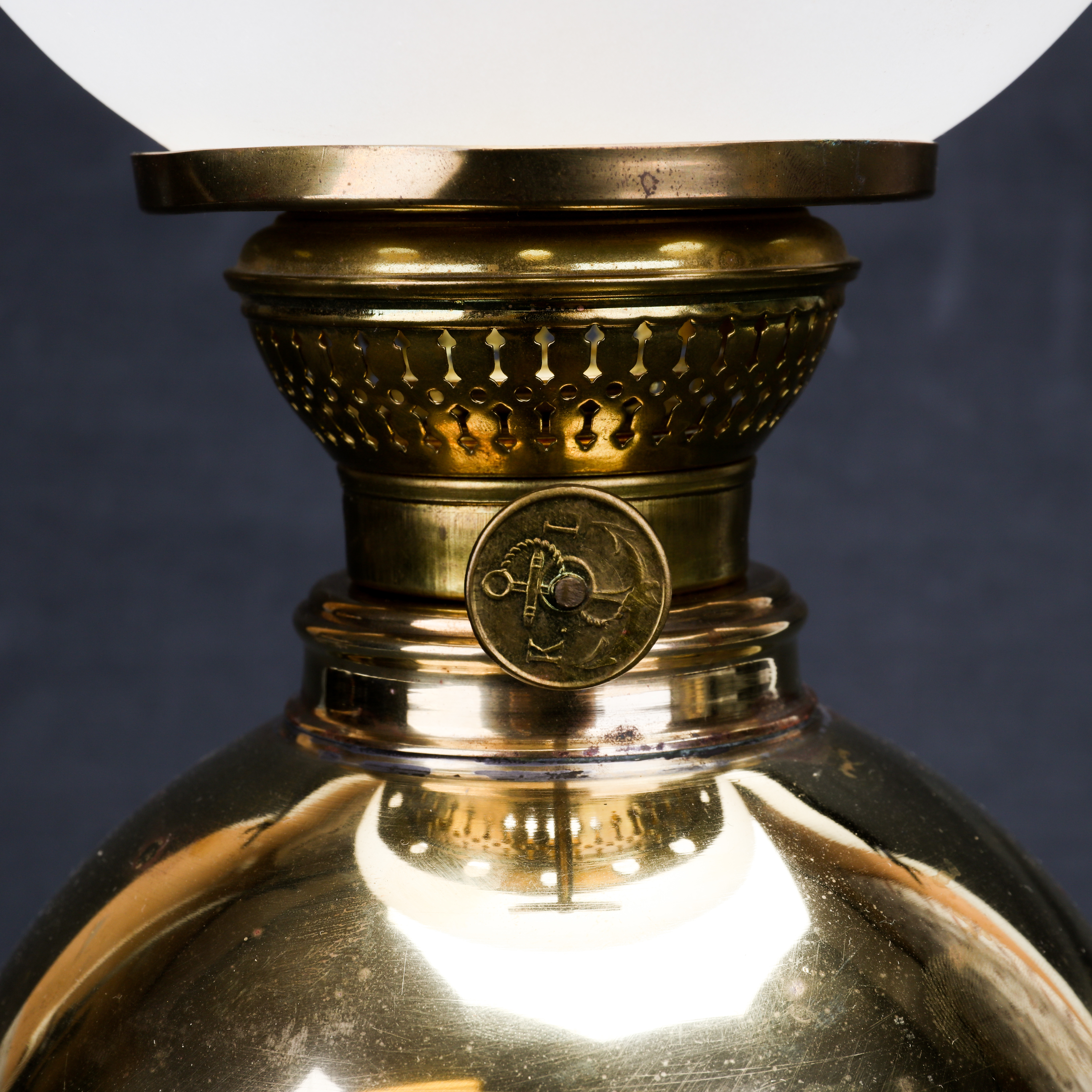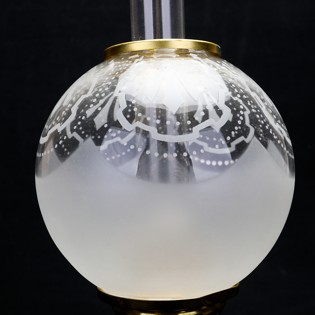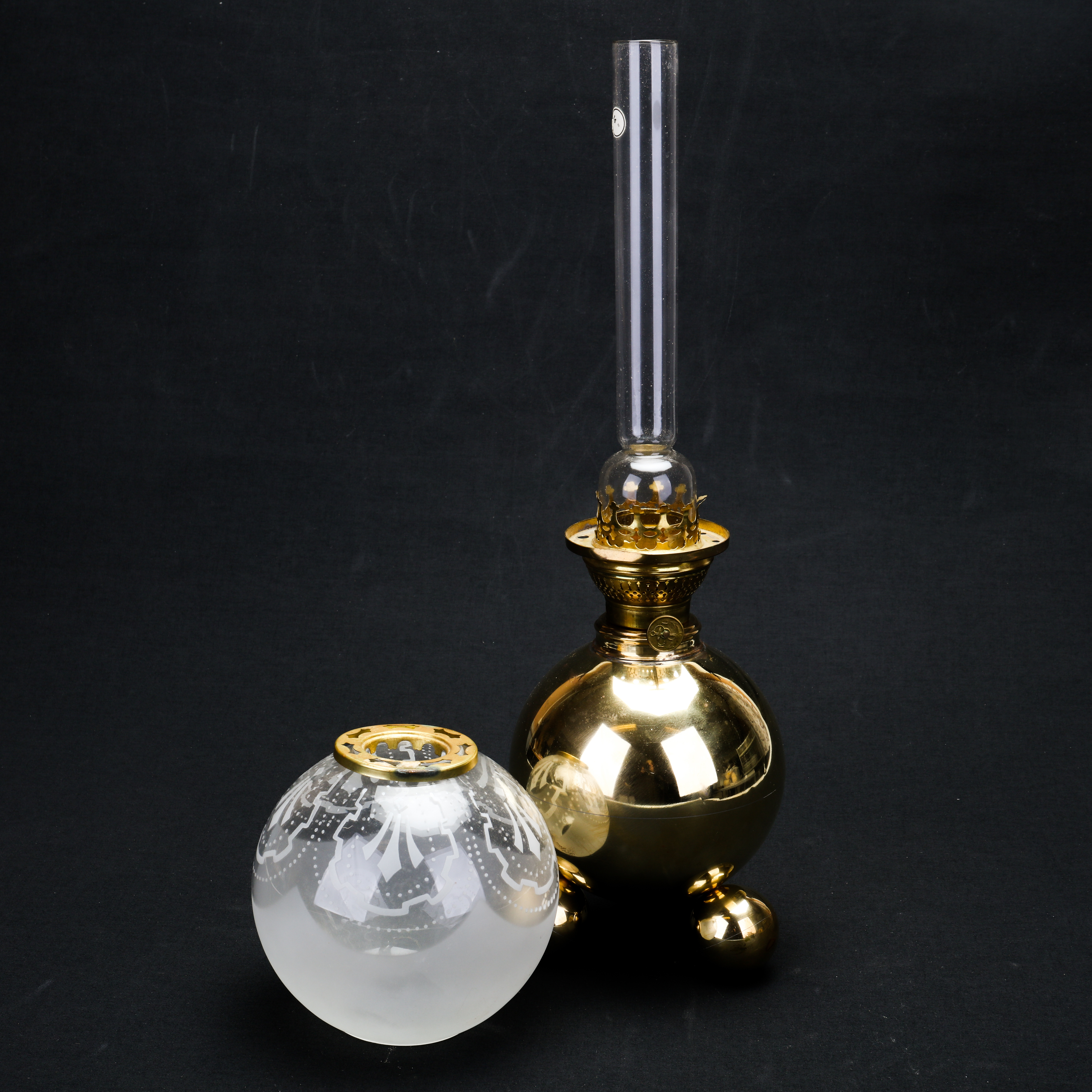 1192712. TORSTEN TRYCKARE. bordpetroleumslampe, messing, kuglemodel, 1986.