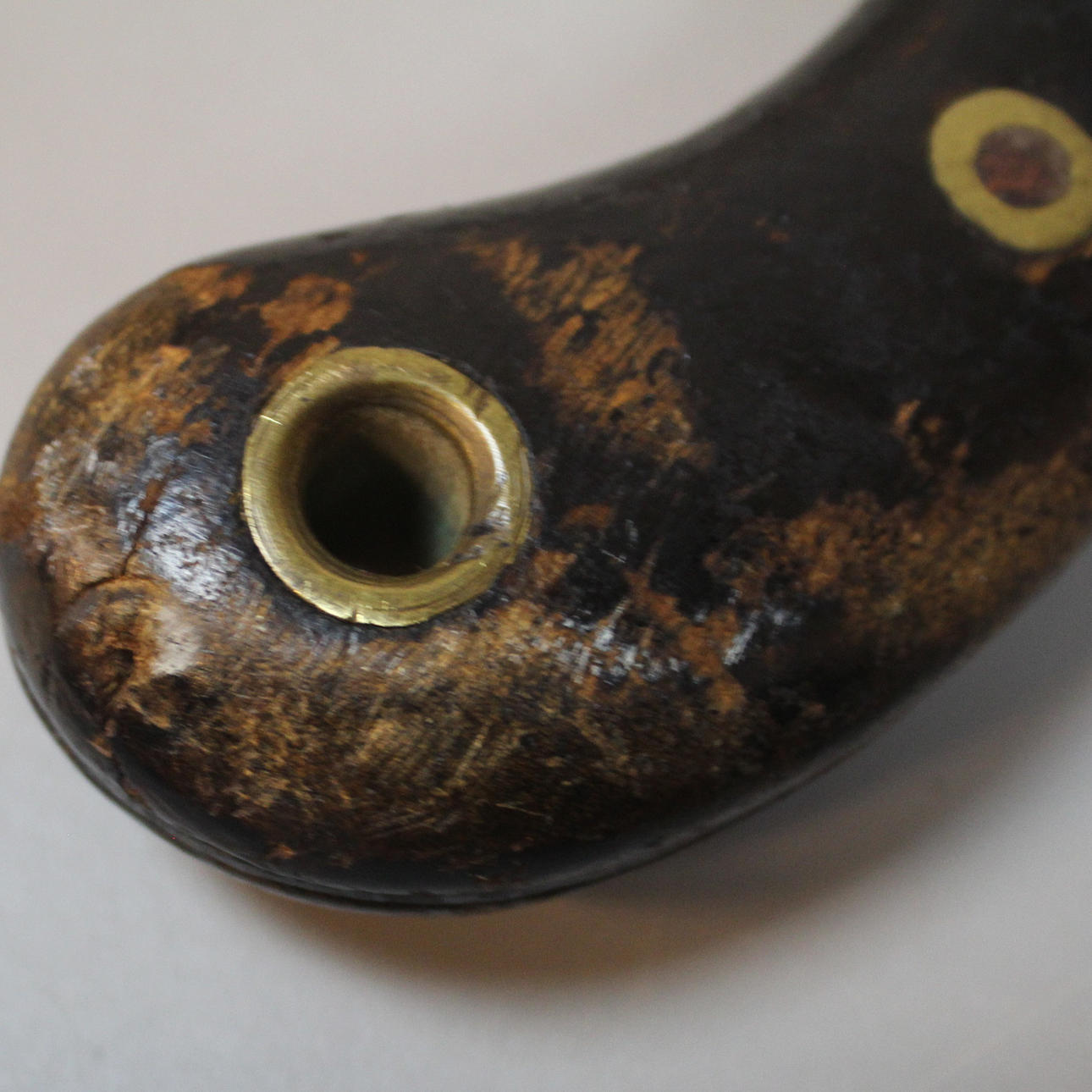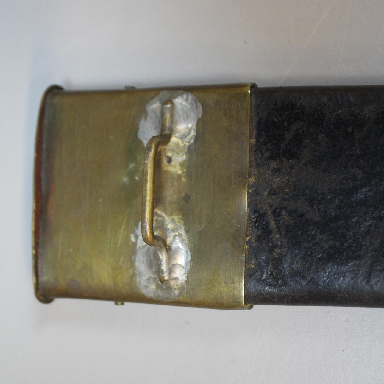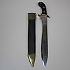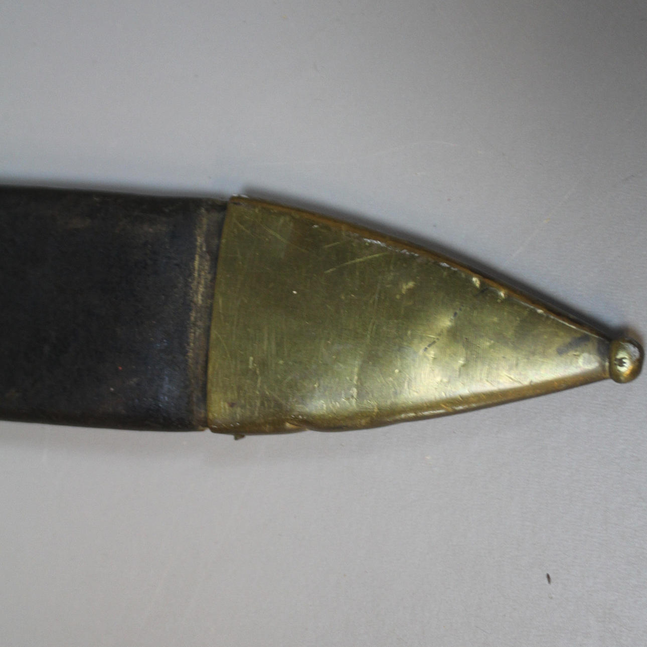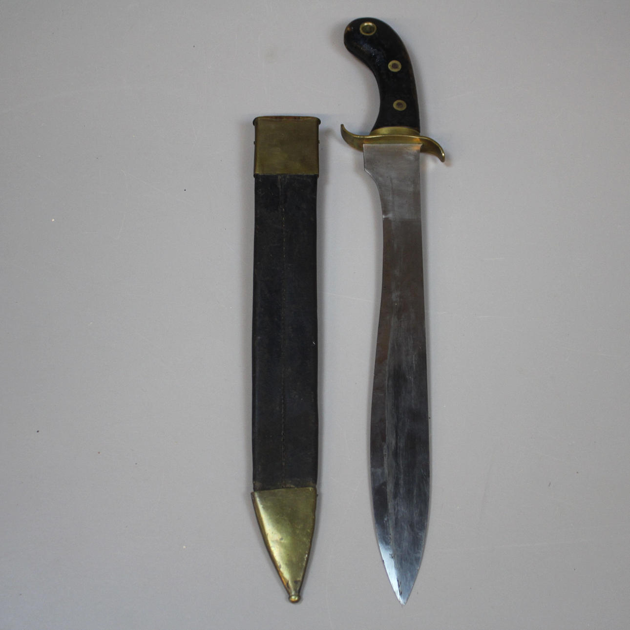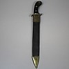 beslag i sortfarvet træ med messingdetaljer mærket J. Walén AH kar i læder og messing, længde ca 58 cm.