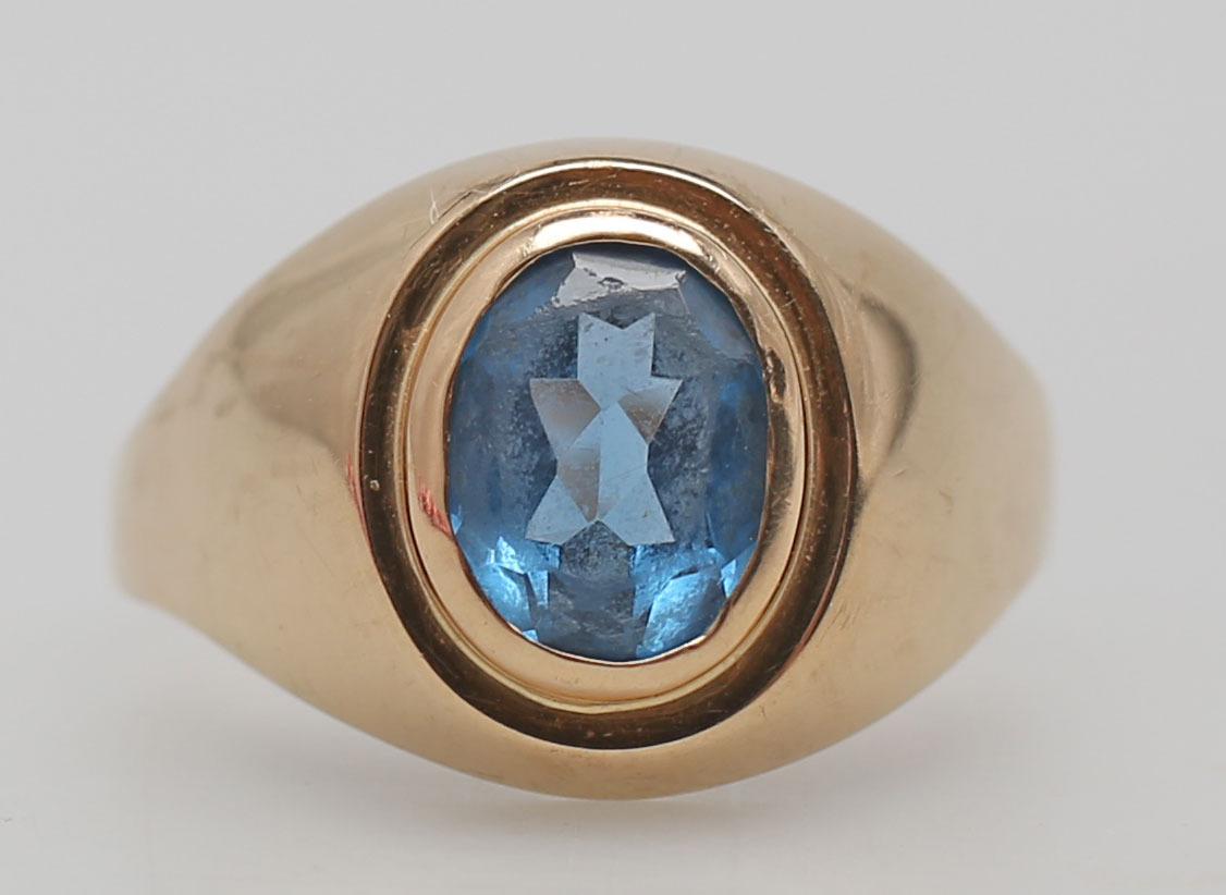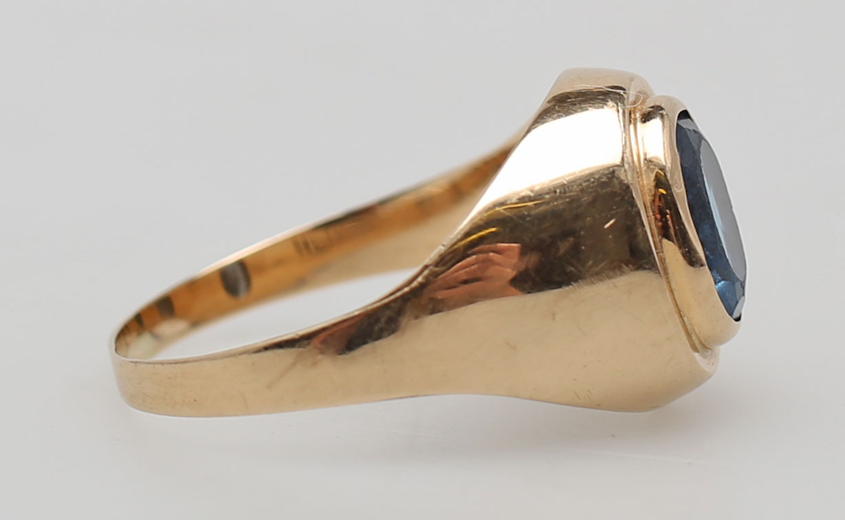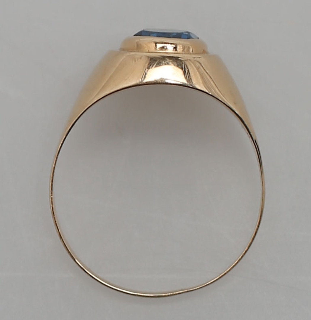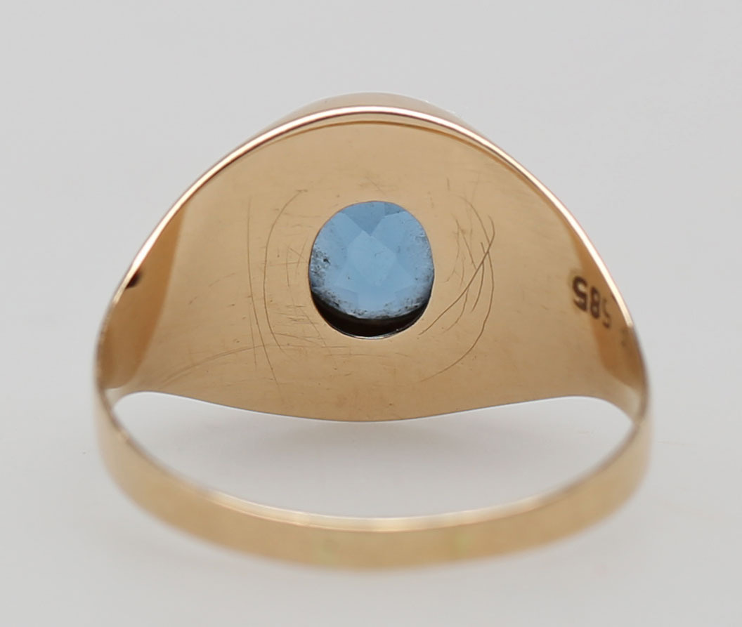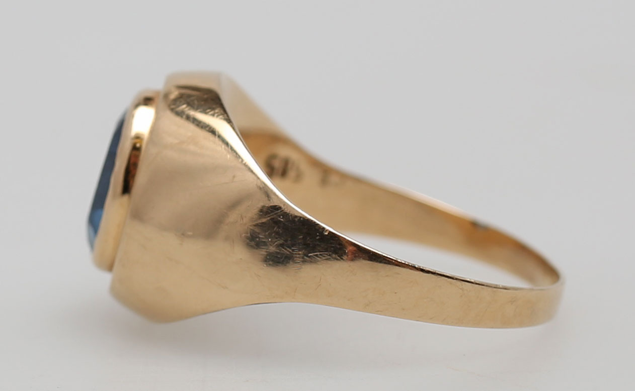 119976. RING MED BLÅ STEN, rødguld, 14K.