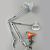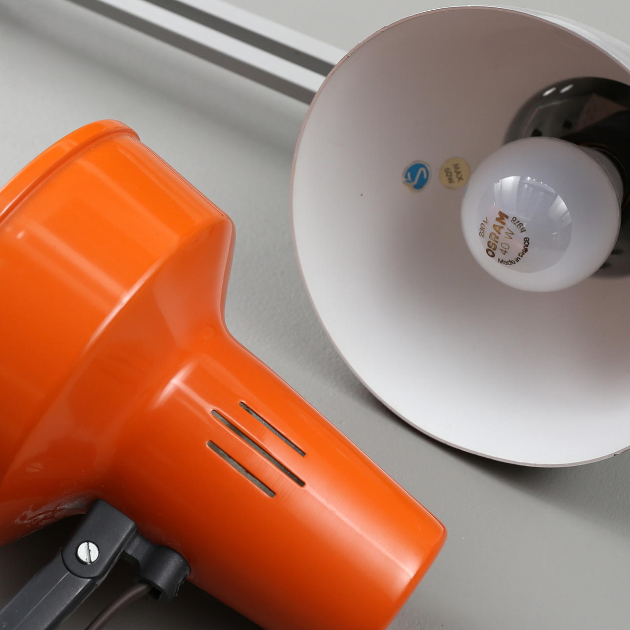 Lamper, Luxo, 2 stk. skrivebordslamper, hvoraf den ene er mærket "LSA A.101". grålakeret metal, total længde ekskl. bordbeslag ca 100-120 cm. Orange lakeret væglampe, mærket Luxo, højde 17 cm, dybde 20 cm 1960'erne/70'erne.