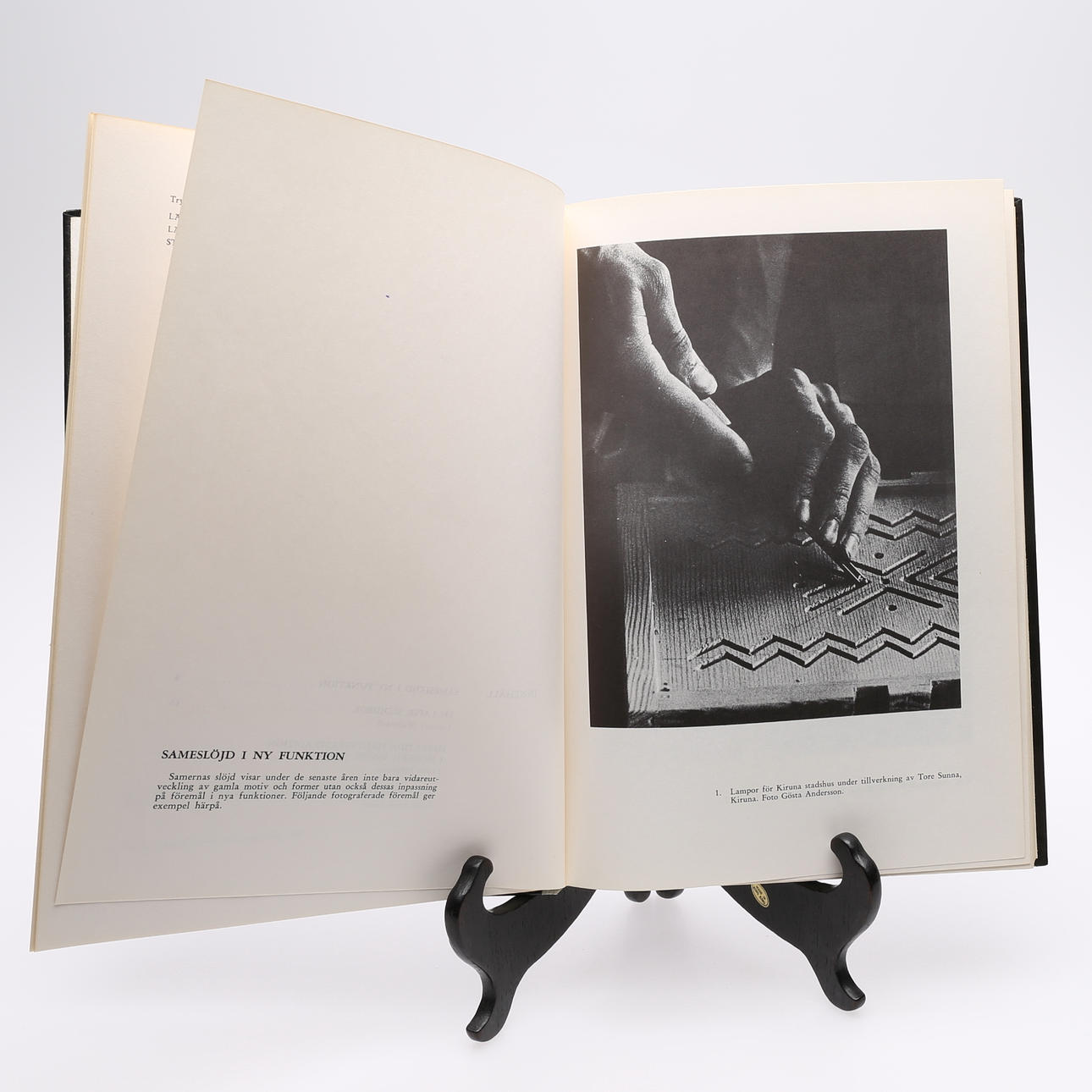 Lapponica. Lette Runo J:søn. Mønsterbog i samisk håndværk. Horn og træværk i Norrbottens län. Norrbotten Museum 1968. 23 s. 52 mønsterplader med beskrivelser. Dekoreret, sort, papbånd med hvid tekst og hvid illustration.