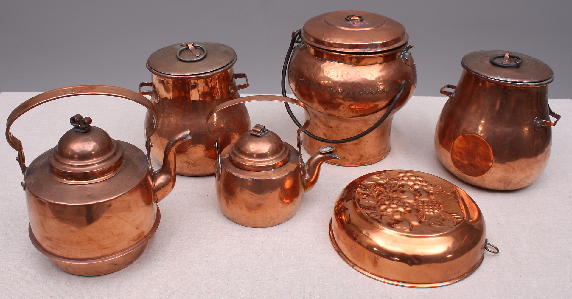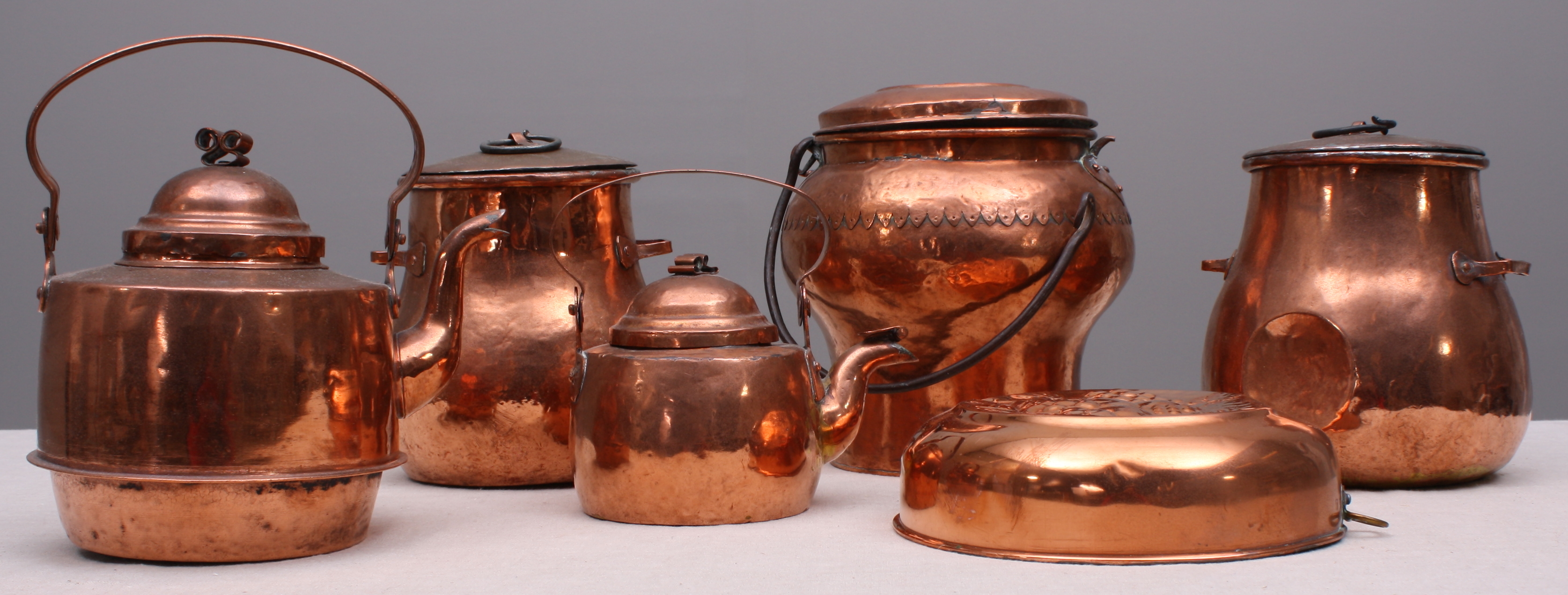 122476. KOBBERGENSTANDE, 6 stk, Kaffekander + Mavekar + Bageform.