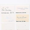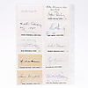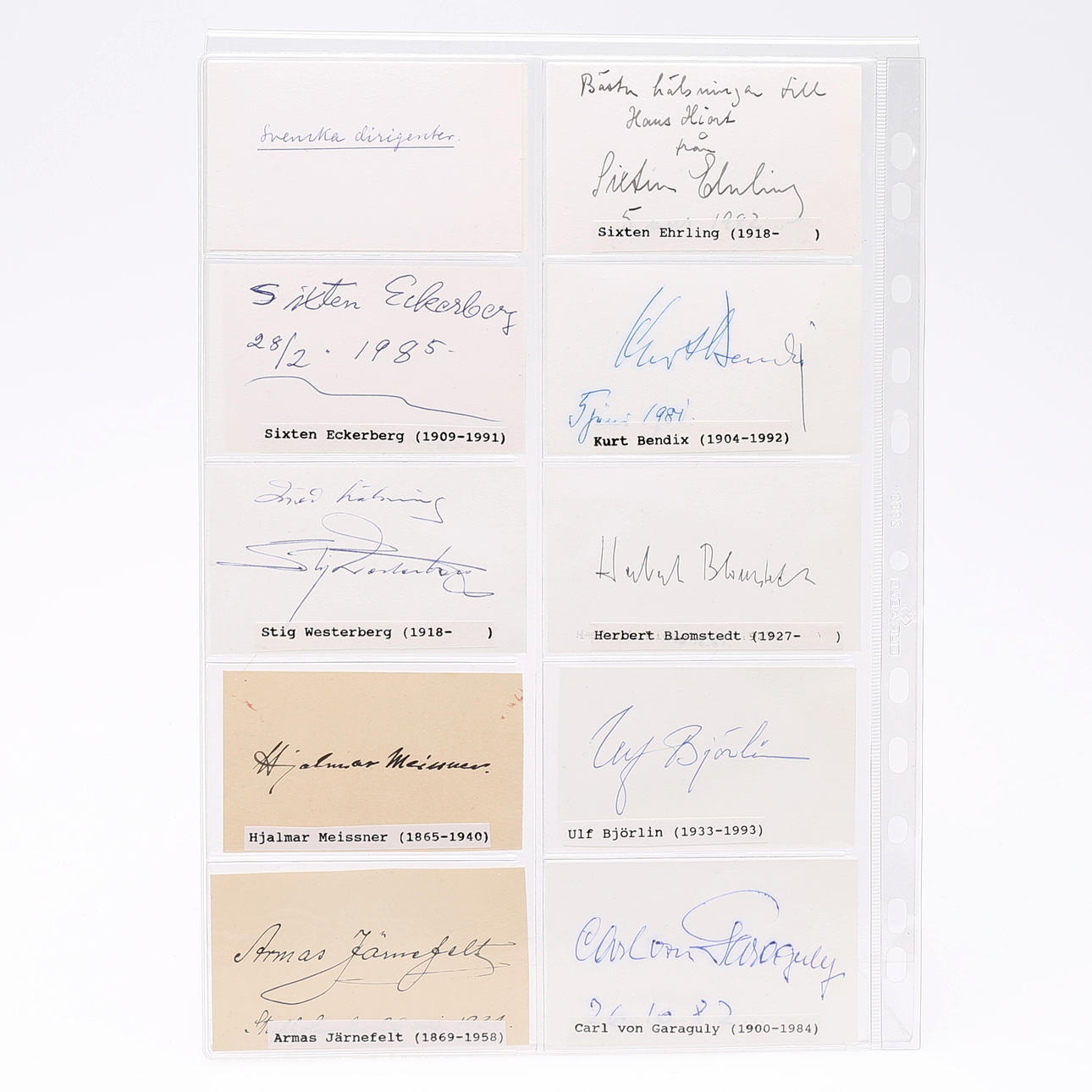 Sixten Ehrling, Sixten Eckerberg, Kurt Bendix, Stig Westerberg, Herbert Blomstedt, Hjalmar Meisser, Ulf Björlin, Armas Järnefelt, Carl von Garguly, Johannes Norrby, Eric Ericsson, Theodor Pinet - måler 9 cm. x 5,5 cm. Herkomst: Sverker Hiort fra Ornäs autografsamling.