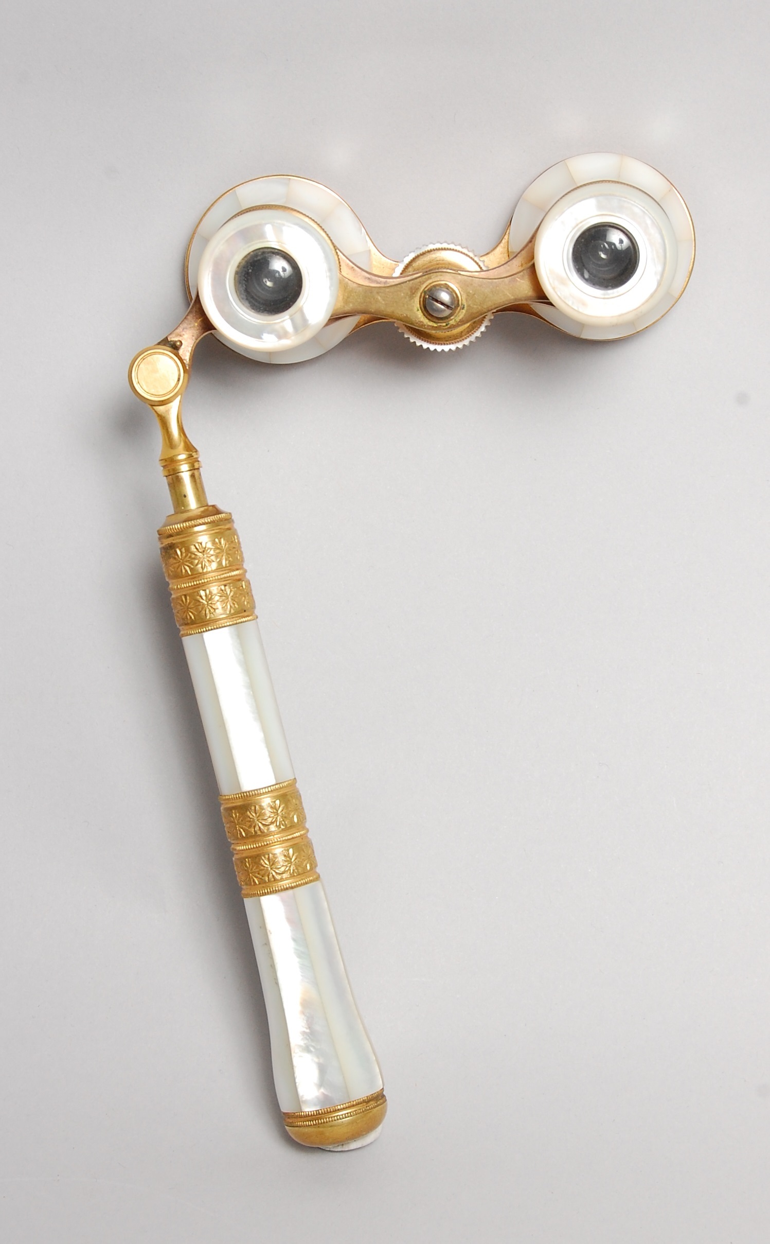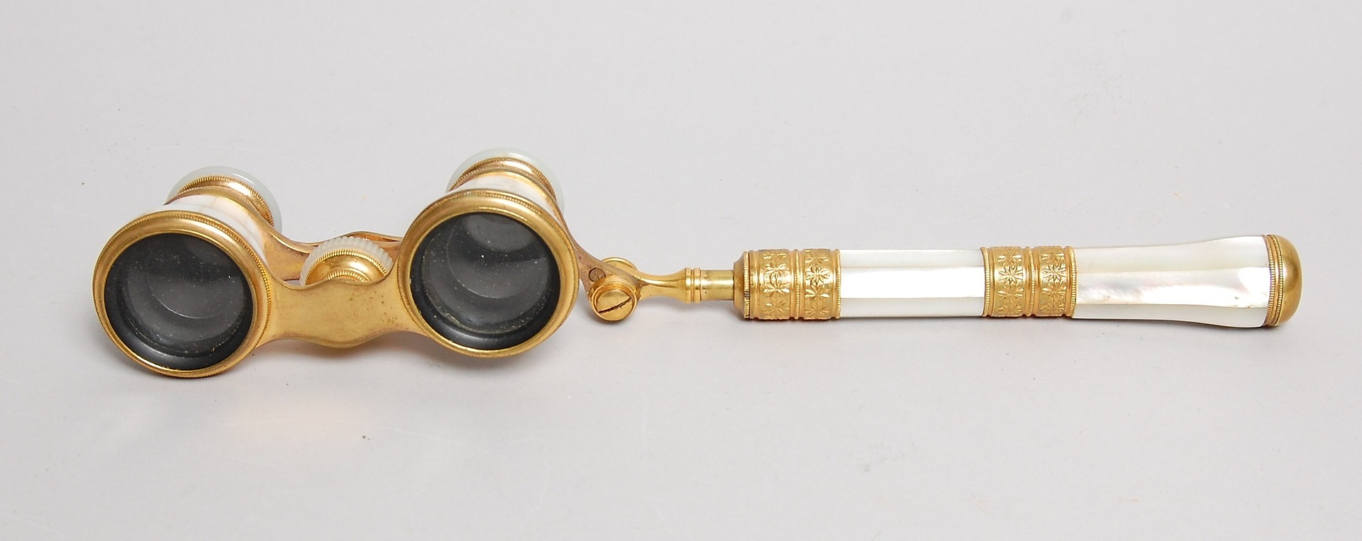 123401. TEATER kikkert, perlemor, messing, 20. århundrede.