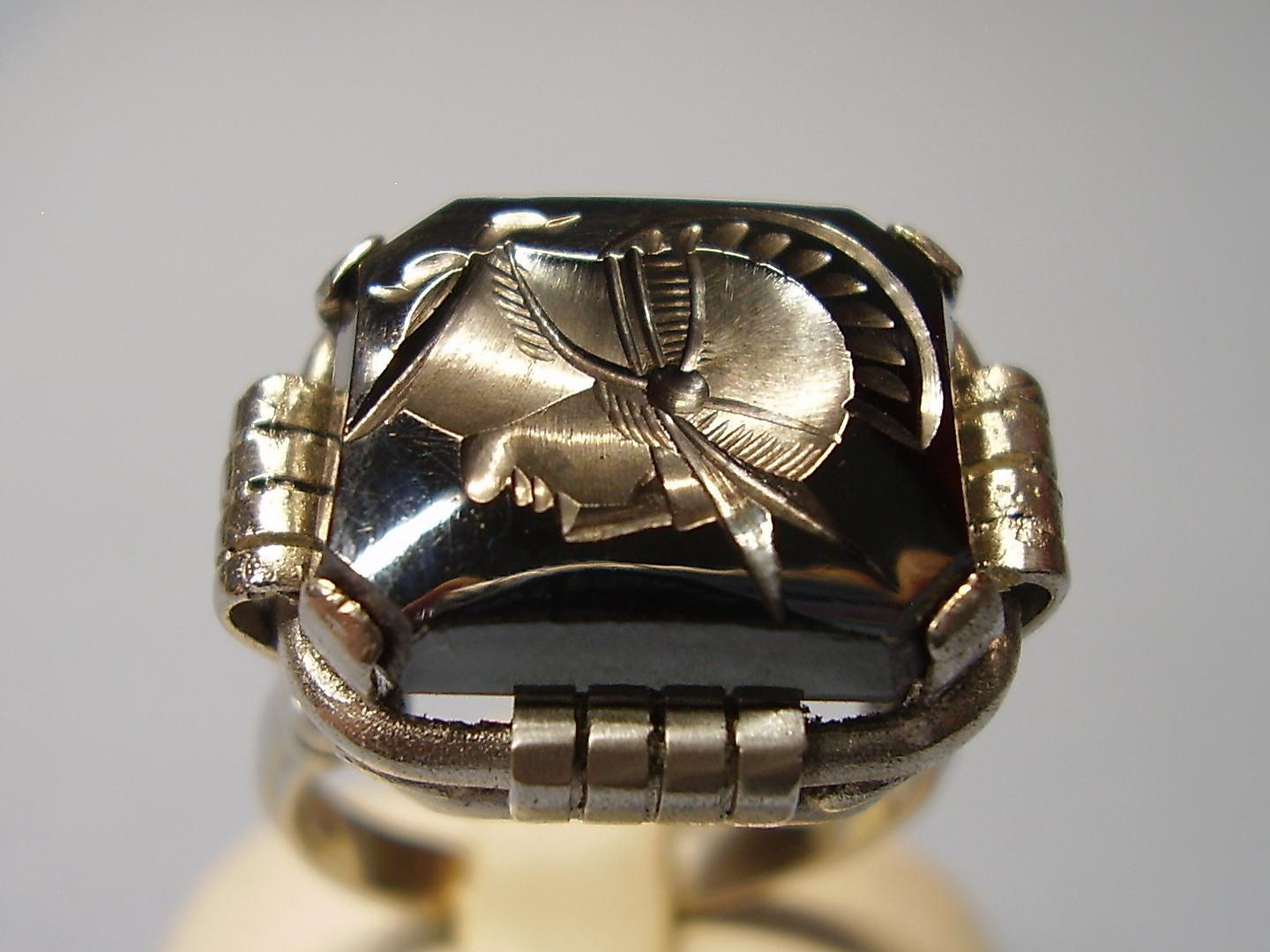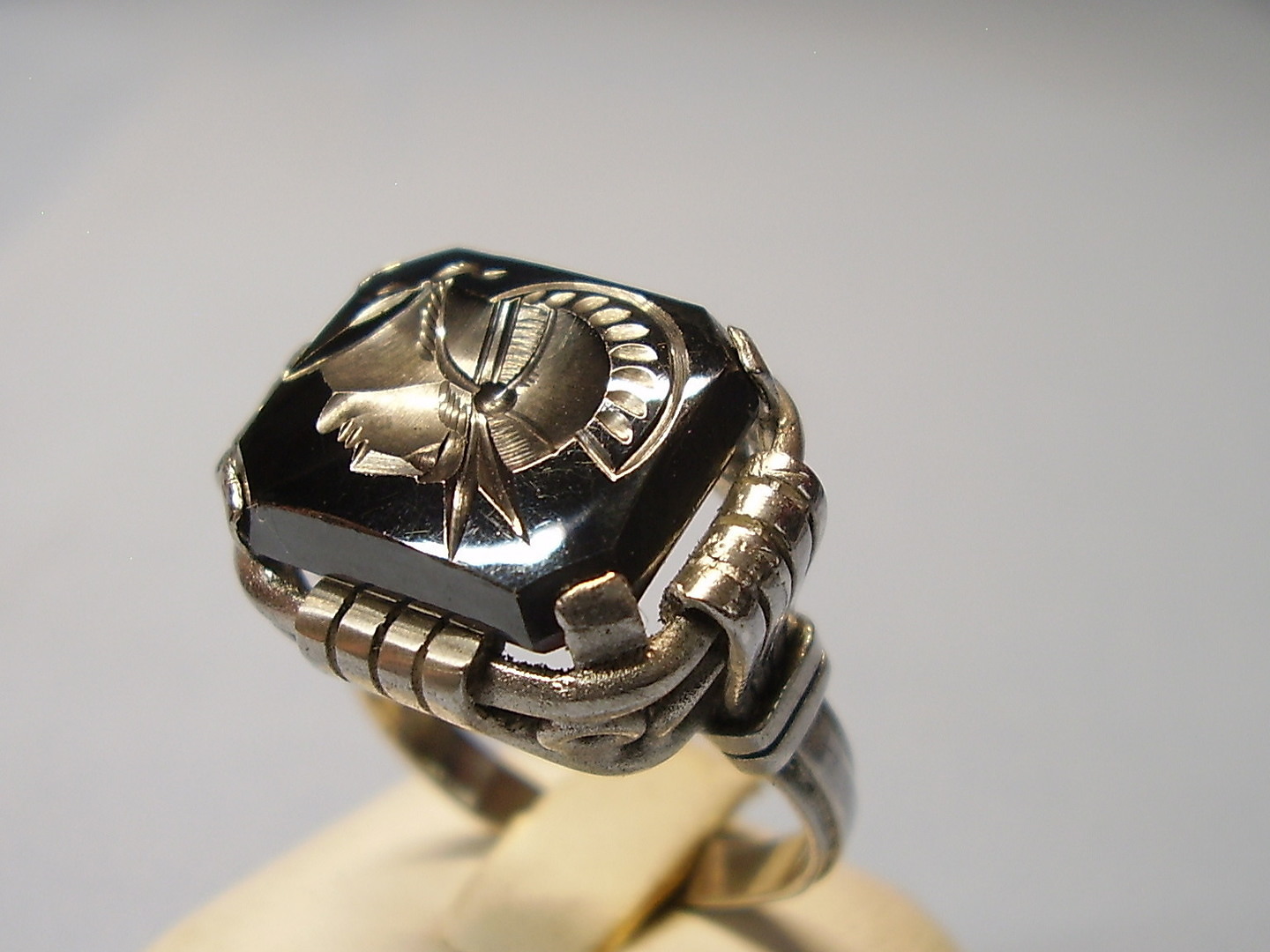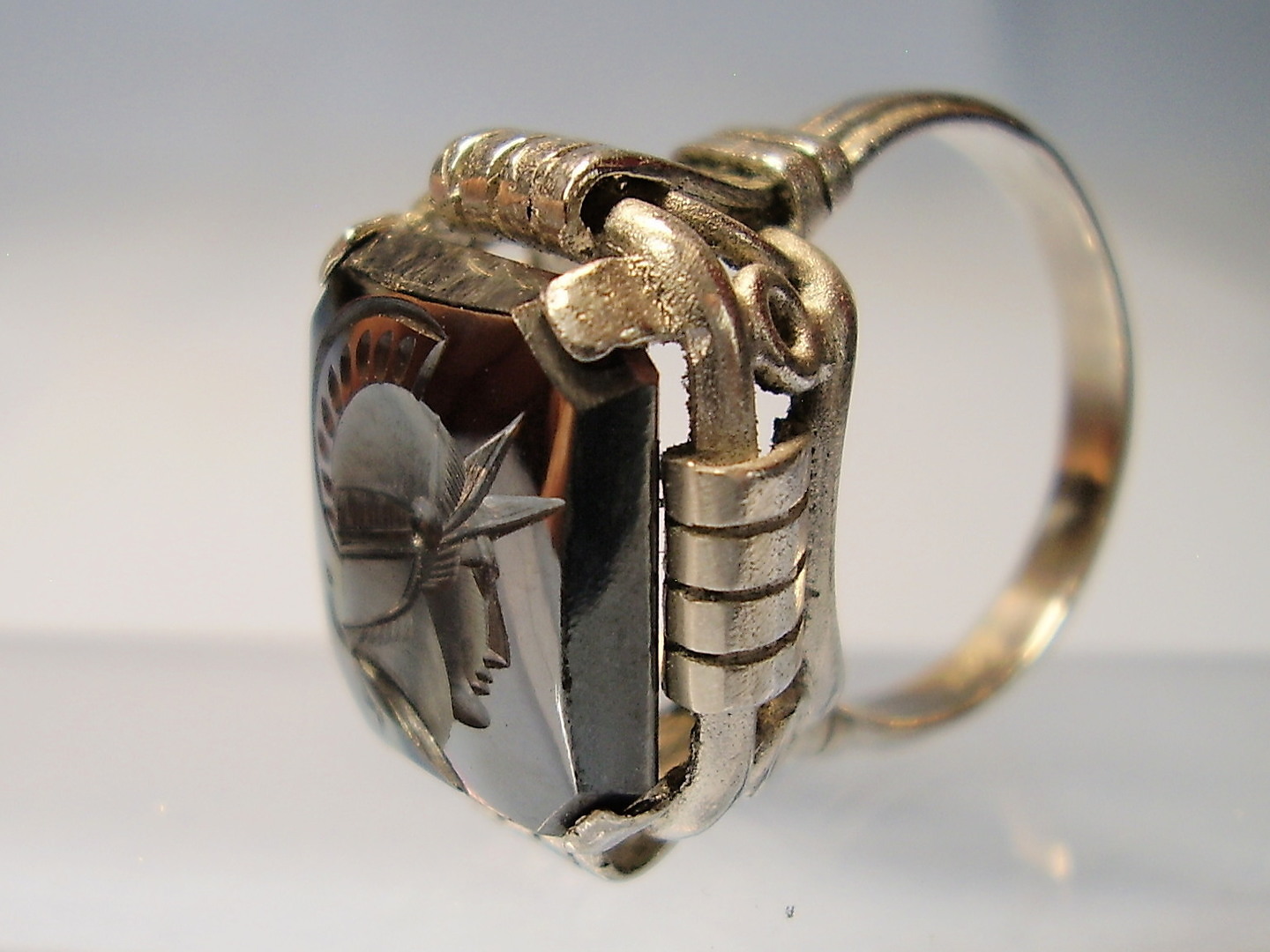 1237382. ANTIK HEMATITRING GRAVERET KRIGERHOVED.