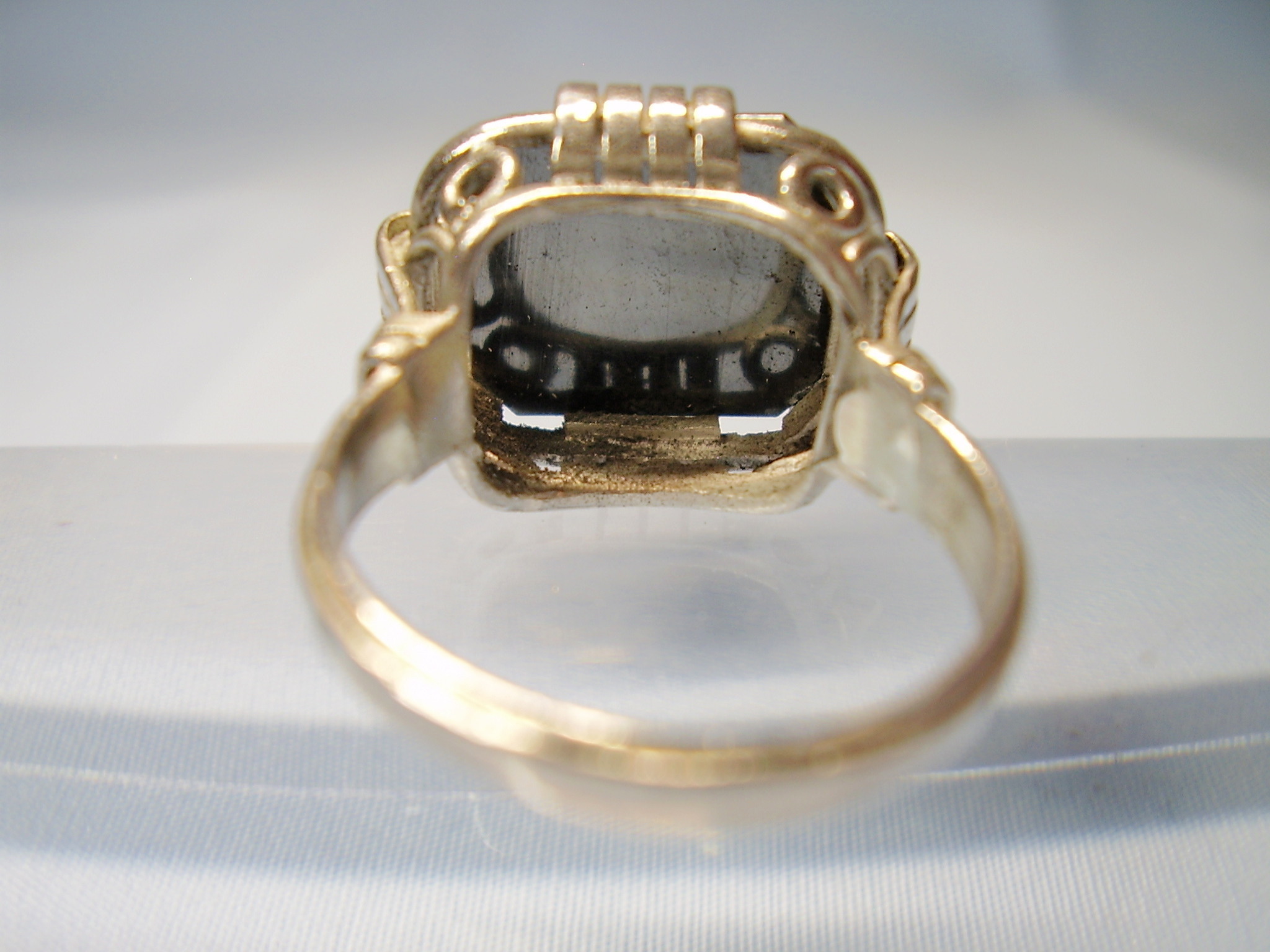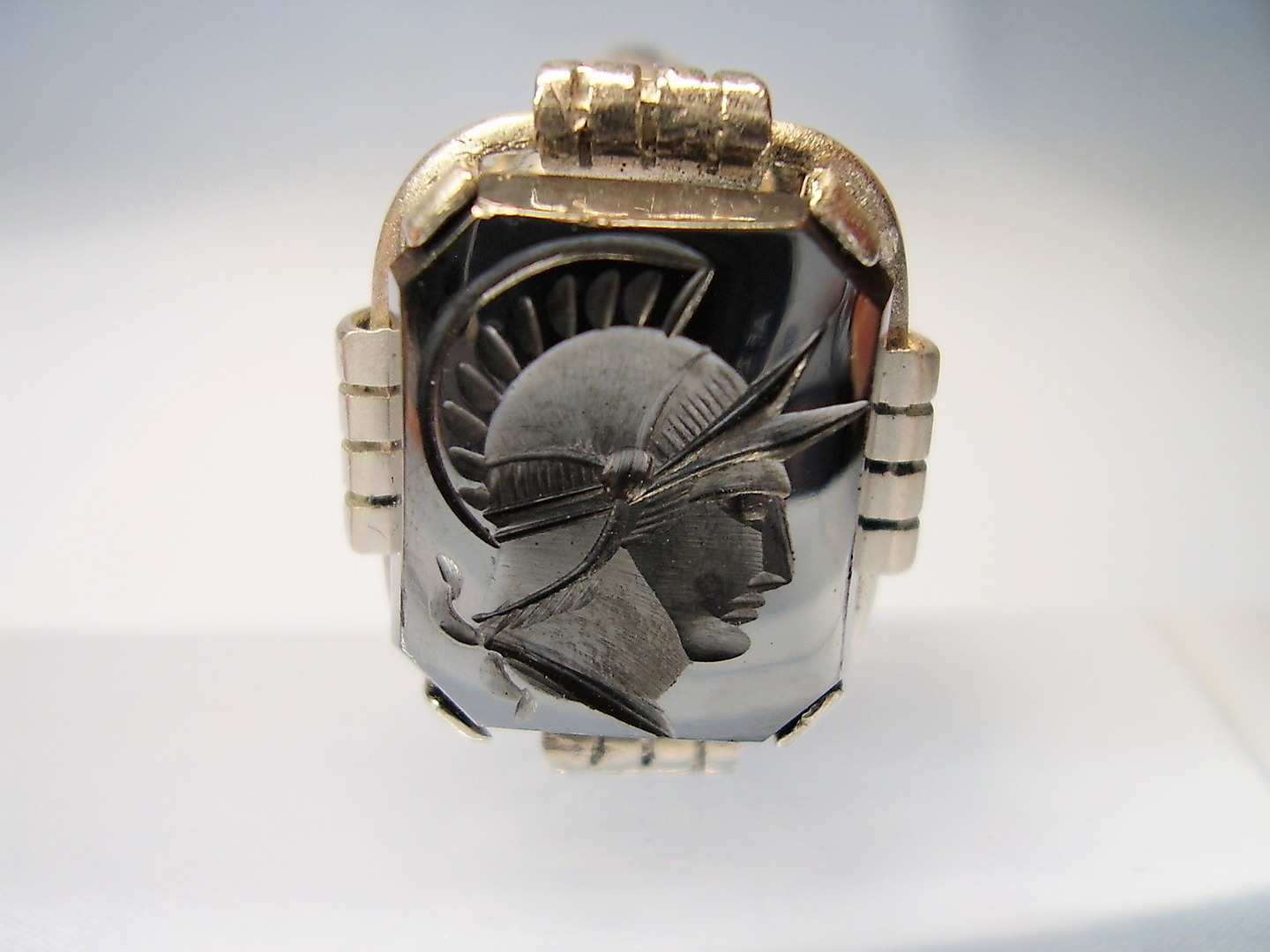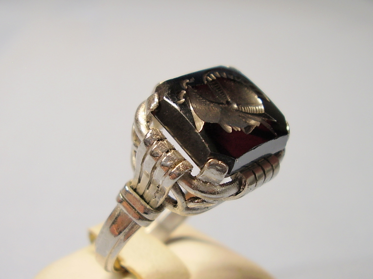 1237382. ANTIK HEMATITRING GRAVERET KRIGERHOVED.