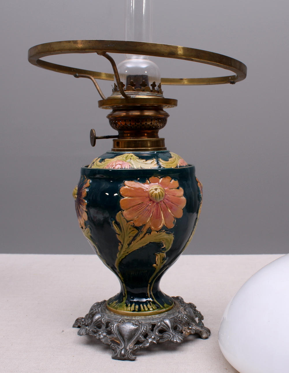 Petroleumslampe, Art Nouveau, majolika, metalfod, højde 54 cm.