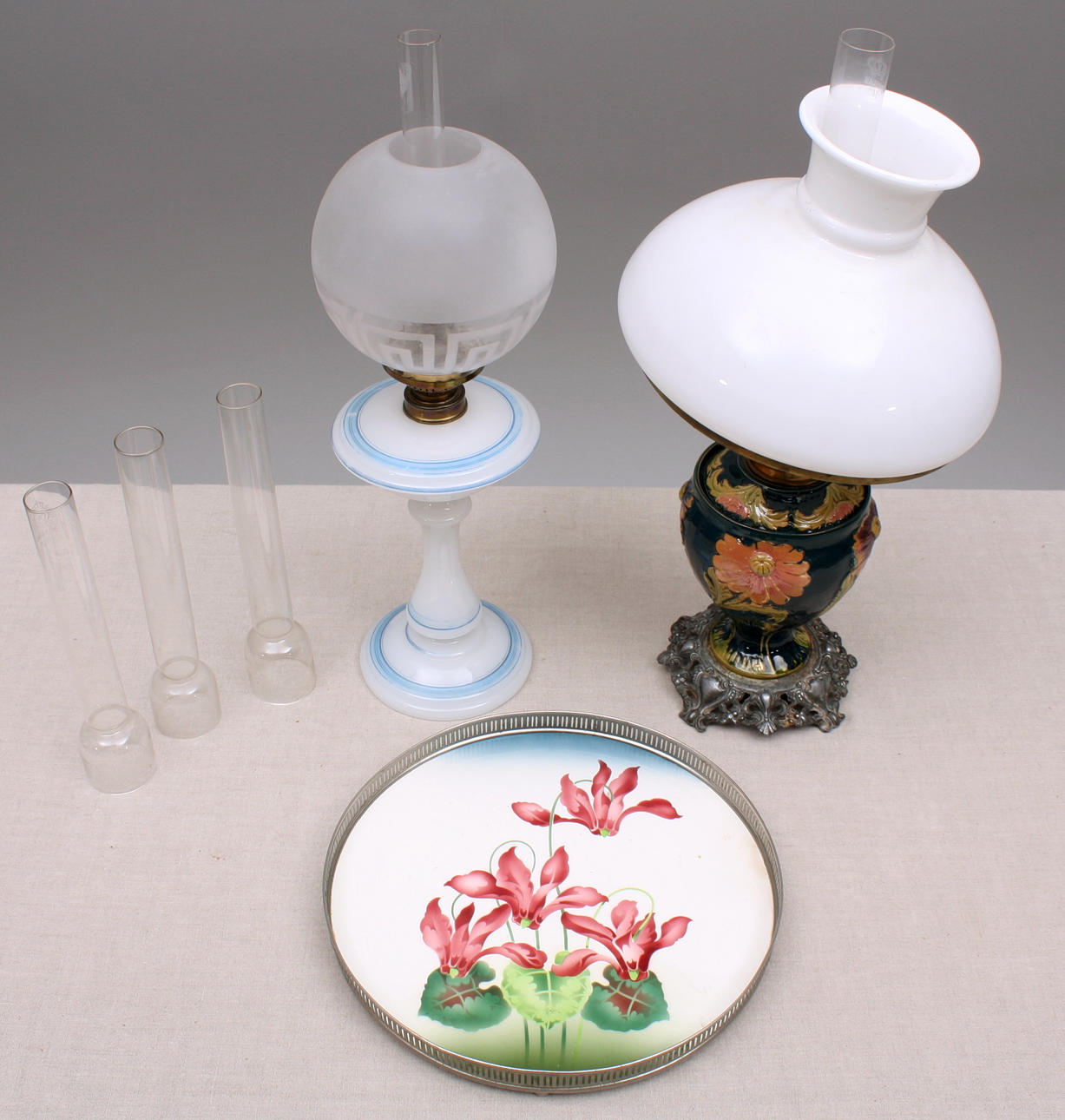 Petroleumslampe, ca. 1920, hvidt glas med blå striber, glasafdækning med meandermønster, højde 52 cm.