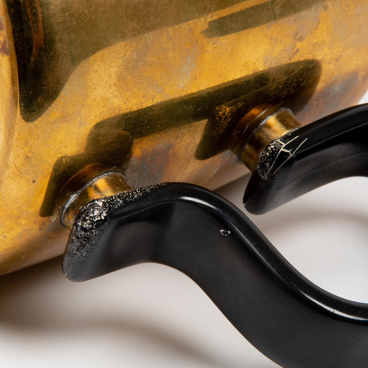 Overfladeslitage og håndtaget med varmeskader.