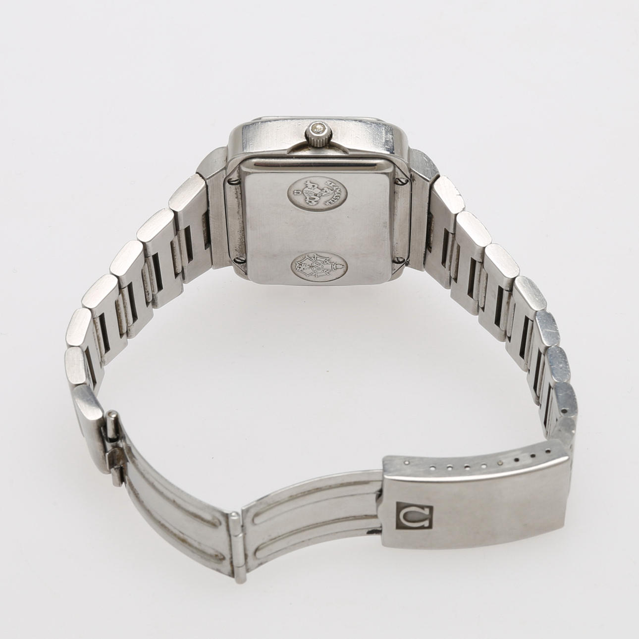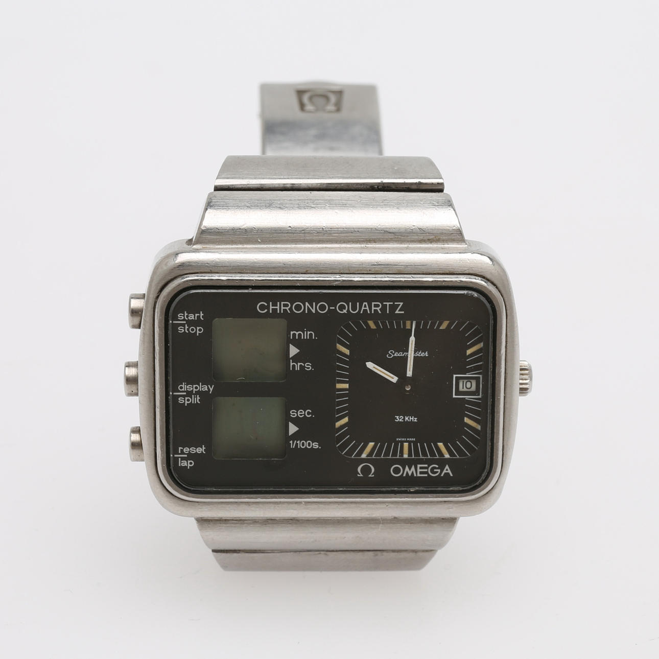 1970'erne, stål, safirglas, quartz urværk, datovisning, kronograf, original stålled med foldespænde, urkassestørrelse ca 46x33 mm.