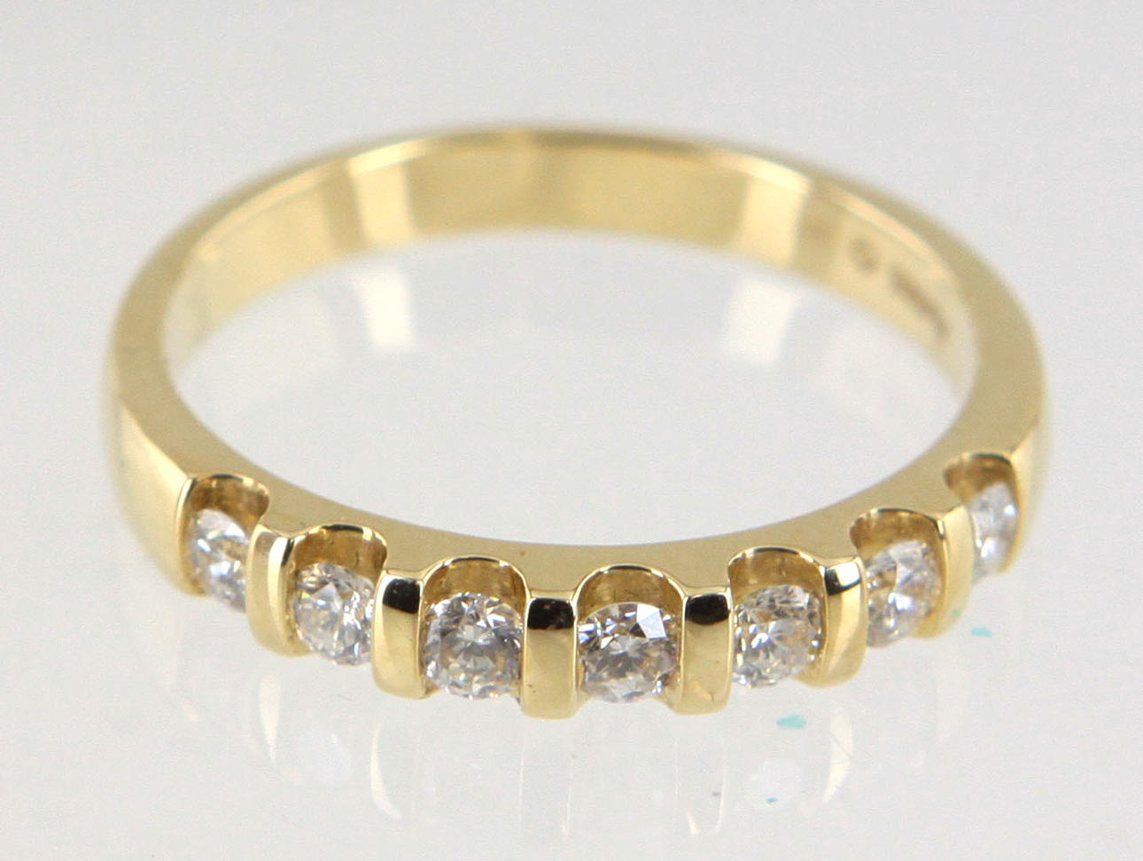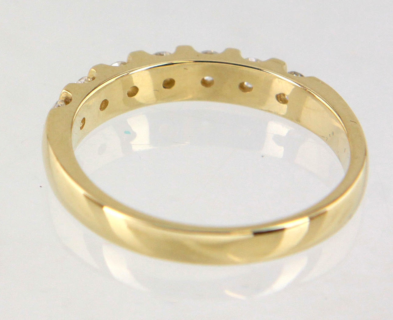 Eksklusiv diamantring lavet af 585 (14 karat) gult guld, ringbånd besat med 7 diamanter på i alt 0,5 karat, ringstørrelse 6, vægt 4 gram.