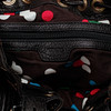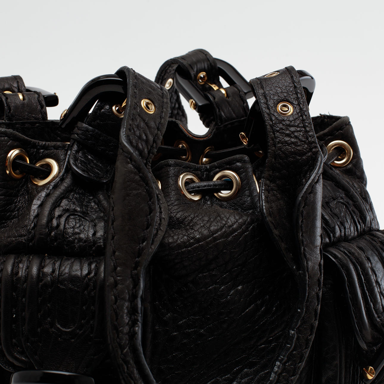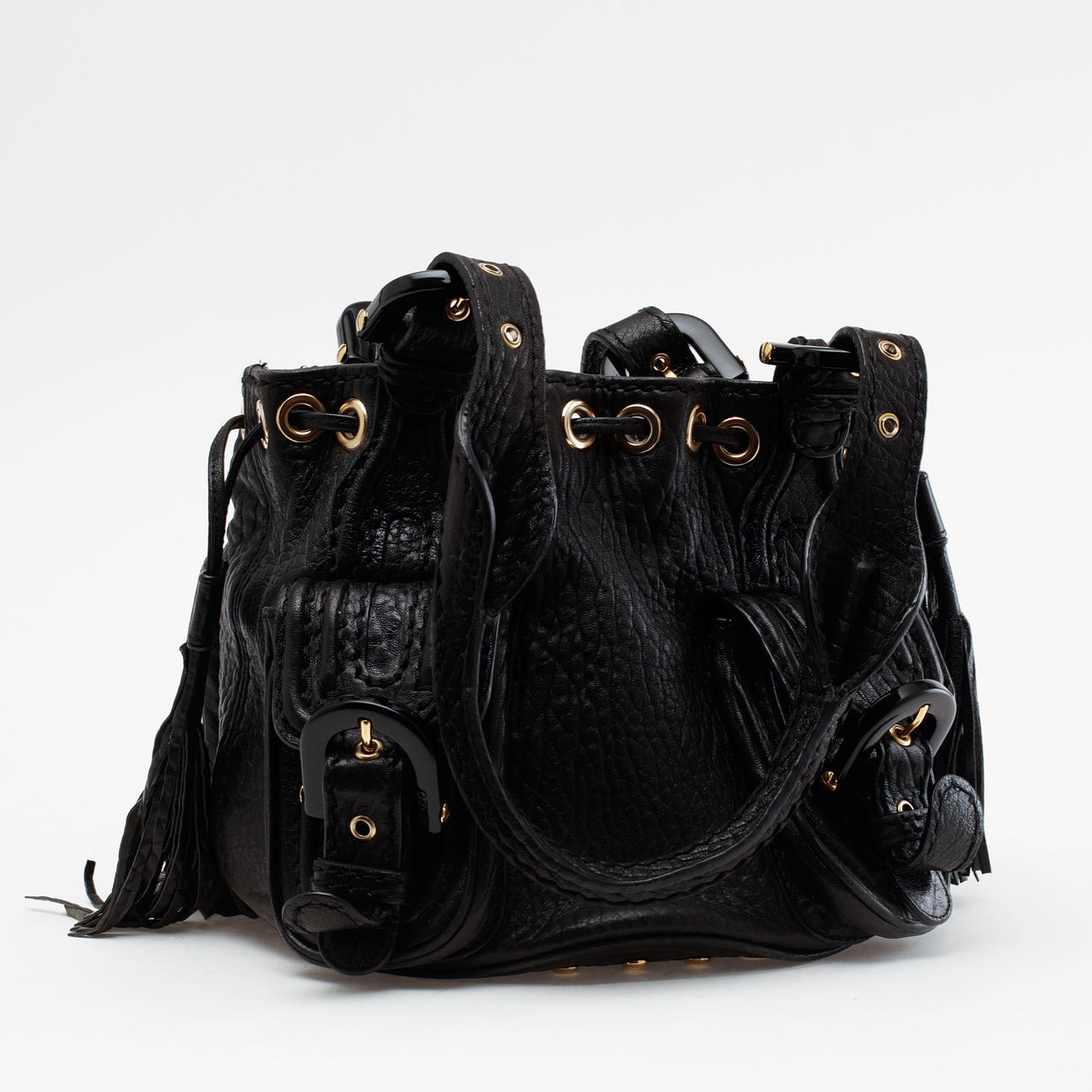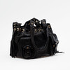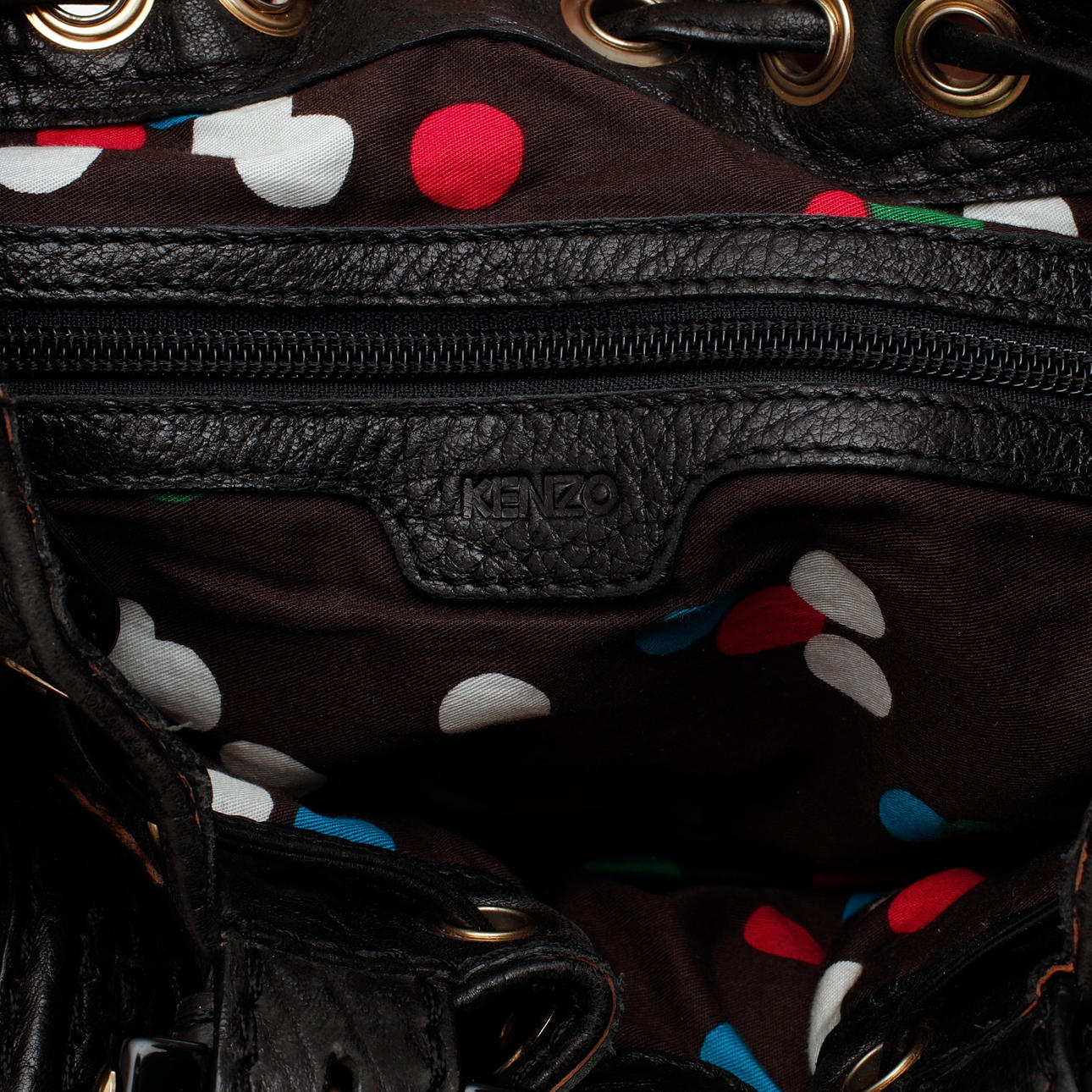 Taske i læder med detaljer i gult metal og bakelit. Fire udvendige lommer. En inderlomme med lynlås og tre små rum. Mærket "Kenzo". foret i tekstil. Støvpose medfølger.