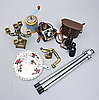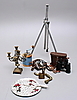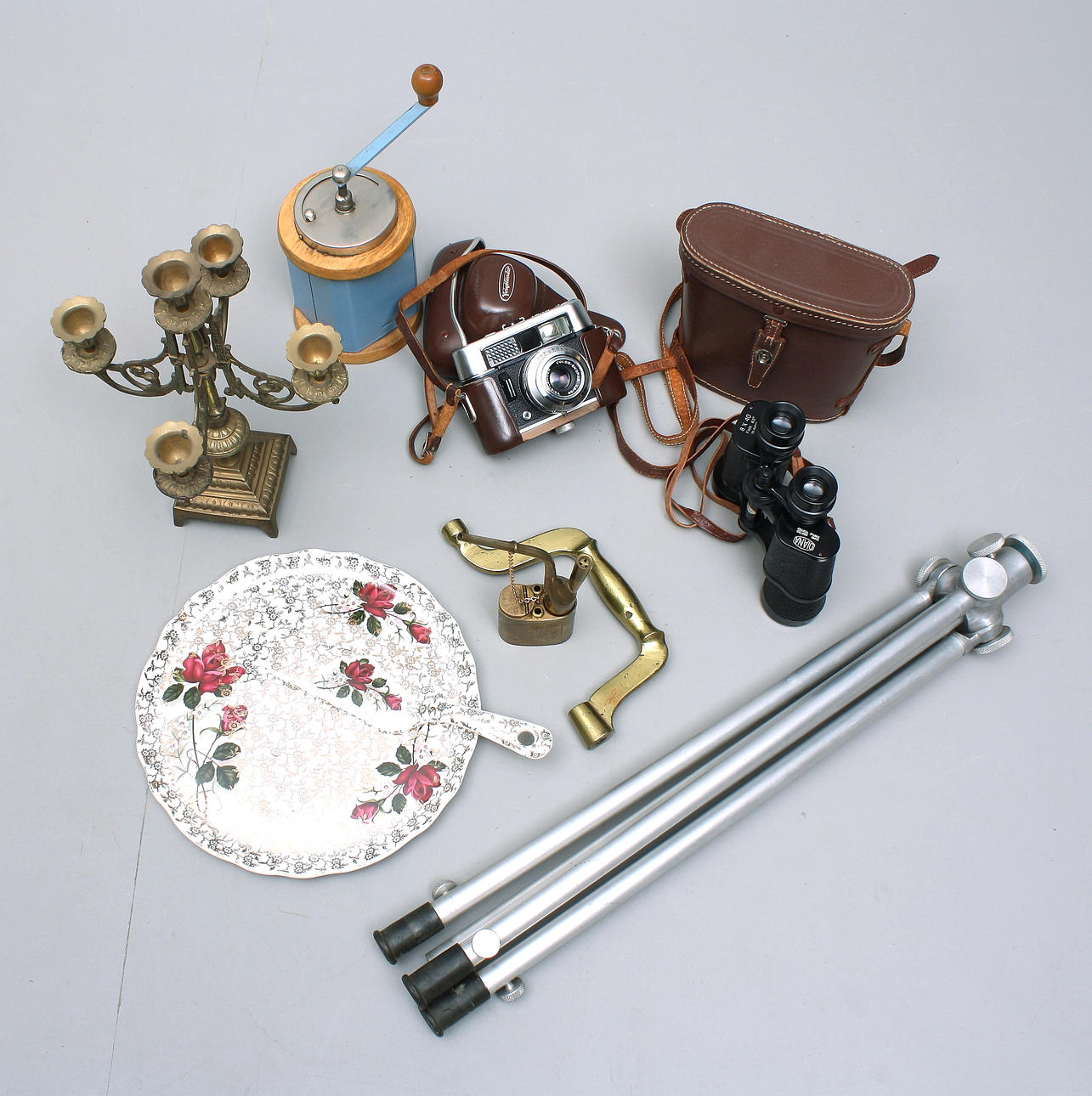 Kikkert i lædertaske, Kamera i læderetui. Stativ, aluminium. Kandelaber til fem stearinlys, messing, højde 30 cm. Kagetallerken med kagespatel "Old Foley", diam 27 cm. Kaffekværn, træ og metalplade. Oliekande, messing. Drejeligt borehåndtag, messing.