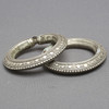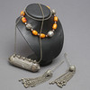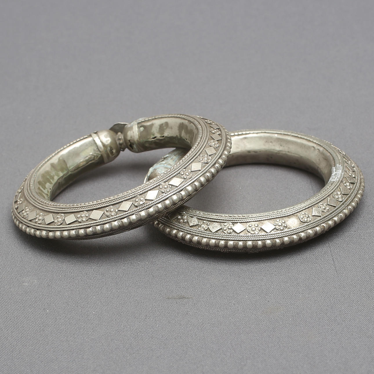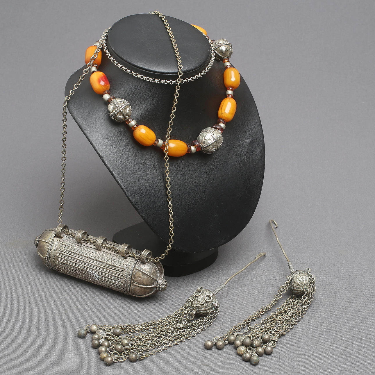 4 armbånd, hvoraf det ene er åbent, indvendig bredde ca 5 - 6,5 cm 1 halskæde, åben model, indvendig bredde ca 10,5 cm 2 øreringe 1 beholder / taske 1 kostumesmykke 1 halskæde, længde ca 70 cm Totalvægt ca. 628 gram.