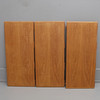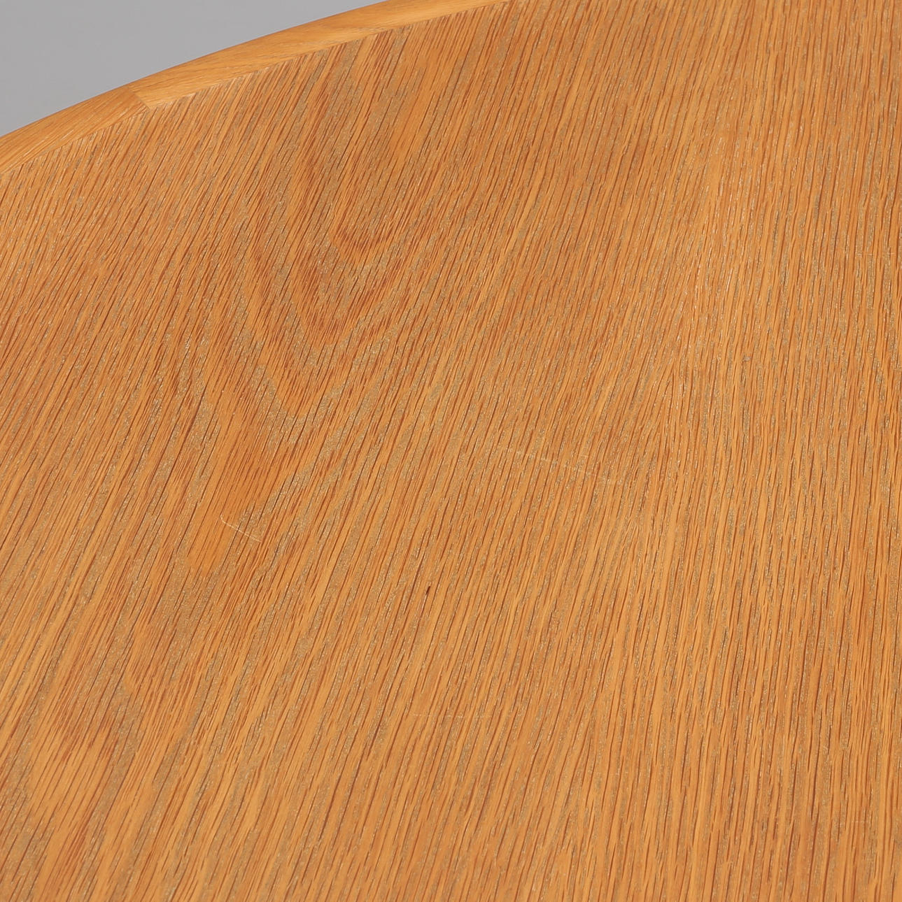 Egetræ. Plaquemærket og mærket med dansk kontrolstempel. Tre indsatsbrædder, hvoraf den ene har 50 cm kant. Sammenklappeligt støtteben. Diameter 114 cm. Højde 73 cm.